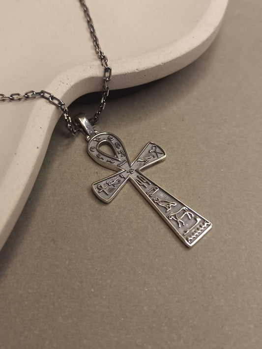 Hiyeroglif İşlemeli Gümüş Ankh Kolye