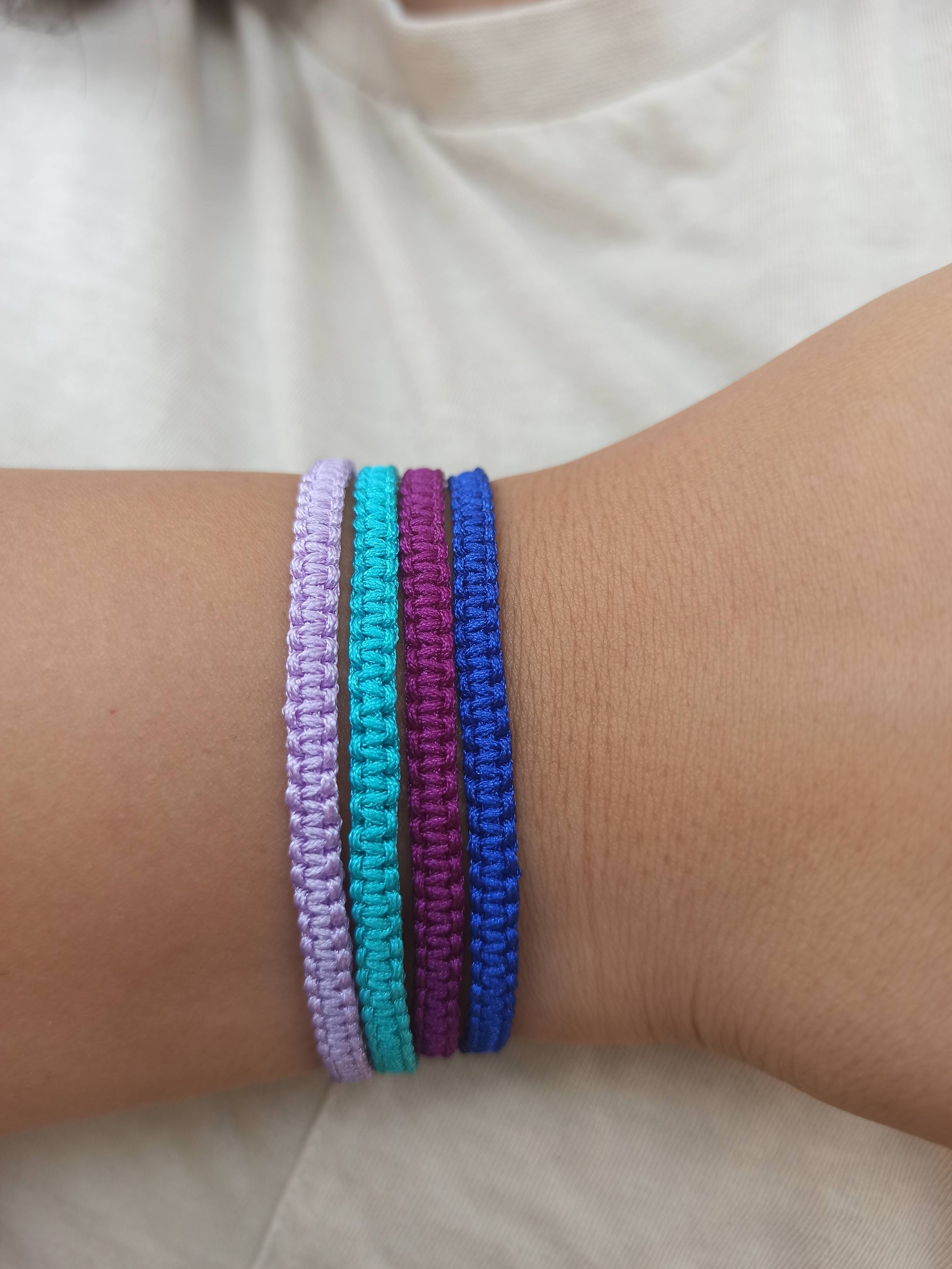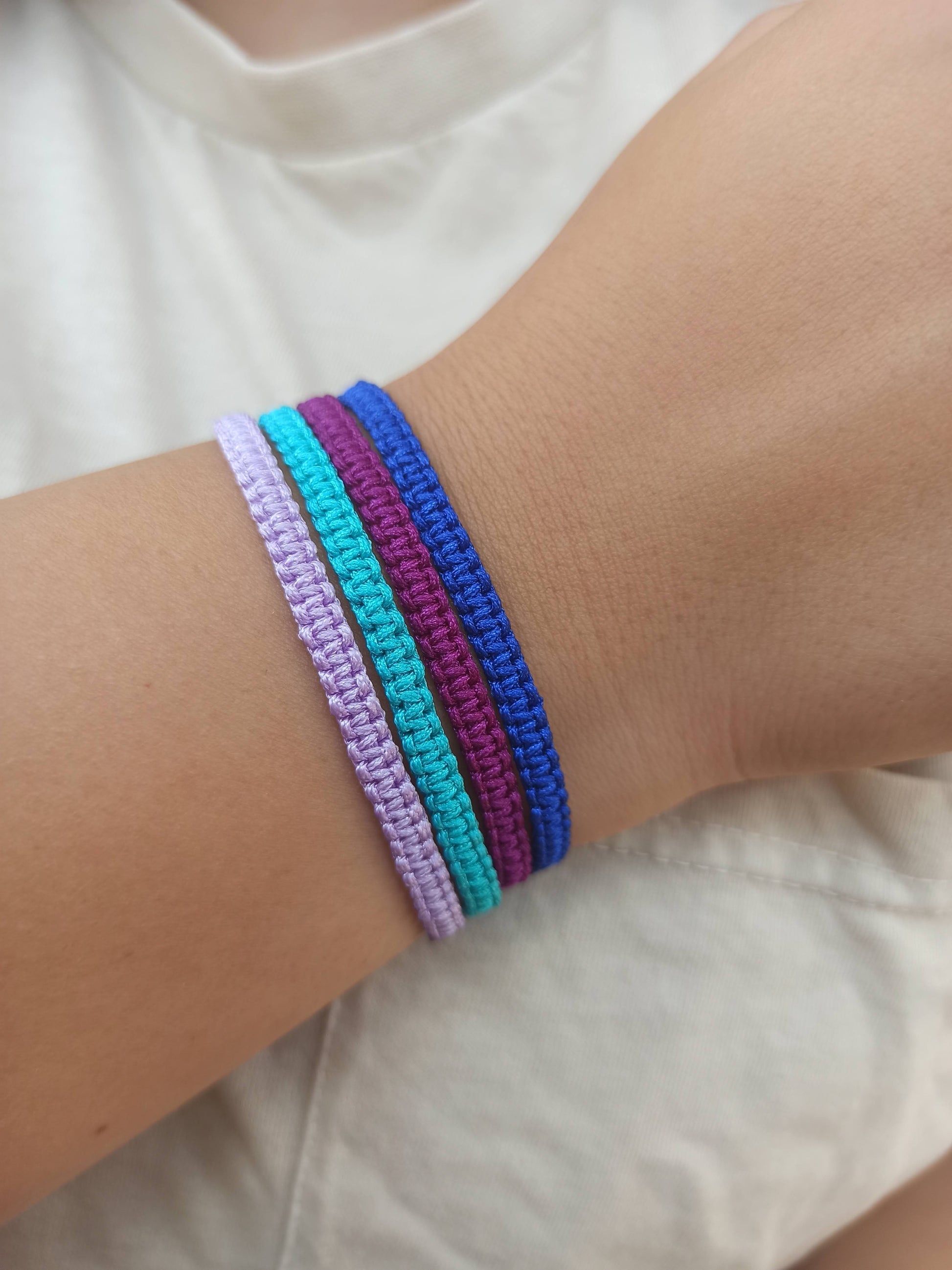 1 adet lila ipli , 1 adet turkuaz ipli, 1 adet mor ipli , 1 adet mavi ipli makrome bileklik.
