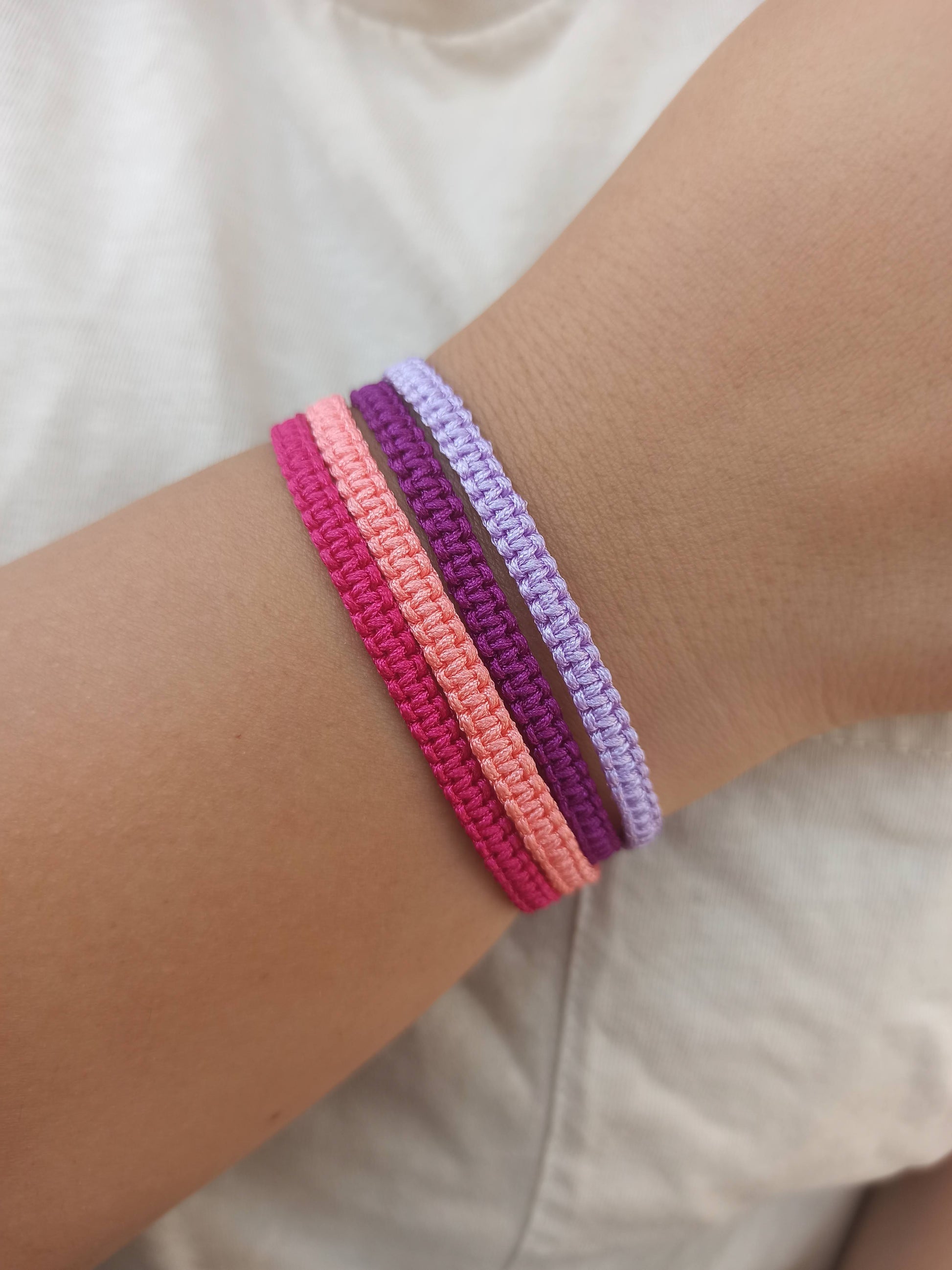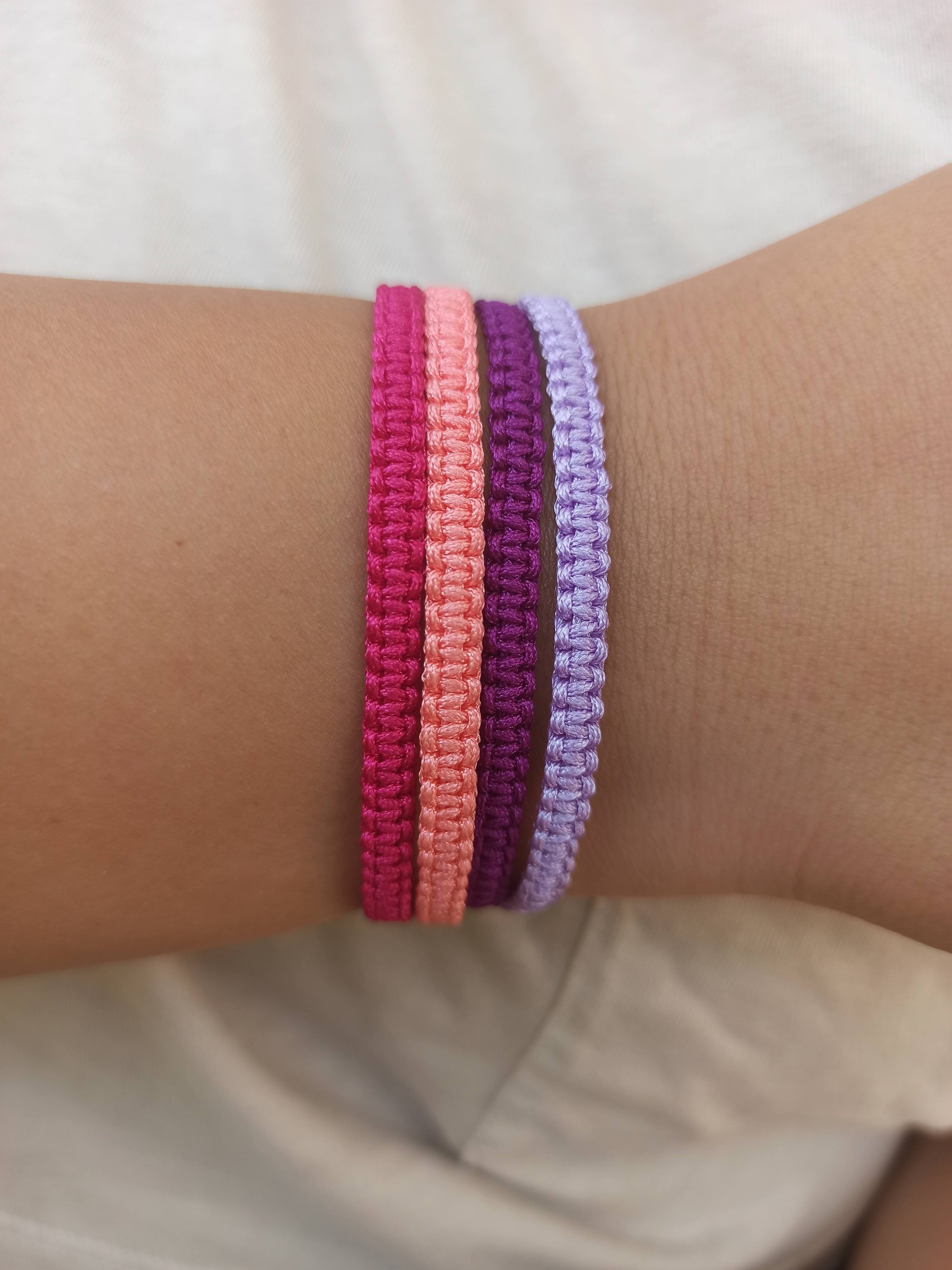 1 adet fuşya ipli , 1 adet açık pembe ipli, 1 adet mor ipli , 1 adet lila ipli makrome bileklik.