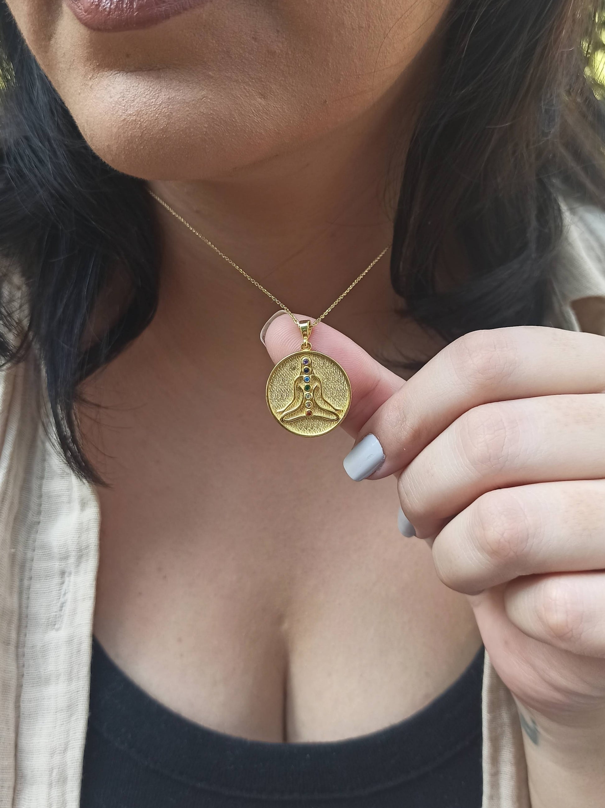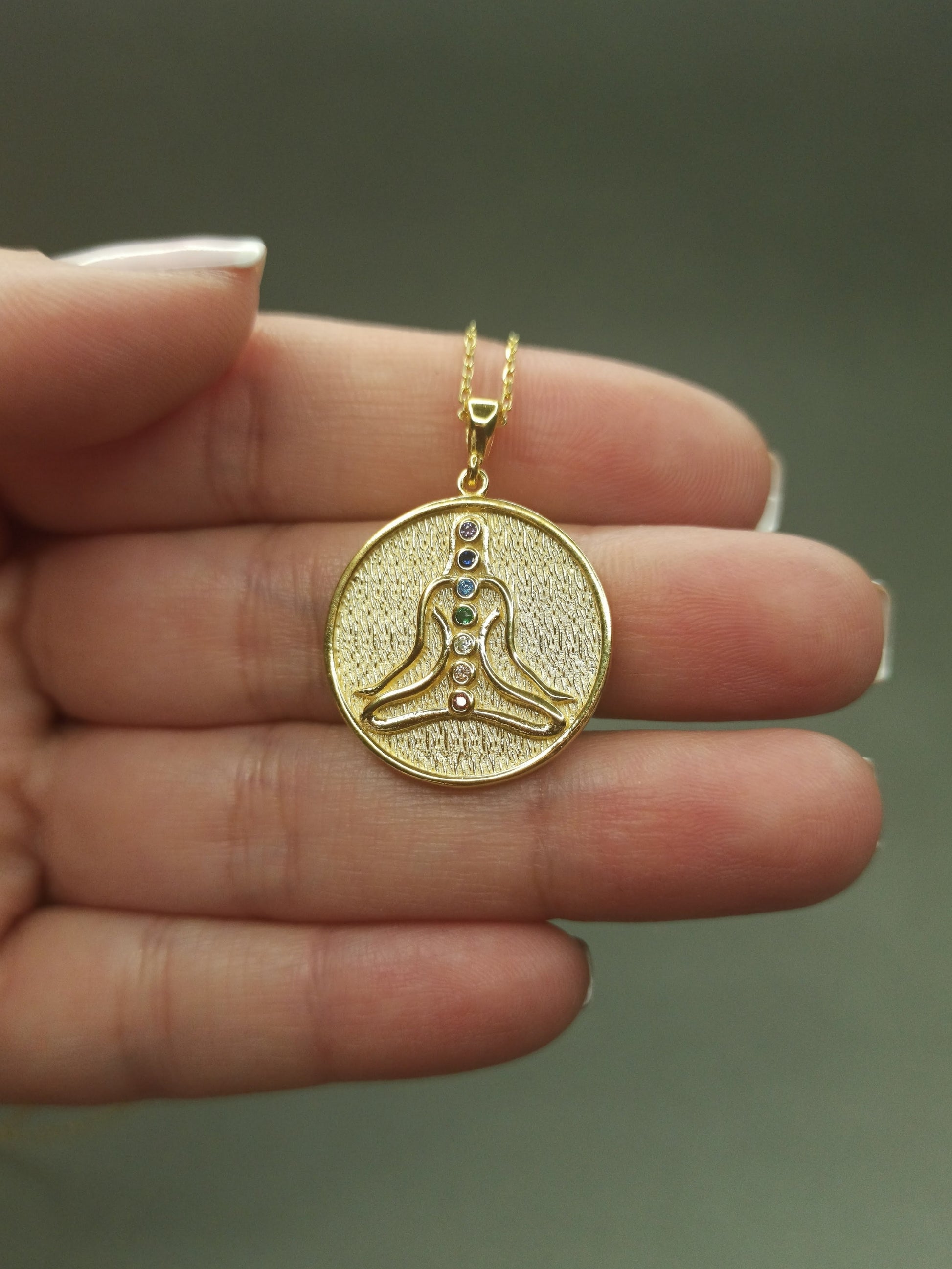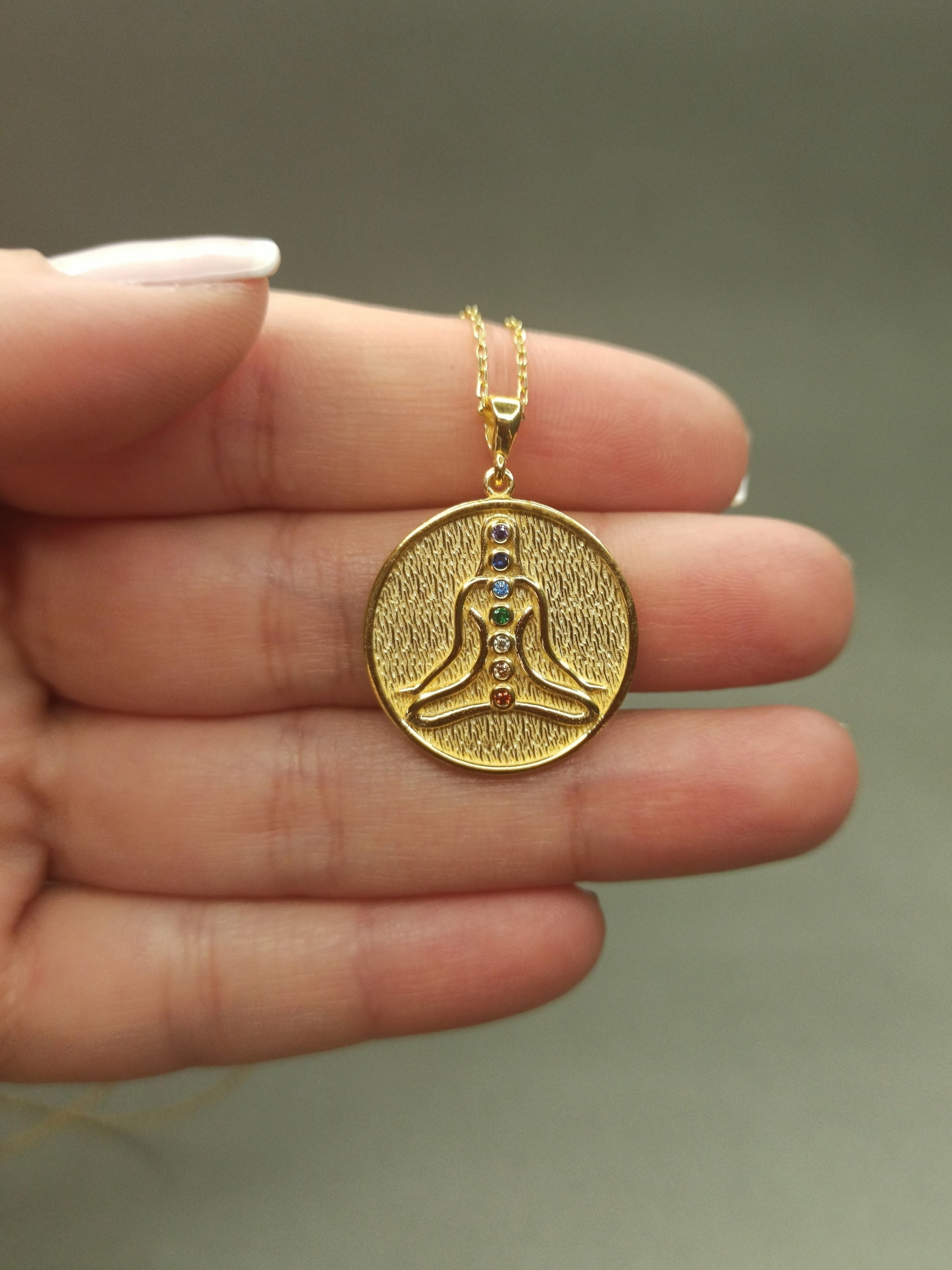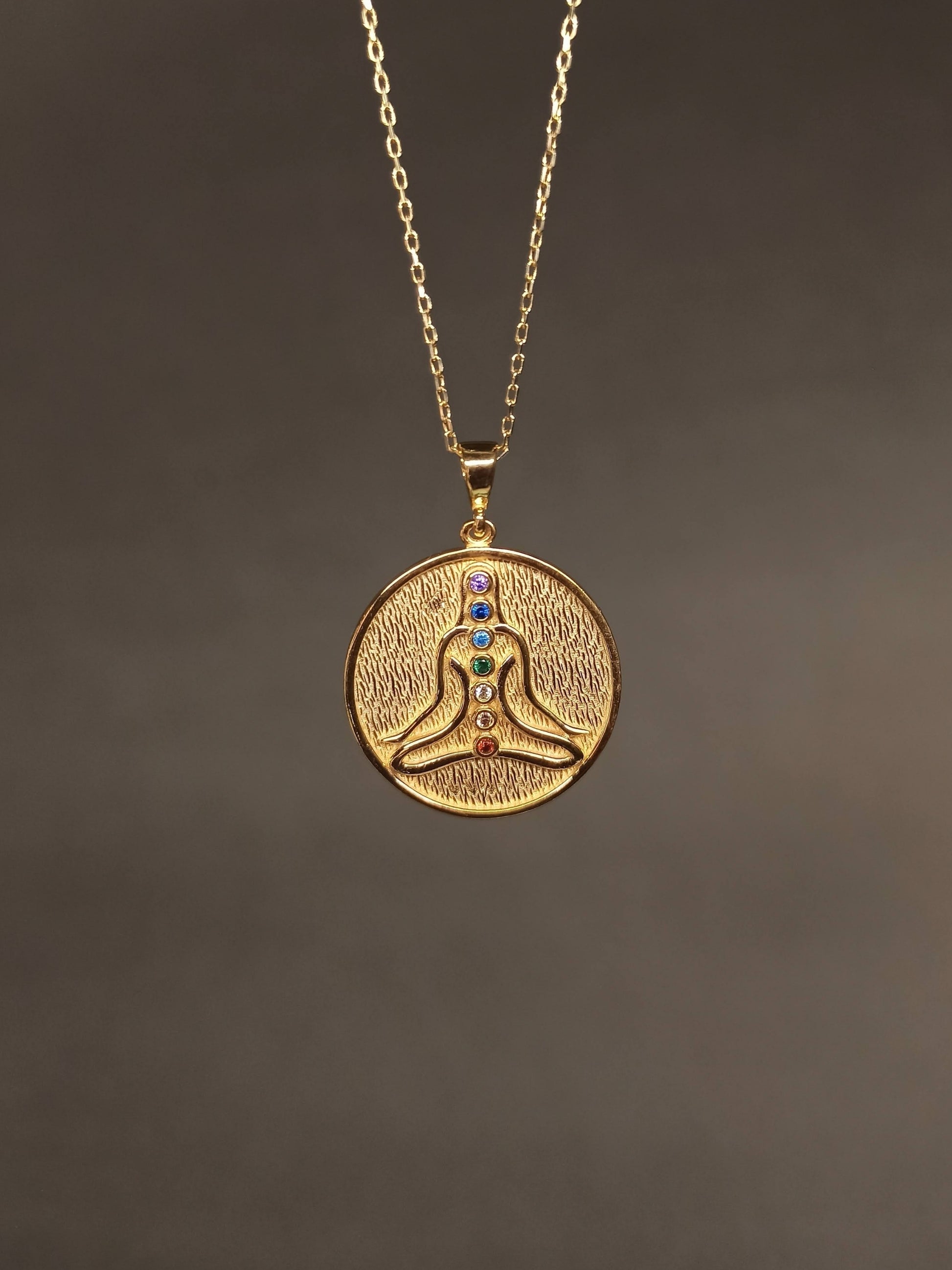 - İç Huzurunuzun Sembolü. Bu özel tasarım Çakra Taşlı Meditasyon Madalyon, bedenin ve ruhun dengesini temsil eder. Figürün üzerinde dikey olarak sıralanan 7 farklı renkli çakra taşı, enerji merkezlerinizi temsil ederek gün boyu denge ve pozitif titreşim yaymanıza yardımcı olur. Dokulu altın kaplama madalyon yüzeyi, tasarıma otantik ve mistik bir derinlik katar.
