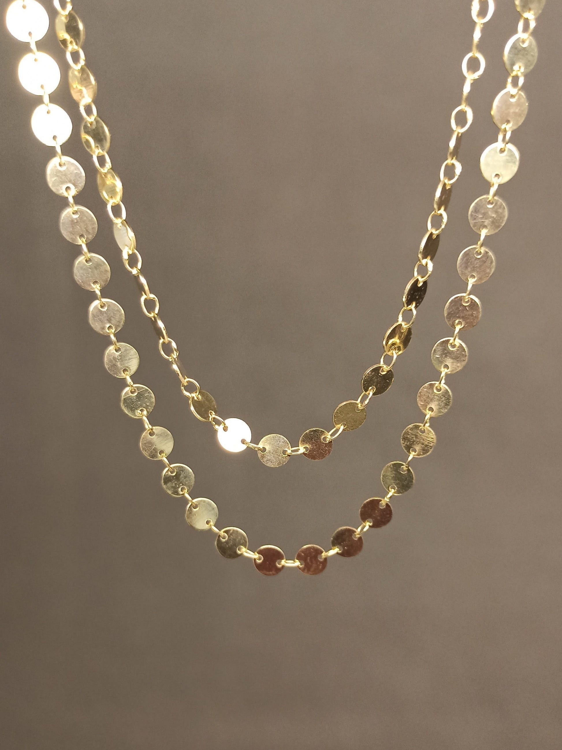 Gündüzden Geceye Mükemmel Parıltı. Şu anın en popüler aksesuar trendlerinden biri olan pullu zincir kolyelerle tanışın. Zarif ve küçük disk detayları, her hareketinizde ışığı yakalayarak size dinamik bir ışıltı katar. 90 cm uzunluğu sayesinde bu kolyeyi tek bir uzun parça olarak ya da fotoğraftaki gibi çift sıra (layering) yaparak farklı stillerde kullanabilirsiniz. Minimalist giysilere dahi anında şıklık katmanın en kolay yolu!
