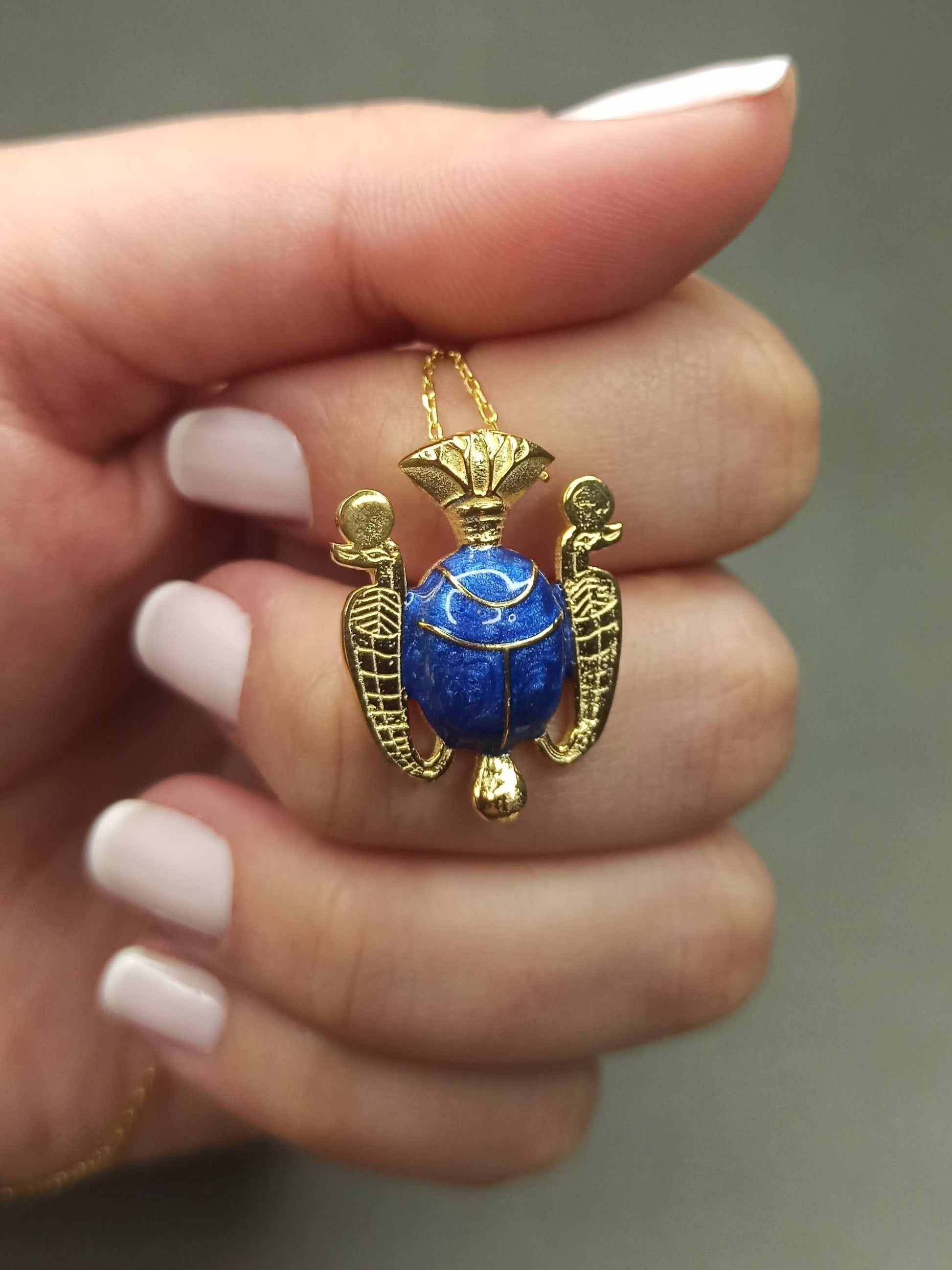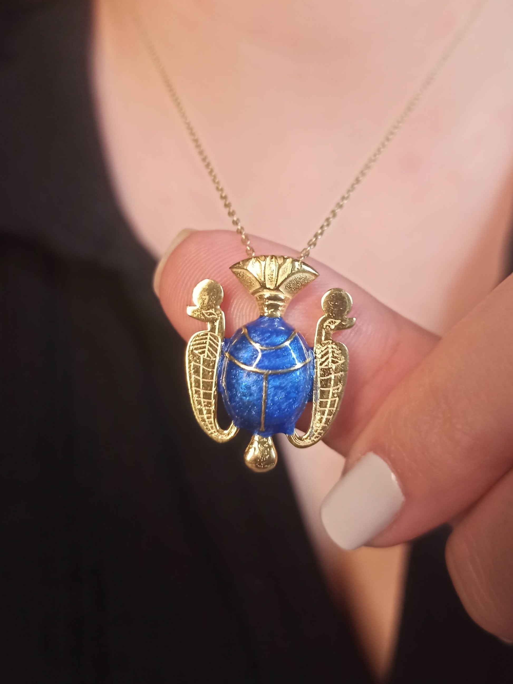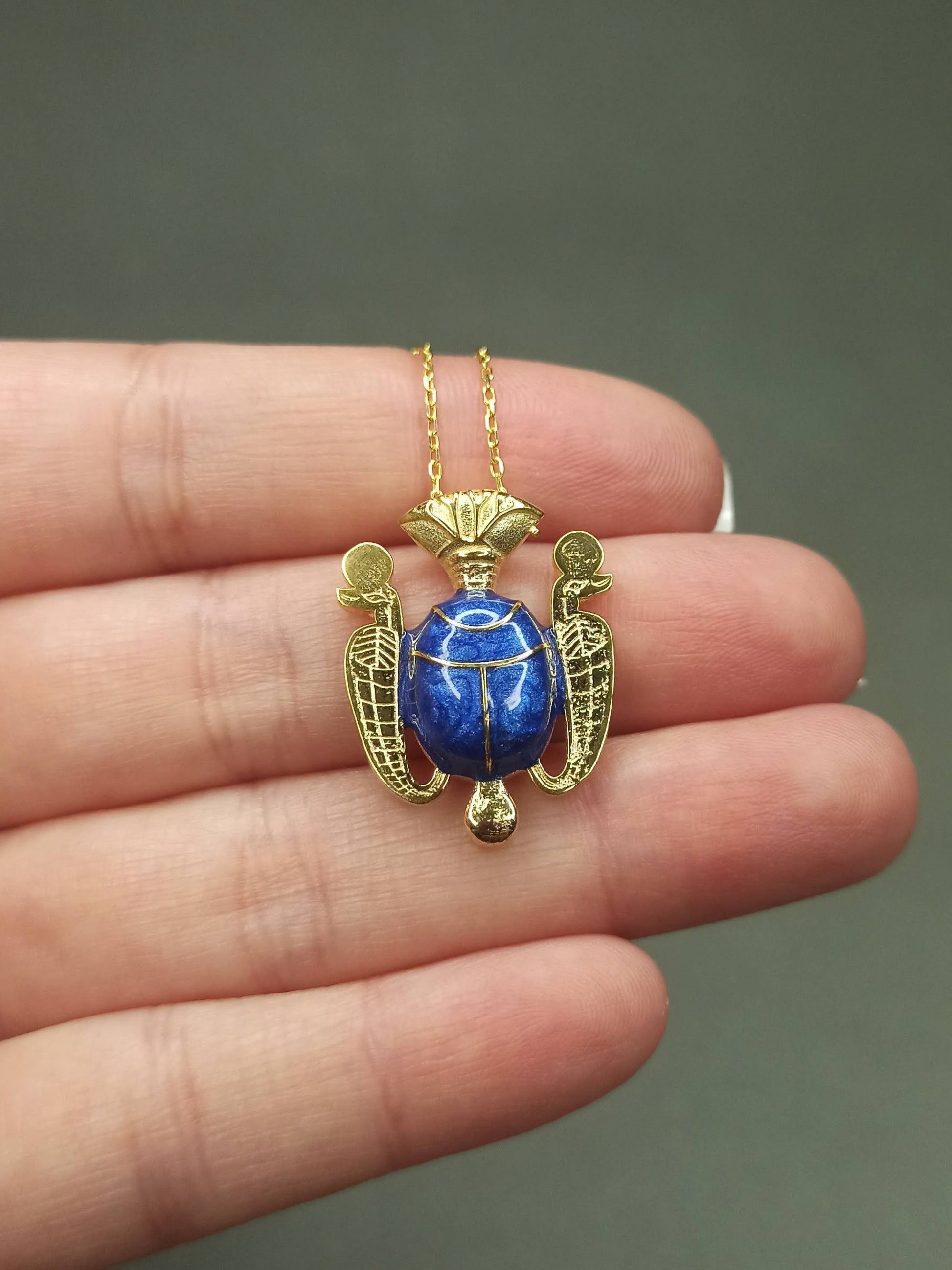 Bu Mısır böceği (scarab) kolye, Antik Mısır kültürünün en güçlü tılsımlarından birini modern bir sanat eseri gibi yeniden yorumluyor.