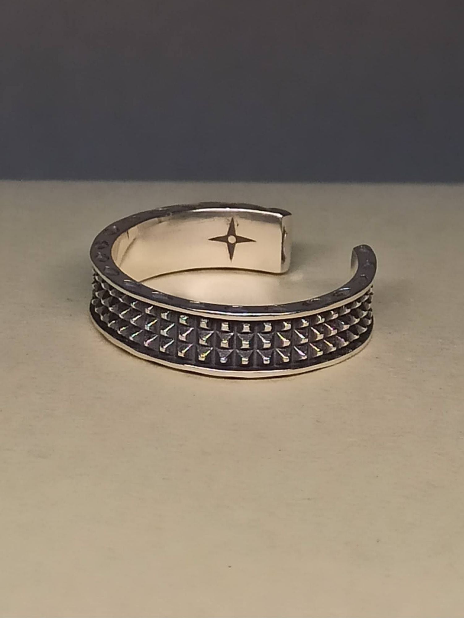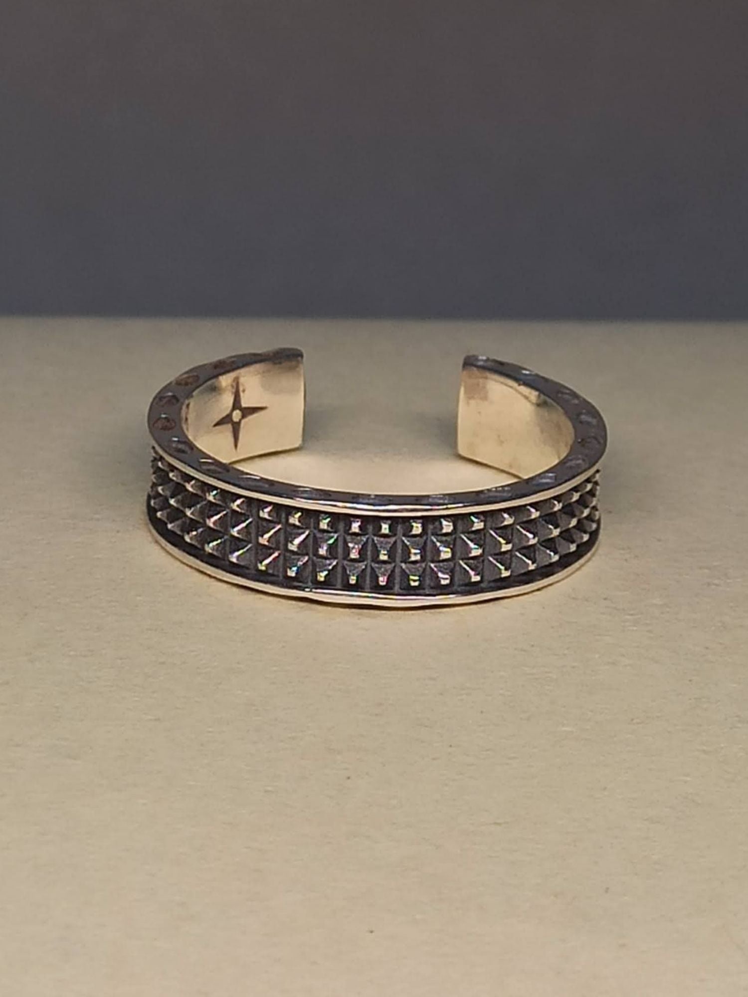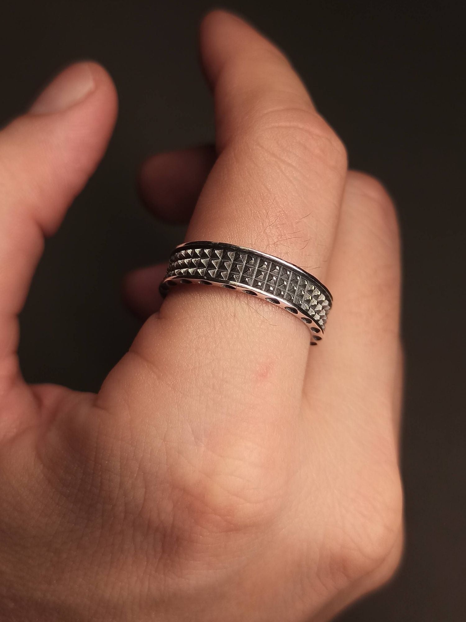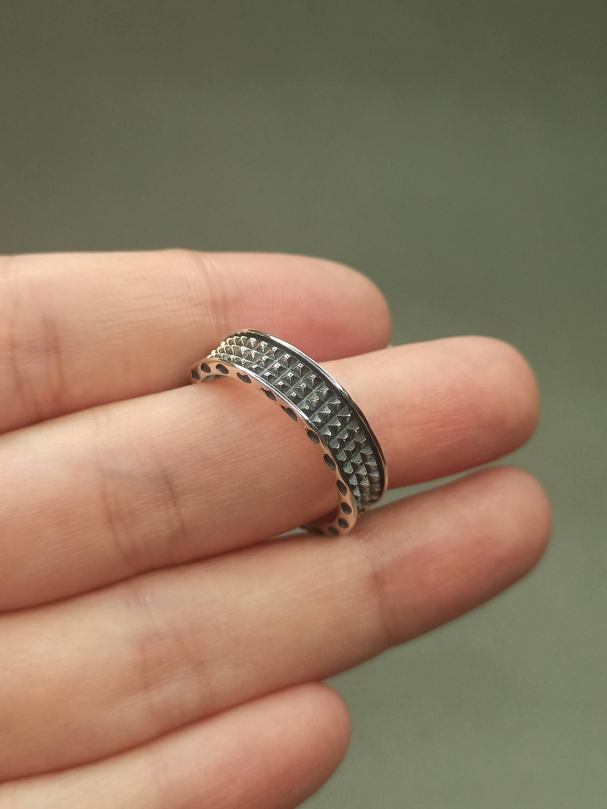 Sınırları zorlayan ve cesur bir stil arayanlar için tasarlanmış bu Diken Motifli Yüzük, enerjisi yüksek, iddialı bir parçadır. Yüzük bandı, derin ve karanlık bir görünüm için oksitlenmiş 925 Ayar Gümüşten yapılmış ve iki sıra halinde keskin diken veya piramit çivi motifleriyle bezenmiştir. Yüzüğün iç kısmında yer alan gizli yıldız detayı, gücünüzün karanlıkta bile parladığını sembolize eder.