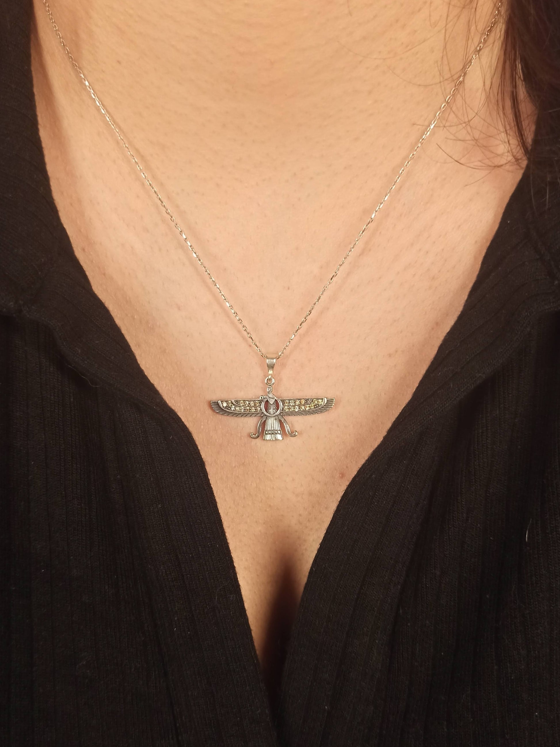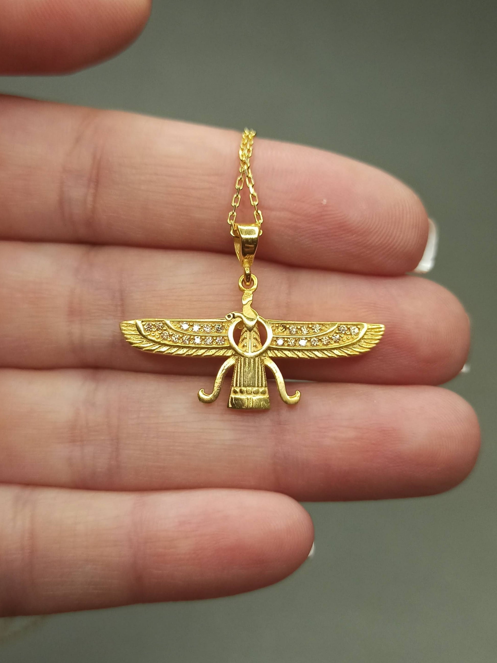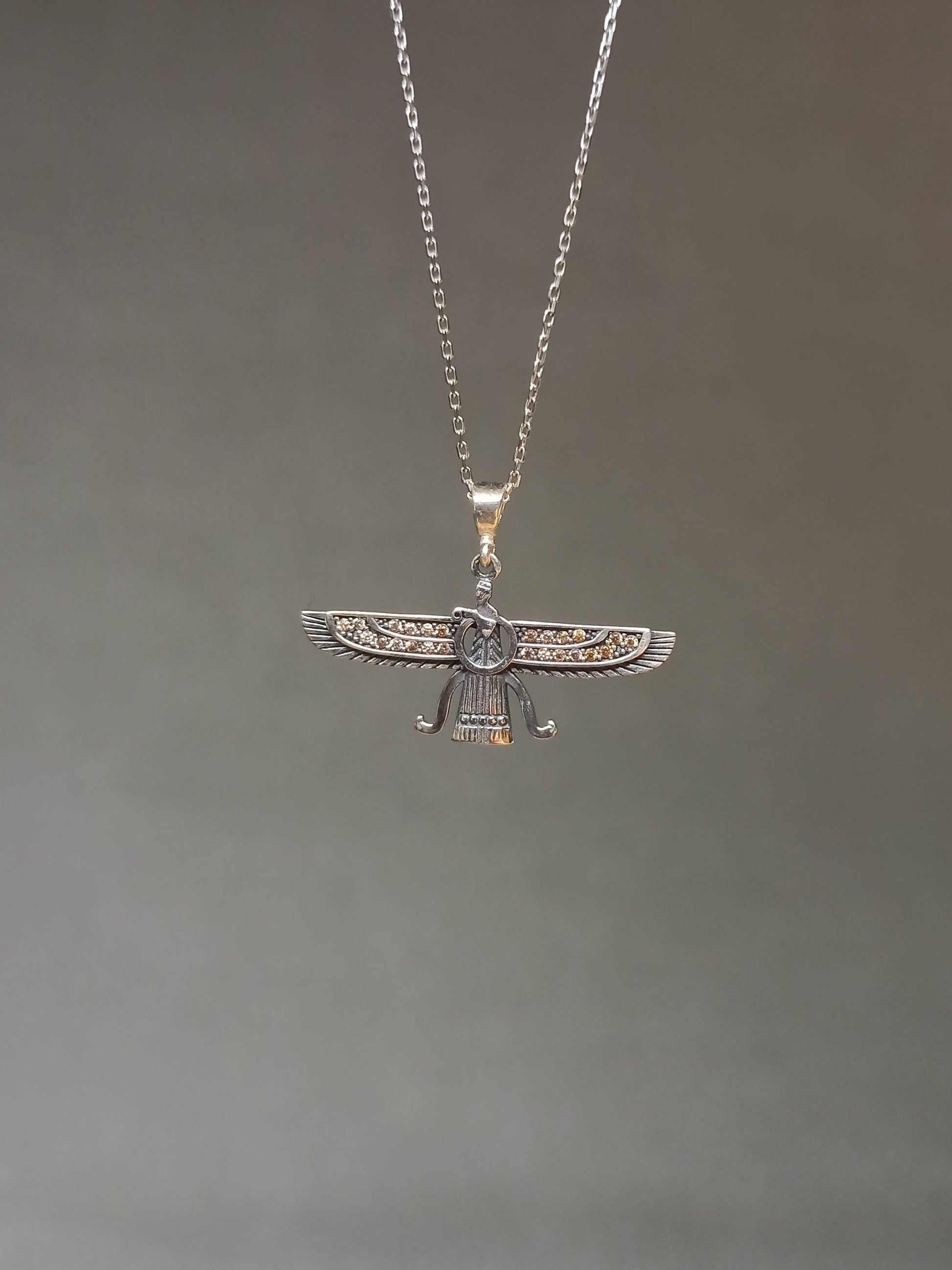 Bu özel tasarım Faravahar kolye, BHCL Co.’nun antik sembollerden ilham alan el yapımı koleksiyonunun parçasıdır.