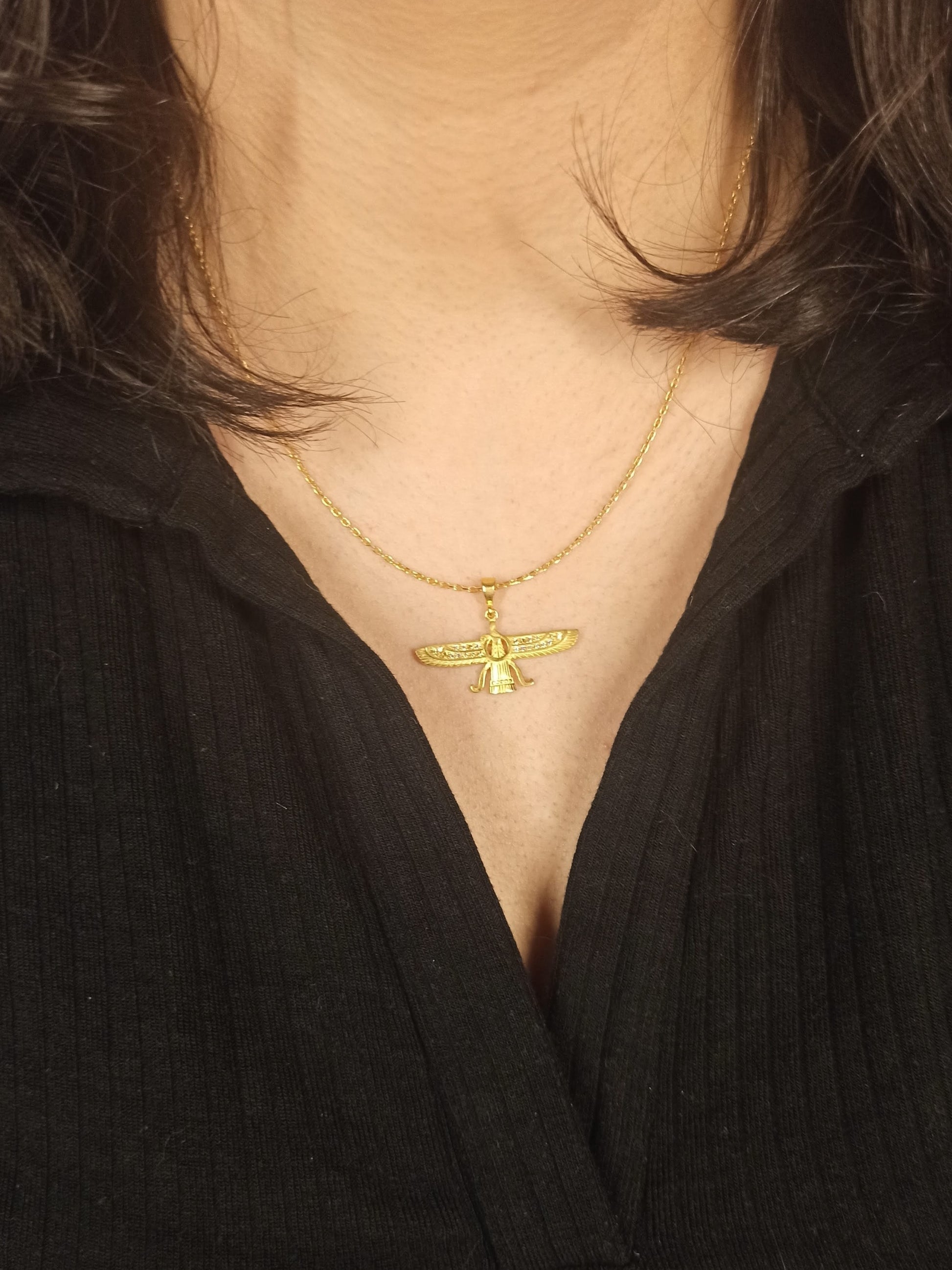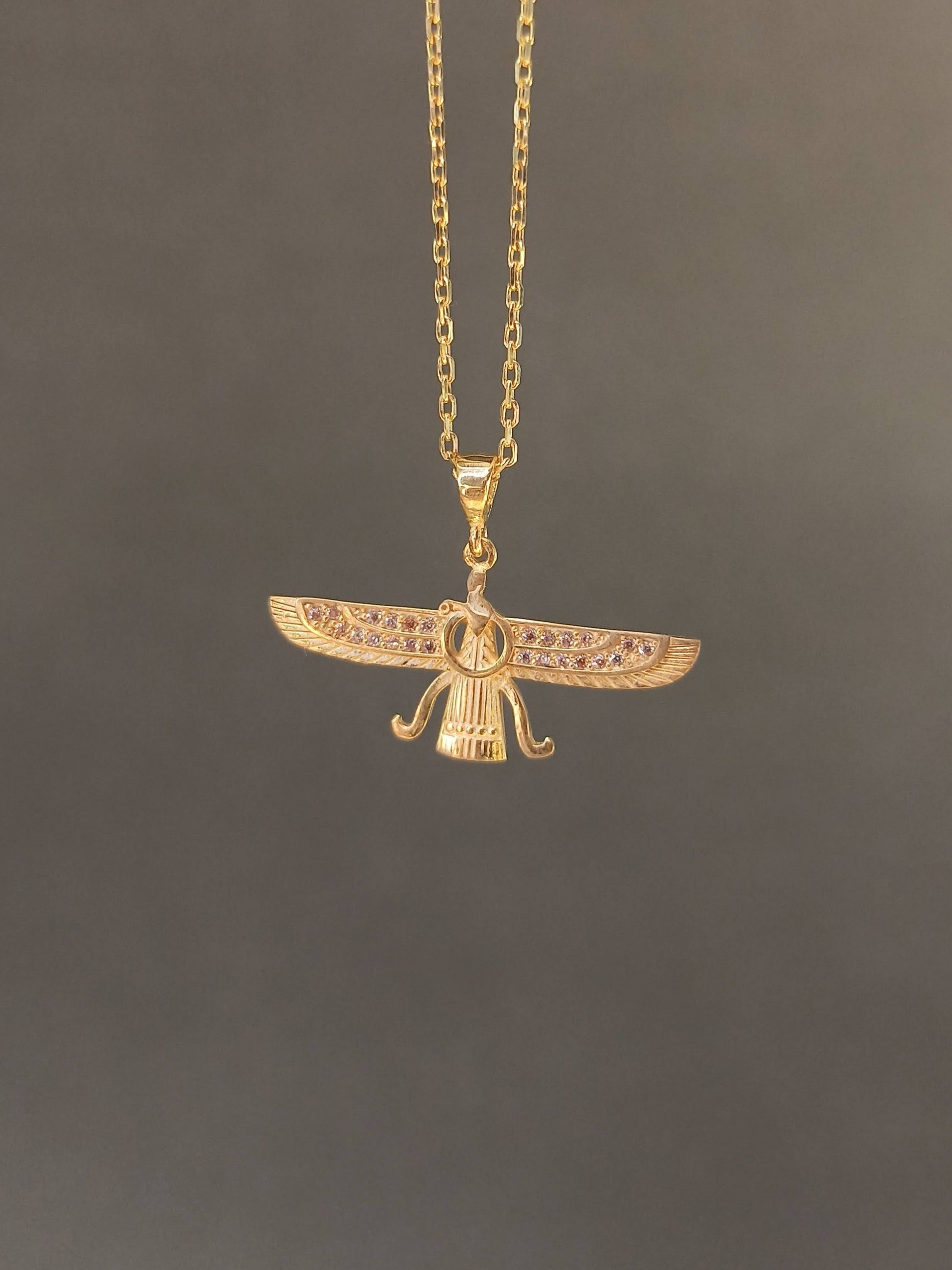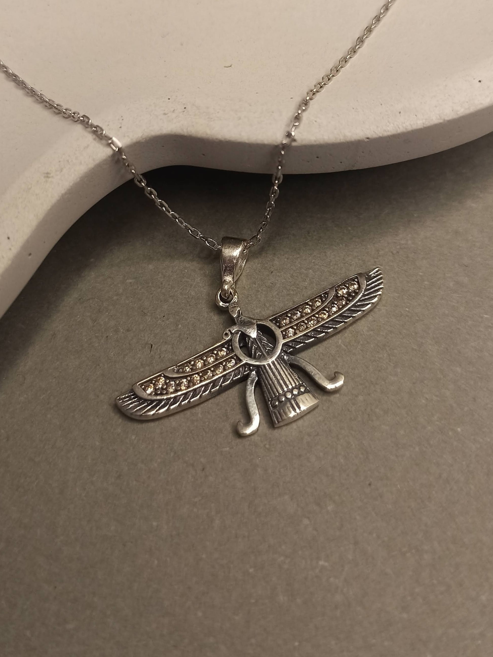 Zerdüşt inancında Faravahar (veya Farohar), koruyucu ruhu, içsel bilinci ve doğru yolu takip etmeyi simgeler. İnsan figürü, akıl ve iradeyi; geniş kanatlar ise ilerleme, özgürlük ve ruhsal yükselişi temsil eder. Bu anlamıyla Faravahar, sadece bir mücevher değil, aynı zamanda bilgelik ve rehberliğin simgesidir.
