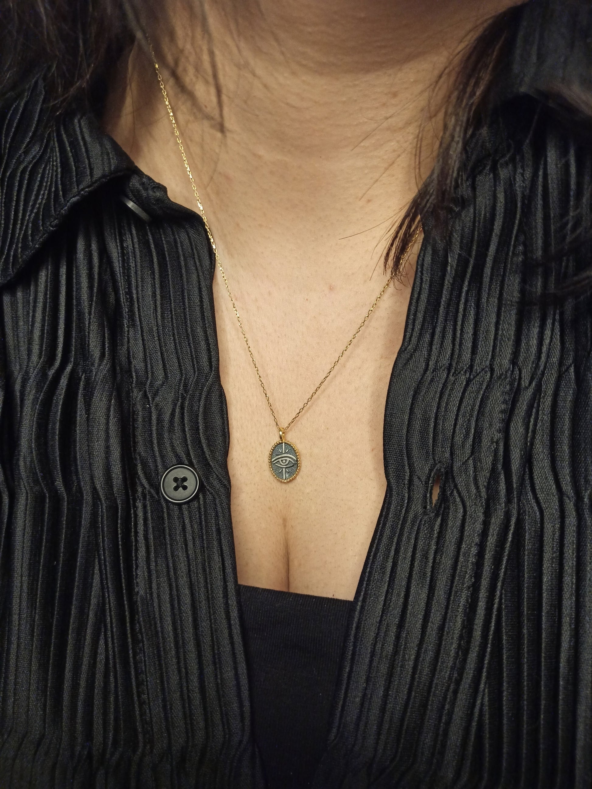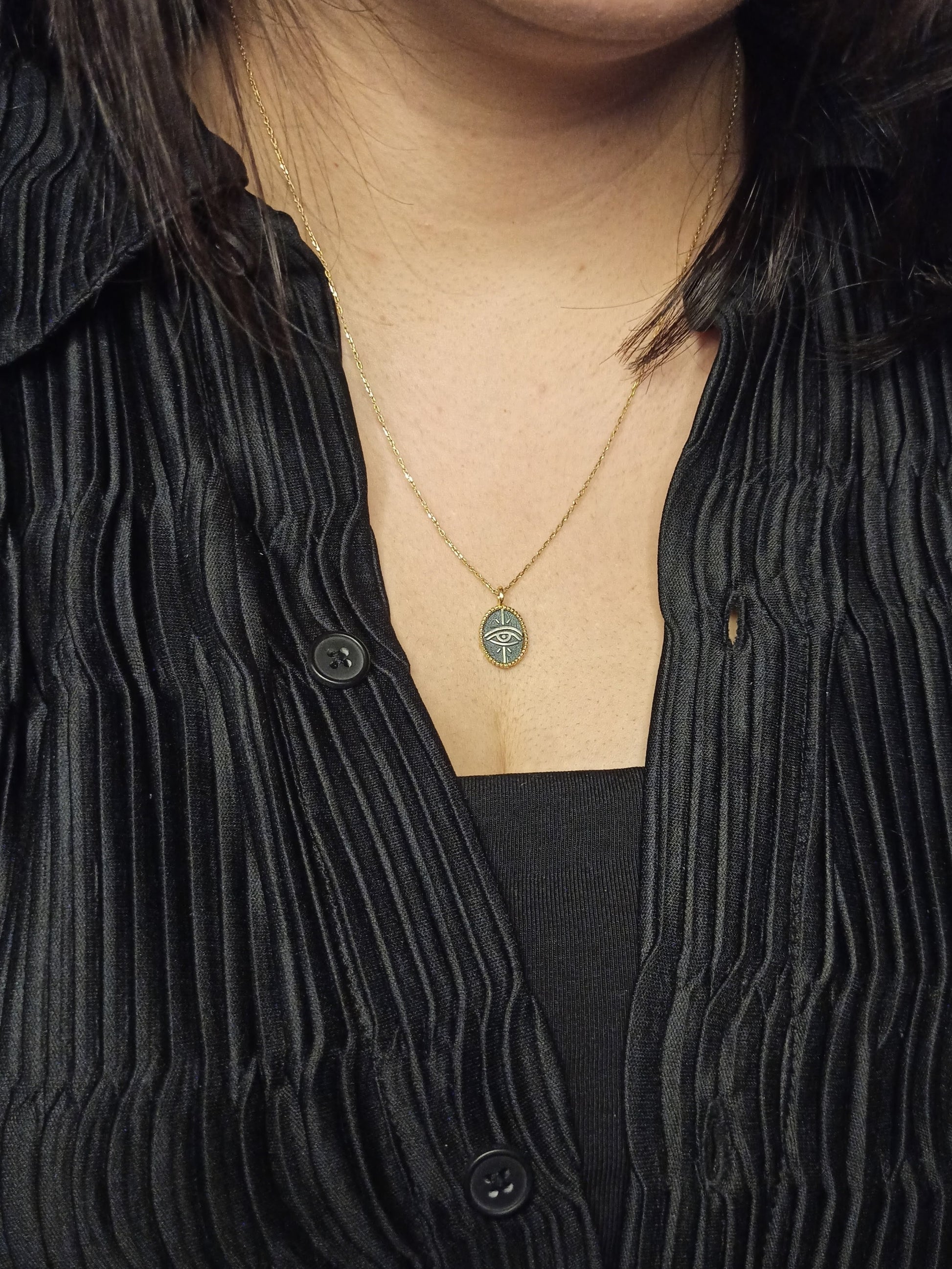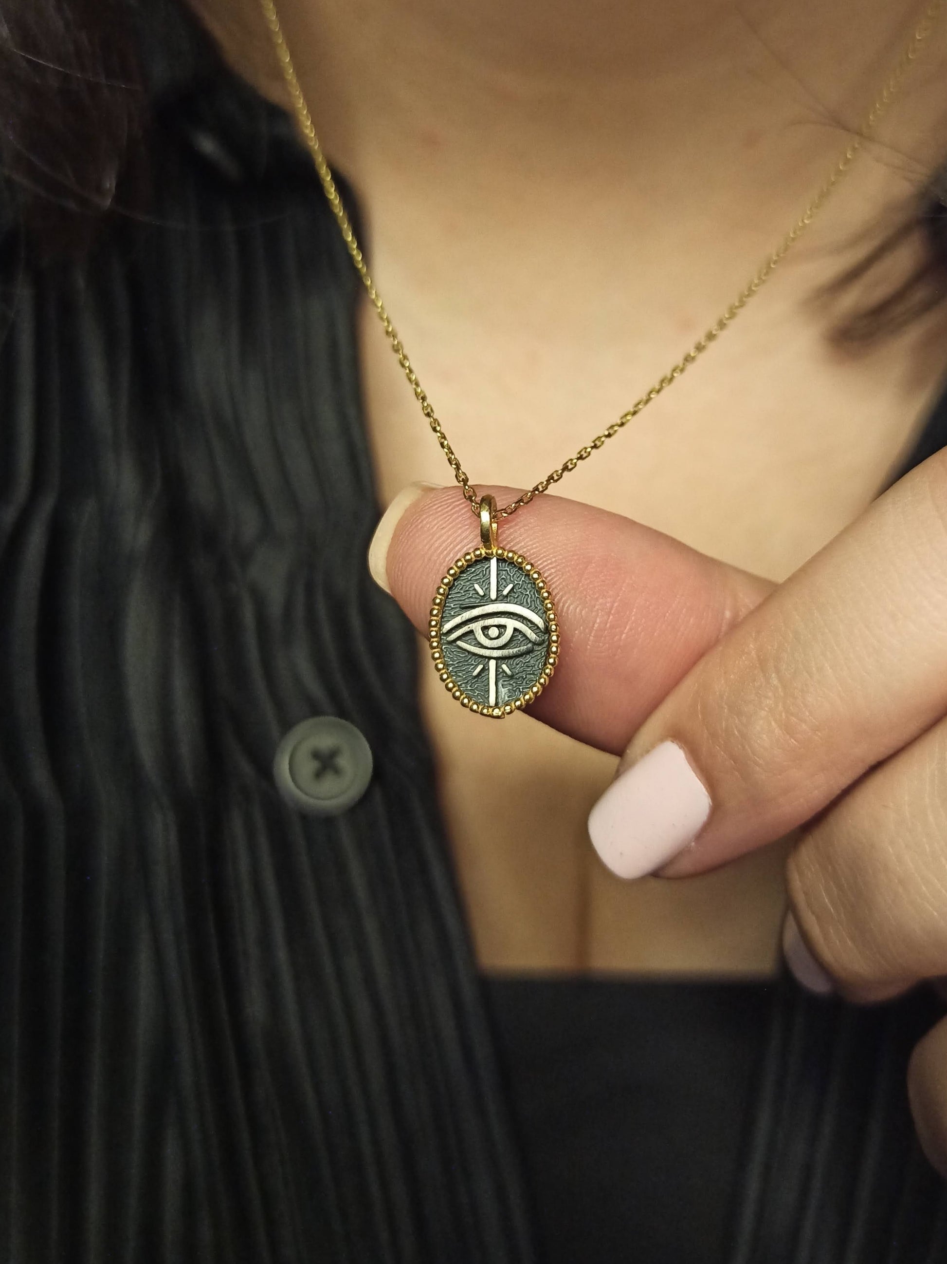 Koruyucu anlamı ve güçlü sembolizmiyle öne çıkan göz motifi, bu tasarımda el işçiliği oksitli yüzey ve gold filled çerçeveyle birleşir. Denge, farkındalık ve korunma temalarını temsil eden bu kolye; zamansız, anlamlı ve güçlü bir aksesuar arayanlar için tasarlanmıştır. Minimal ölçüsü sayesinde günlük kullanıma son derece uygundur.