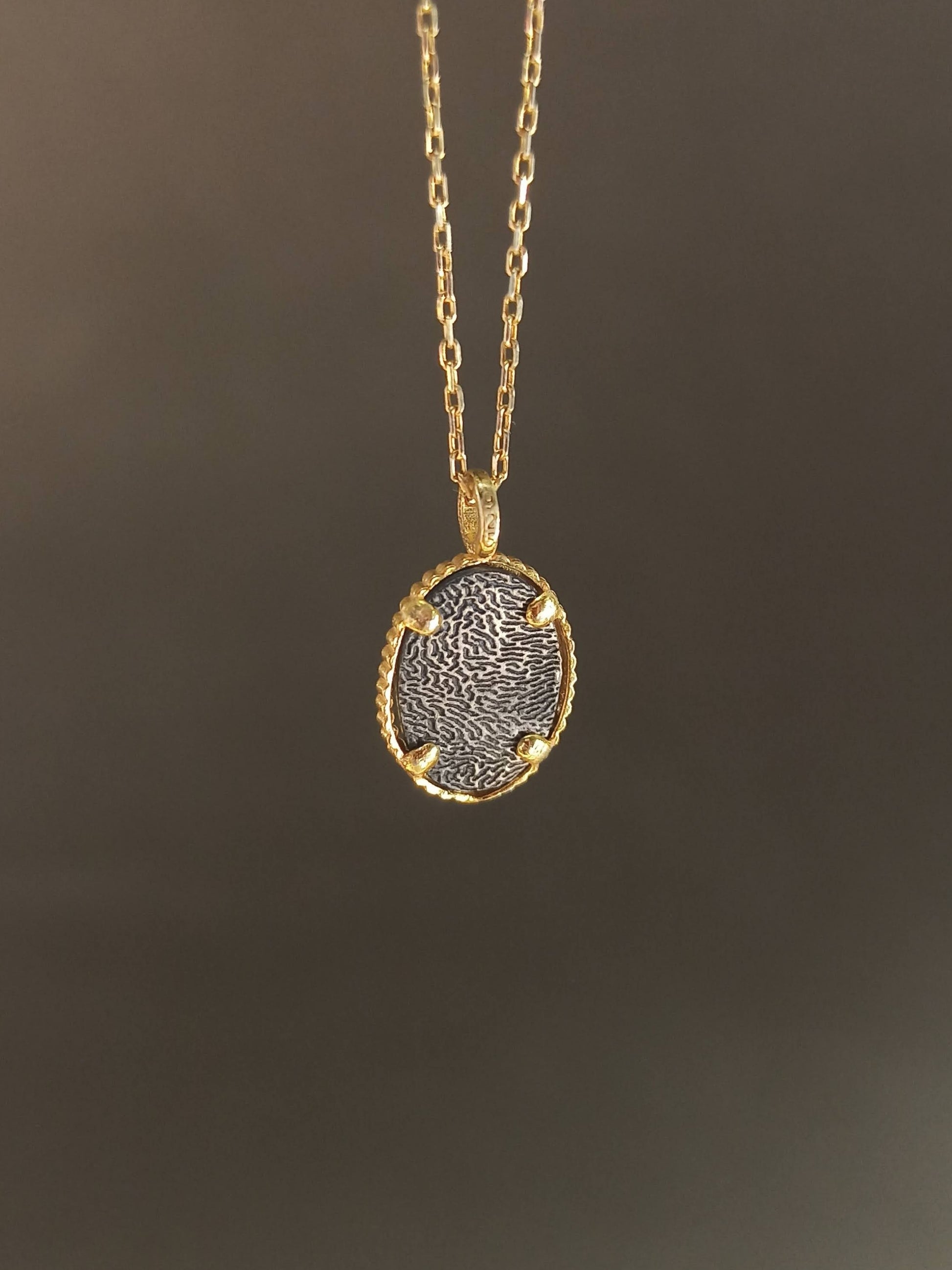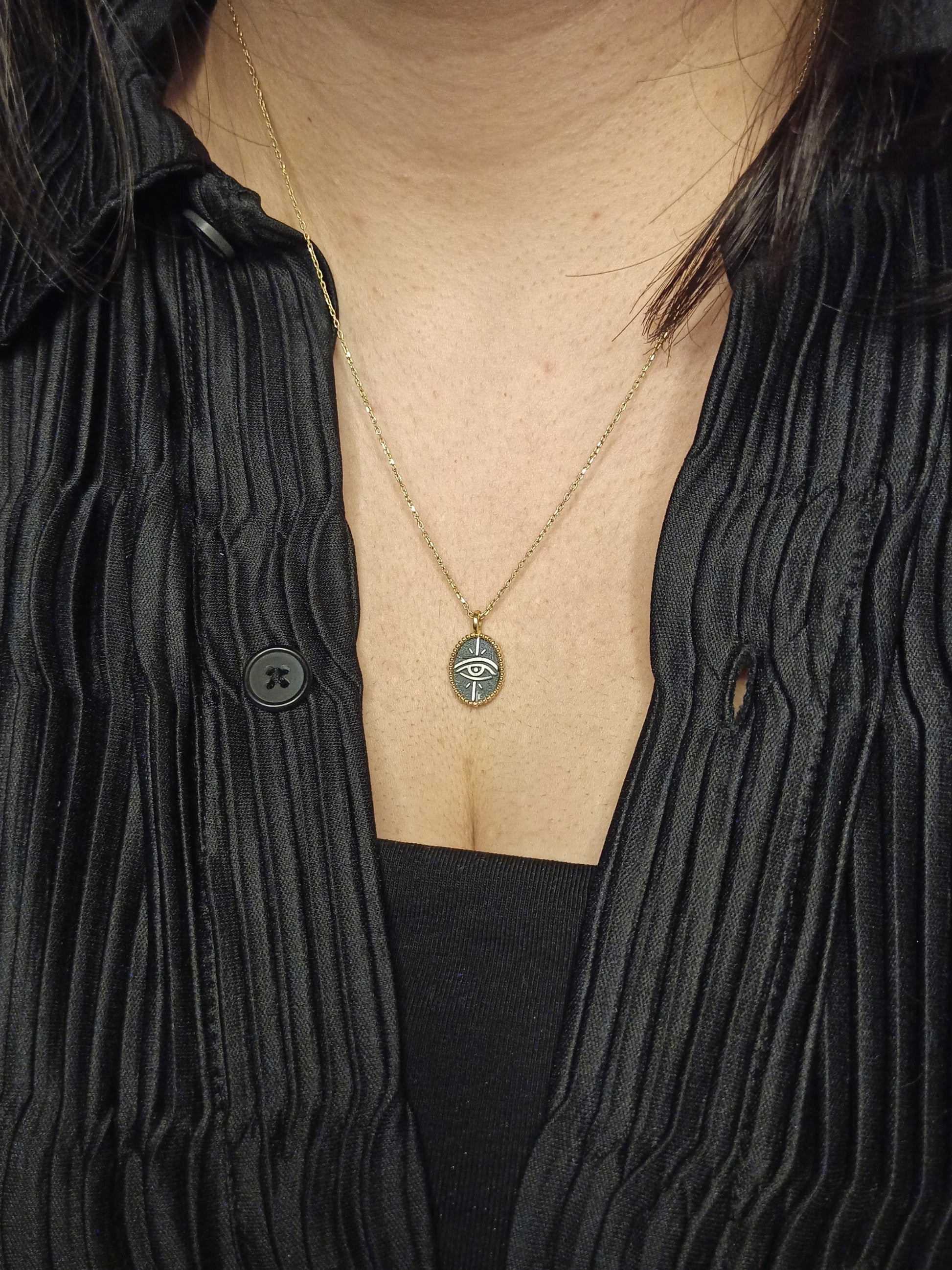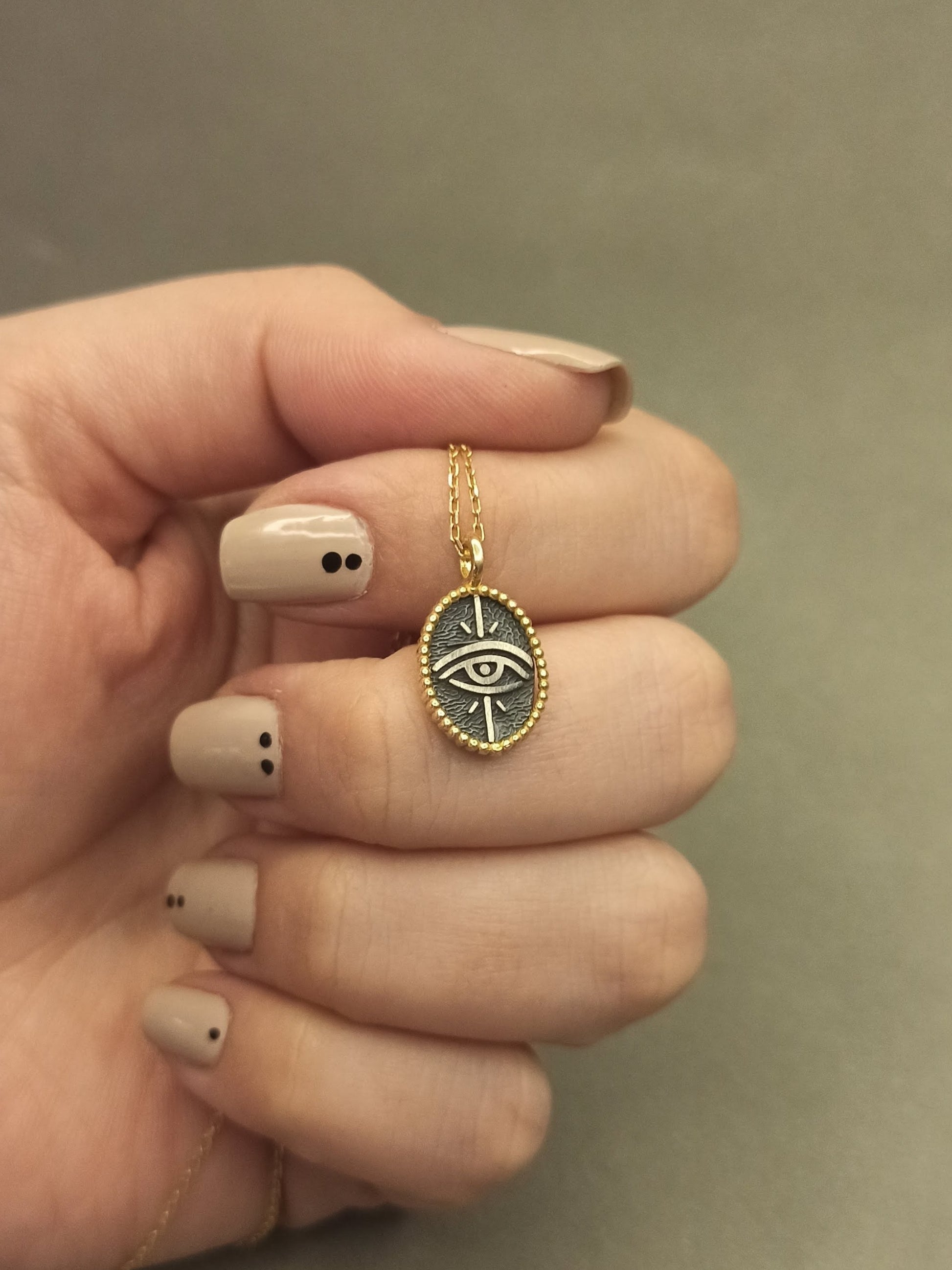 Koruyucu anlamı ve güçlü sembolizmiyle öne çıkan göz motifi, bu tasarımda el işçiliği oksitli yüzey ve gold filled çerçeveyle birleşir. Denge, farkındalık ve korunma temalarını temsil eden bu kolye; zamansız, anlamlı ve güçlü bir aksesuar arayanlar için tasarlanmıştır. Minimal ölçüsü sayesinde günlük kullanıma son derece uygundur.