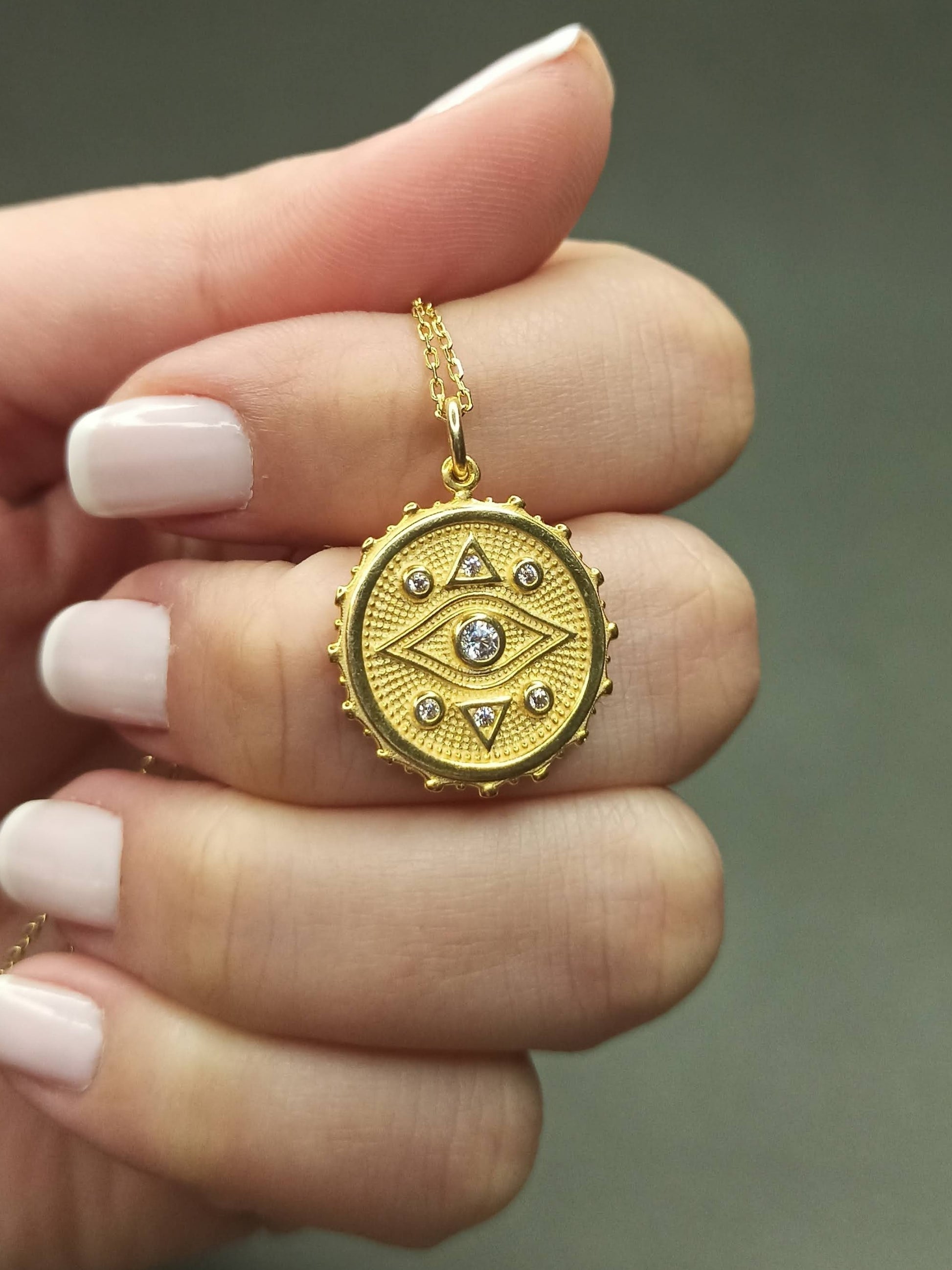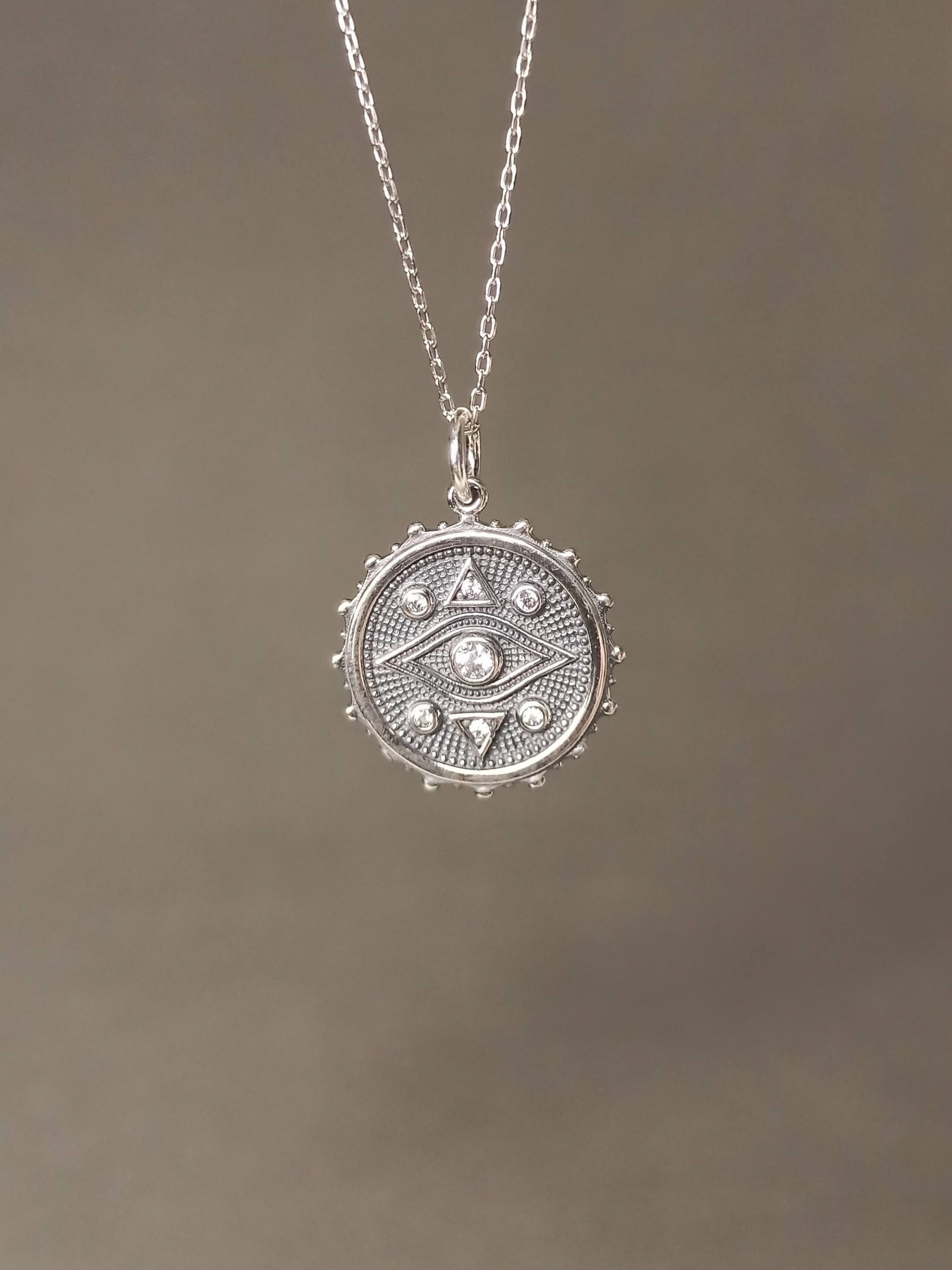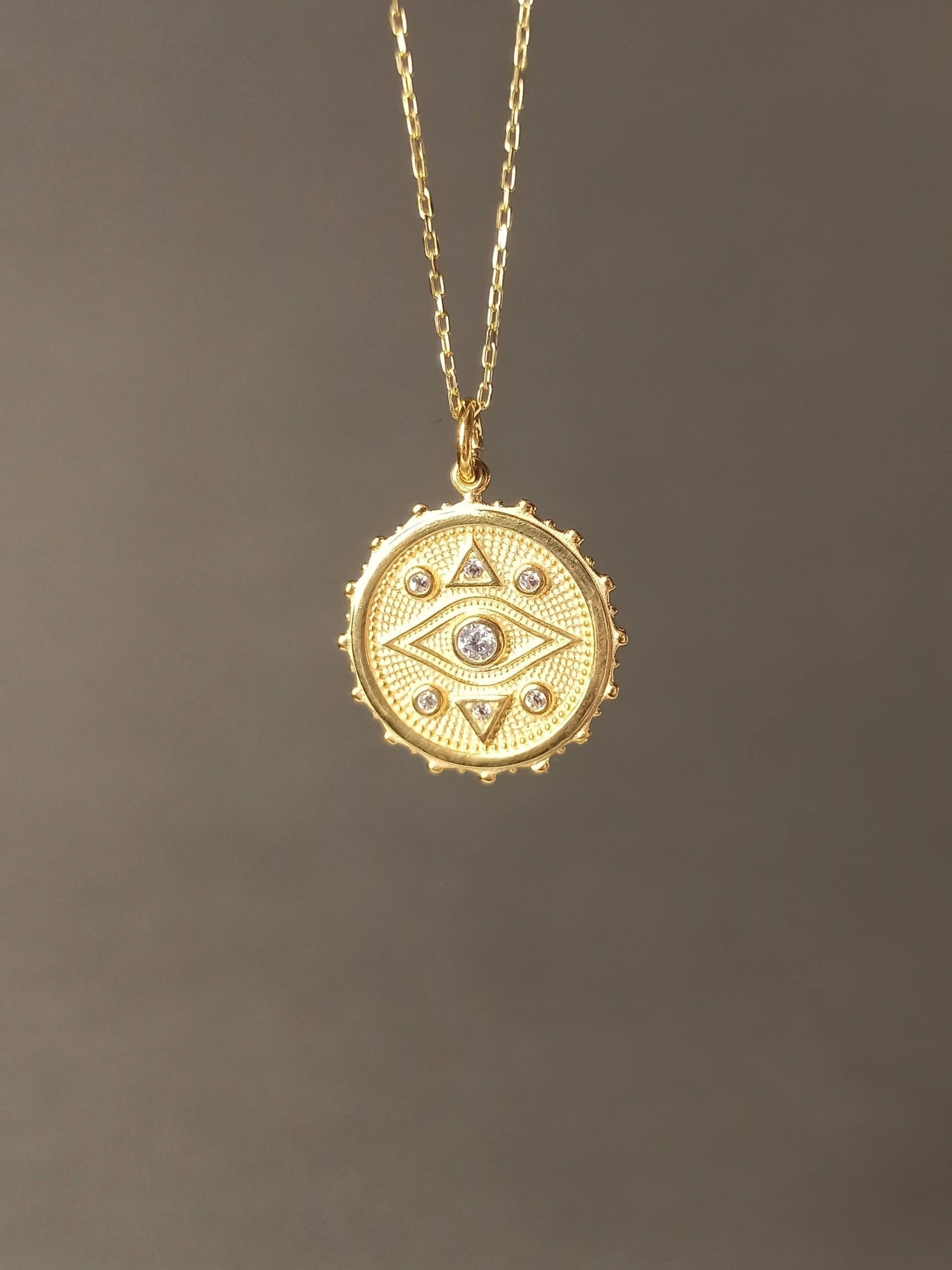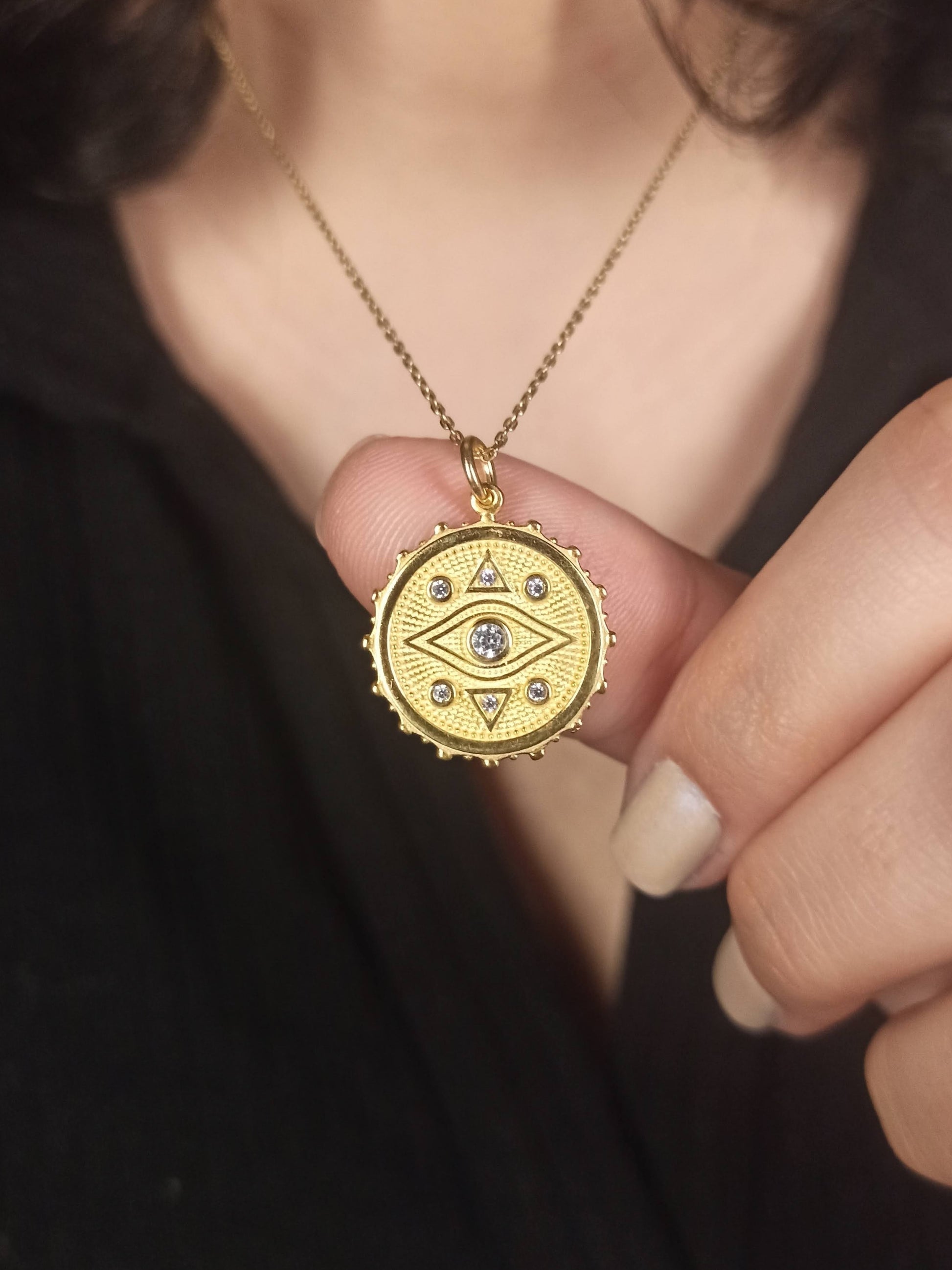 Bu zarif göz madalyon kolye, antik sembollerden ilham alınarak tasarlanmış güçlü bir koruma tılsımıdır.