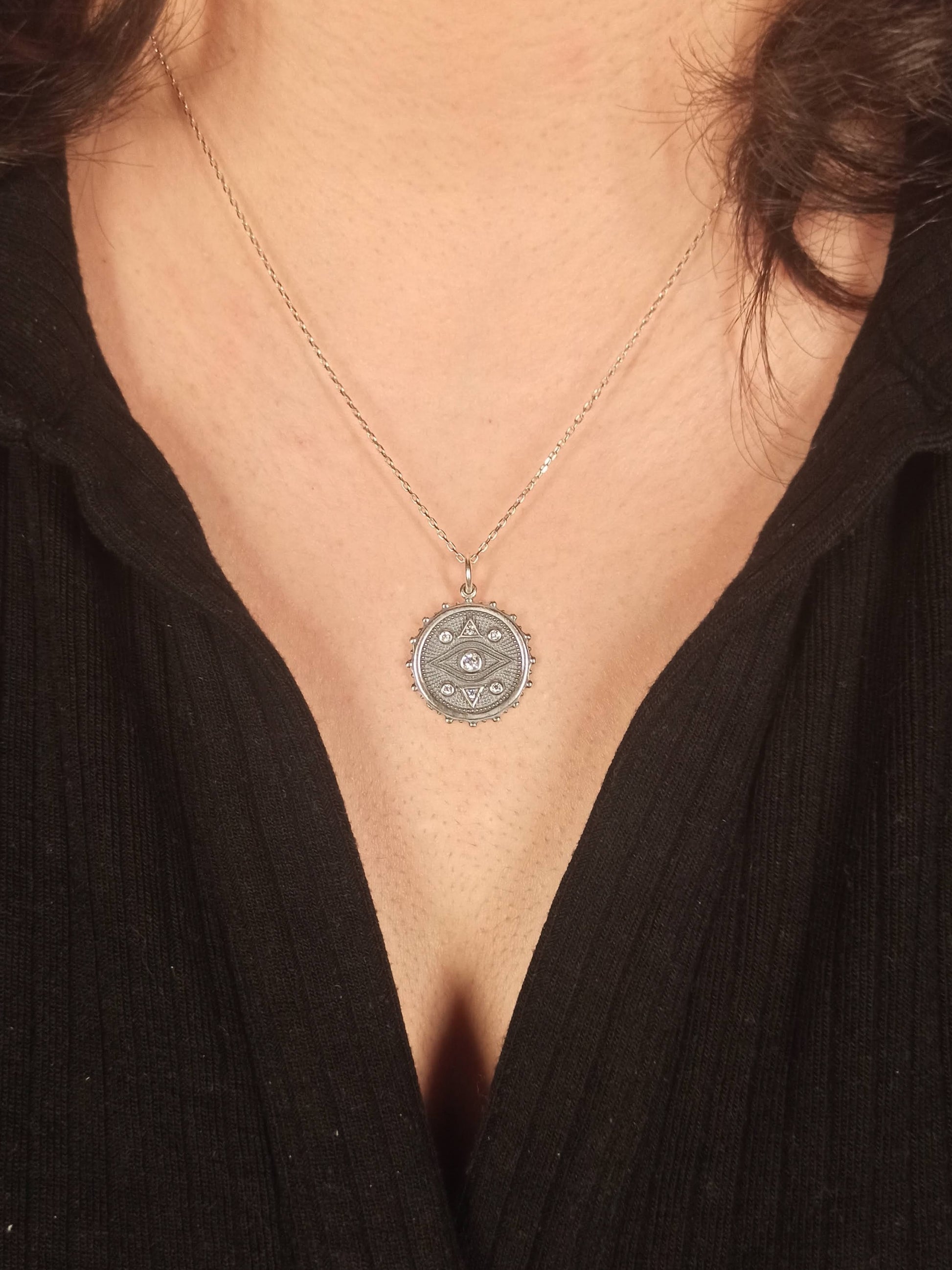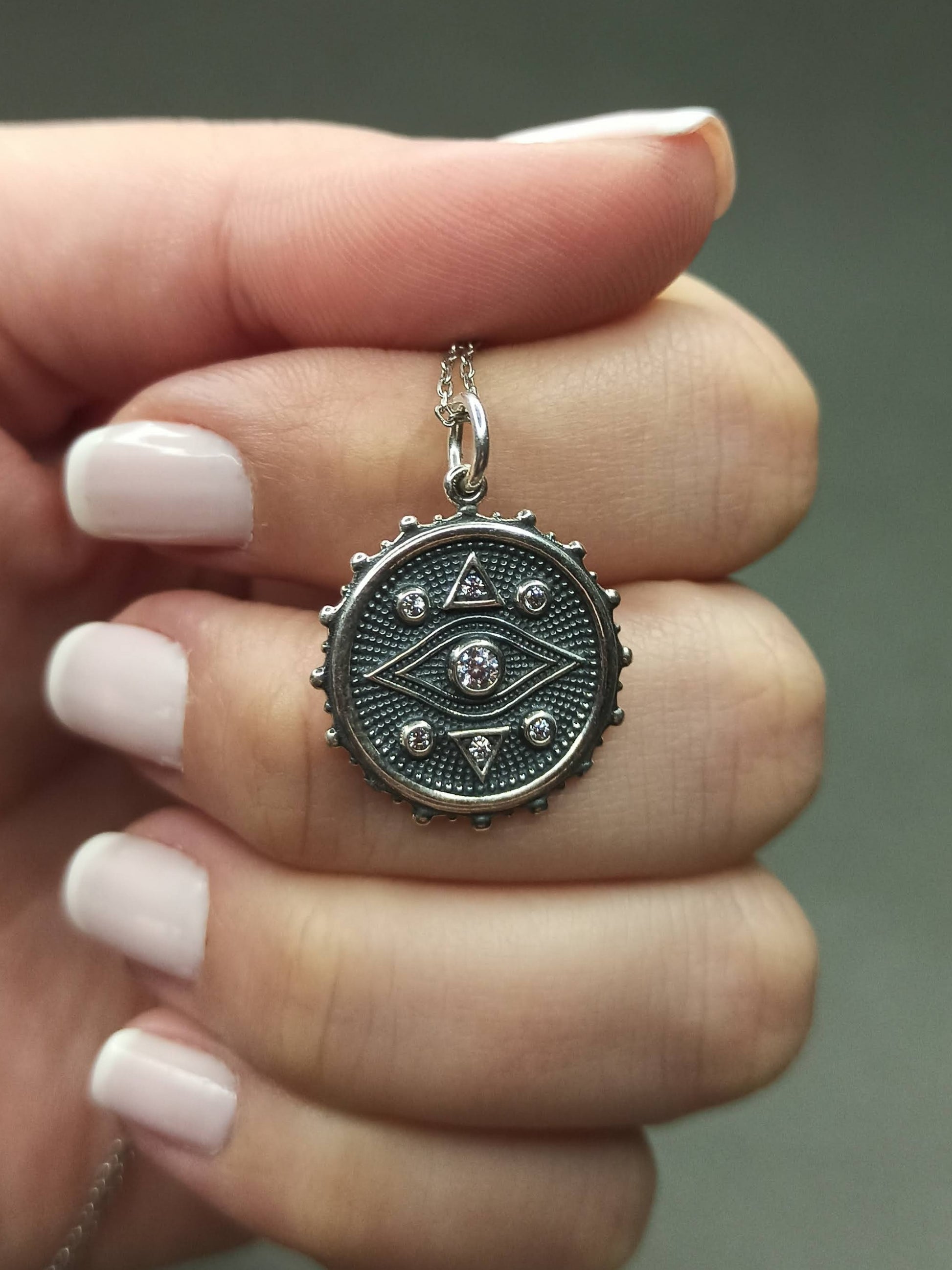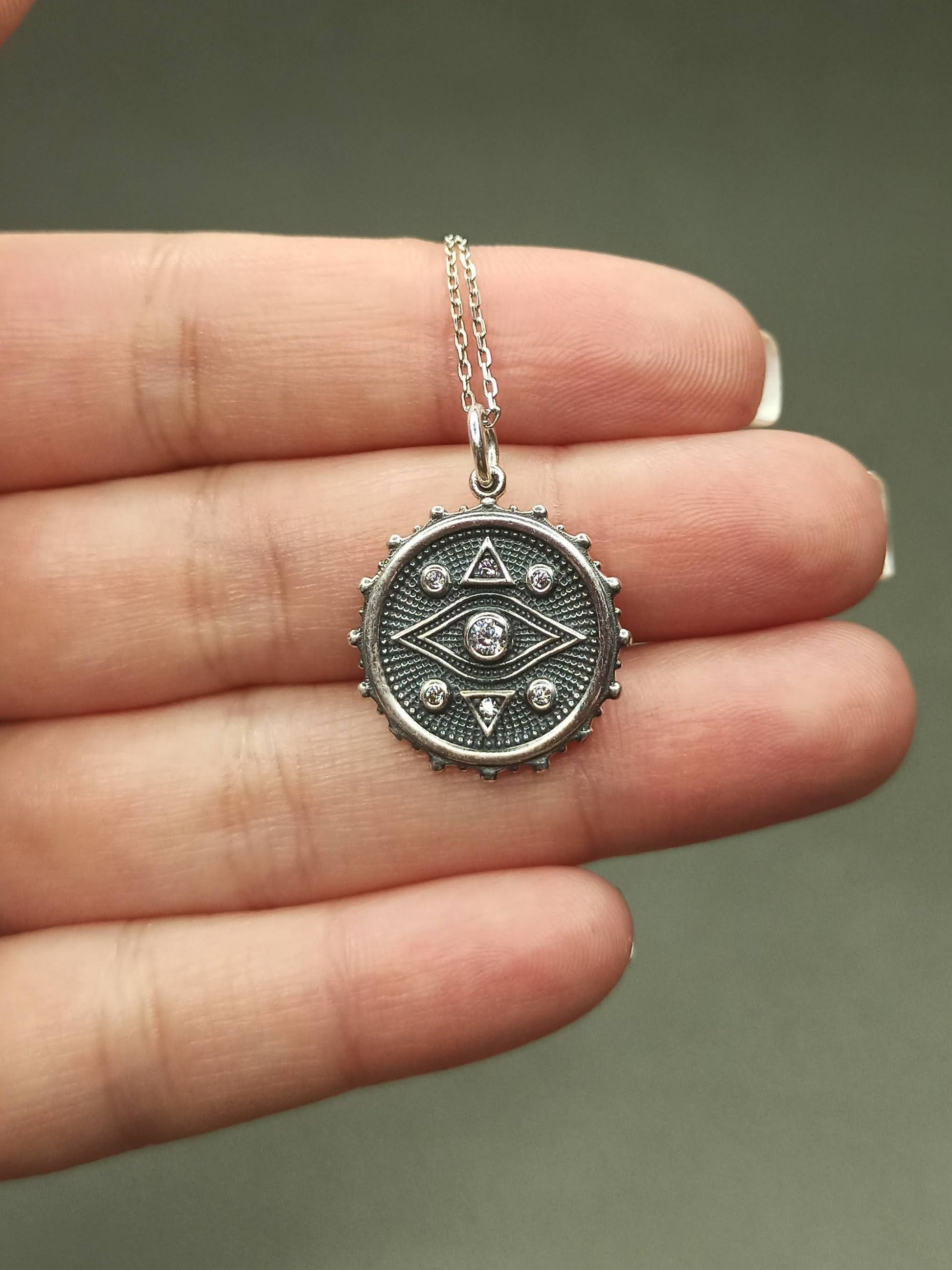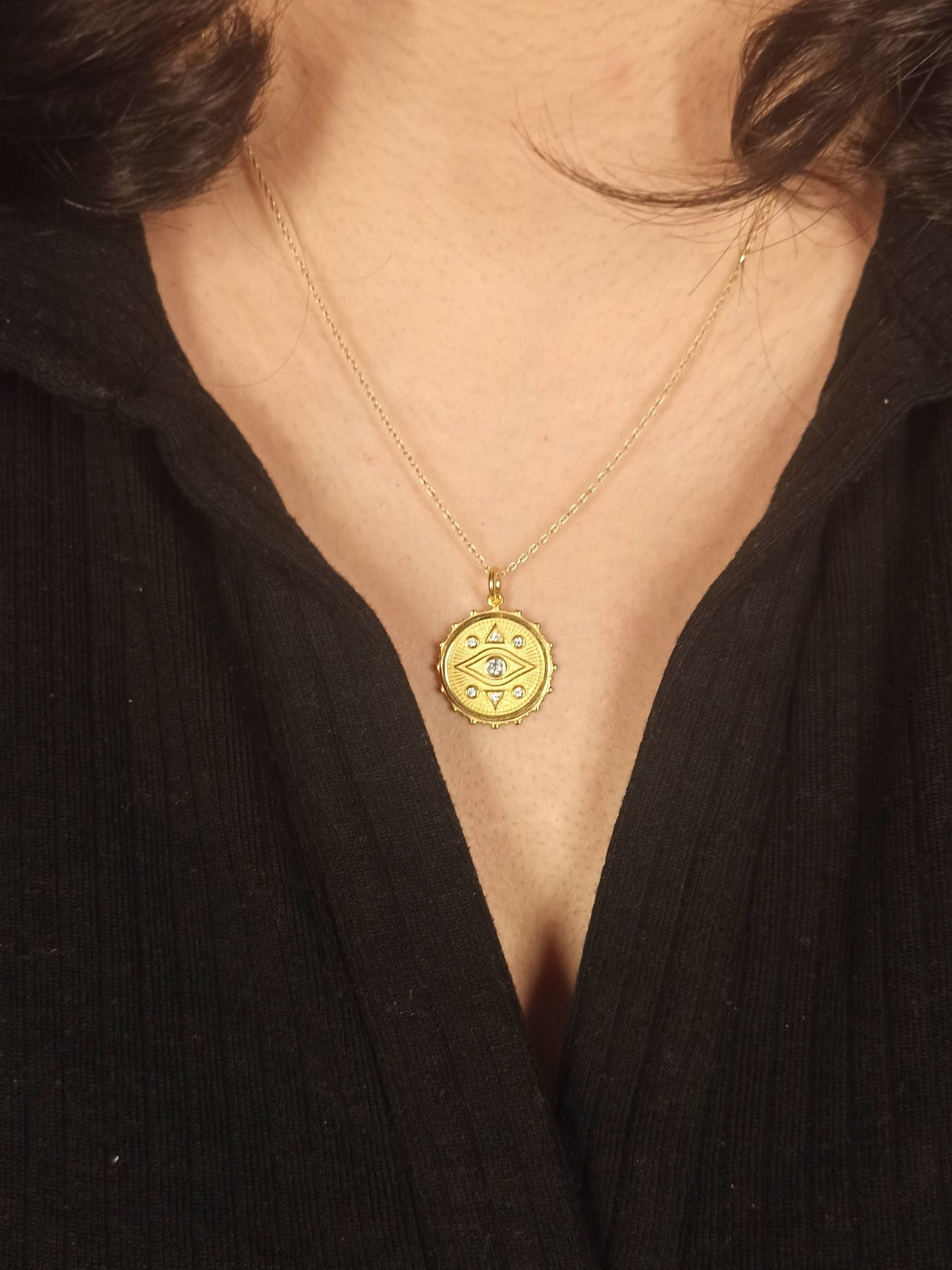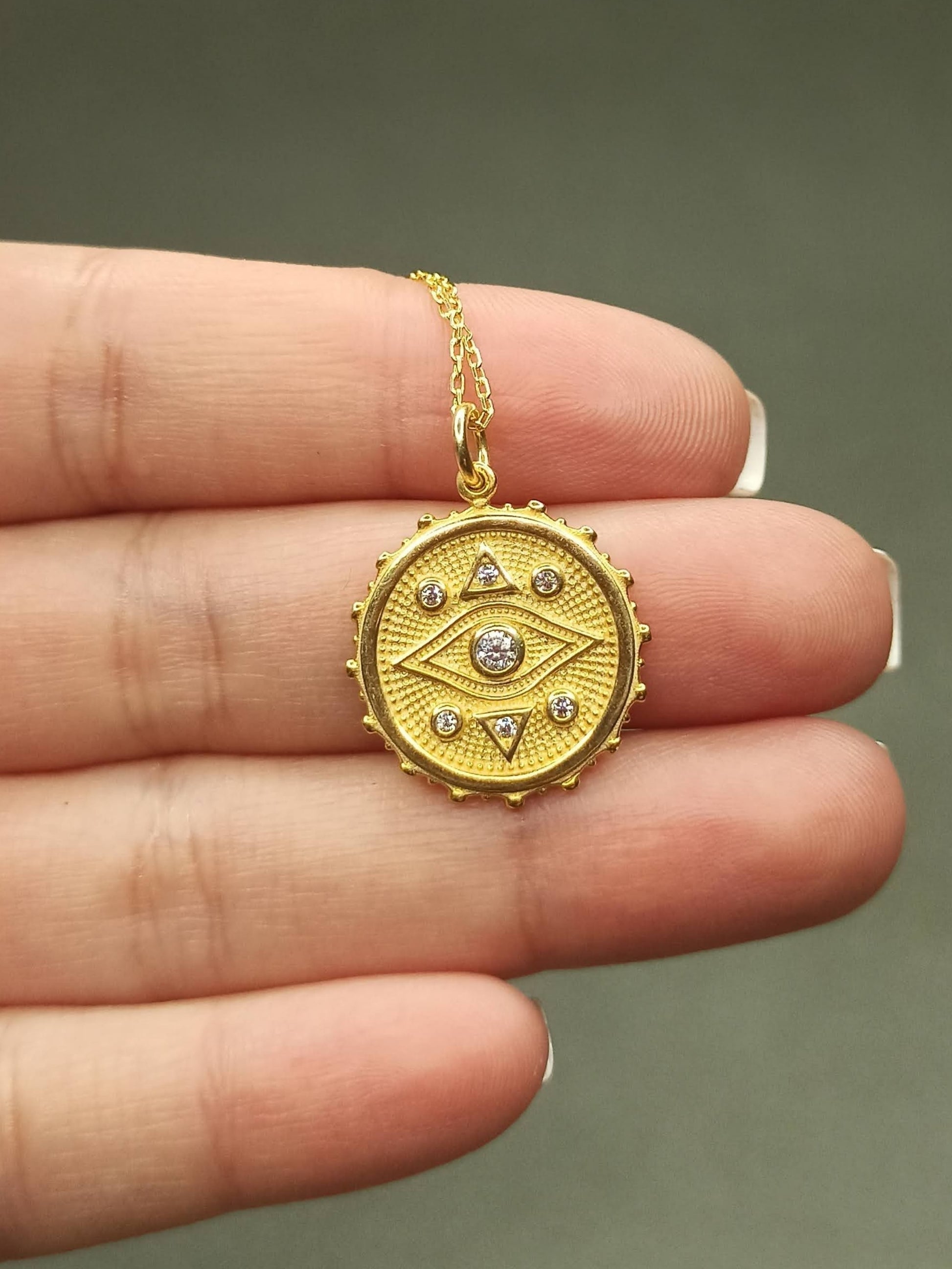 Bu zarif göz madalyon kolye, antik sembollerden ilham alınarak tasarlanmış güçlü bir koruma tılsımıdır.