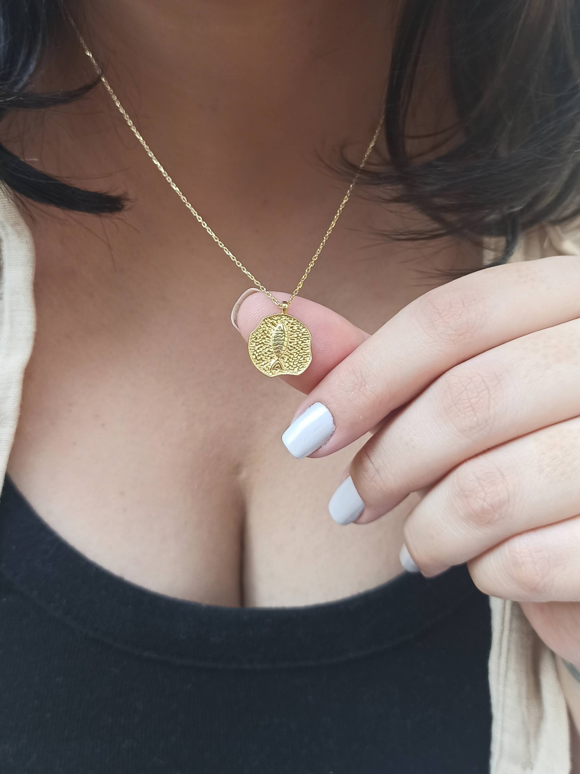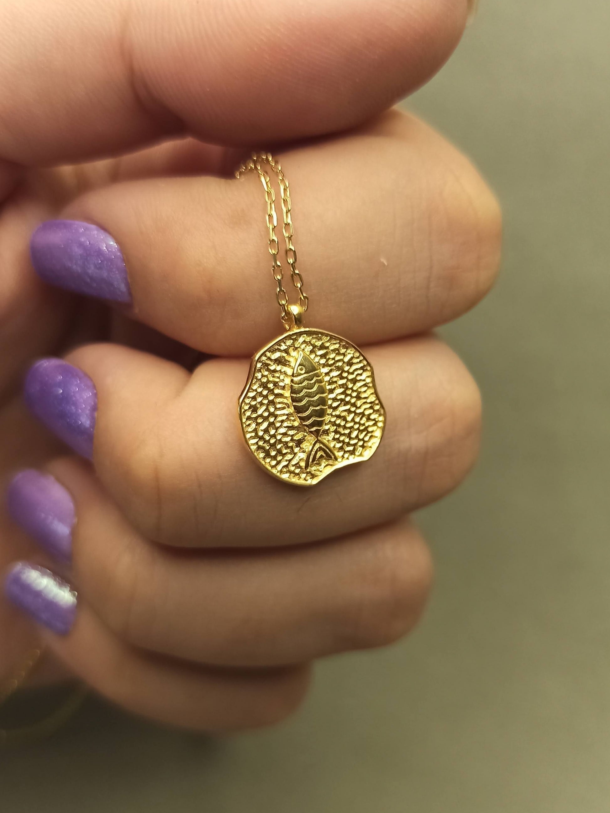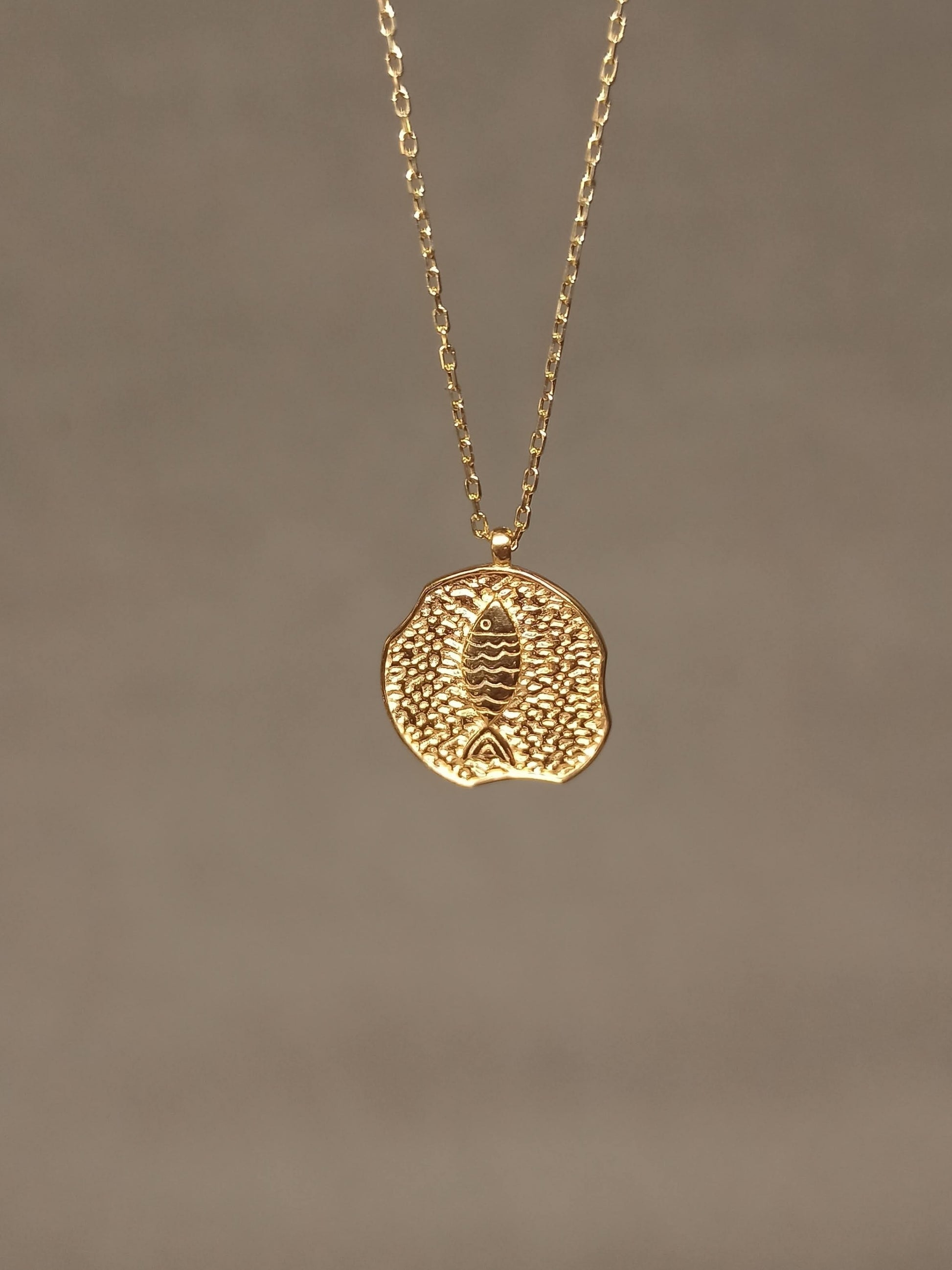 - Şans ve Bereketin Antik Tılsımı. Balık figürü, tarih boyunca bereket, bolluk ve şansın sembolü olmuştur. Bu kolye, düzensiz ve dokulu (çekiçlenmiş) madalyon tasarımıyla antik bir havayı modern şıklıkla birleştirir. Gümüş üzeri altın kaplama kalitesiyle üretilen bu otantik parça, sadece bir takı değil, aynı zamanda size iyi şans getirecek kişisel bir tılsımdır.