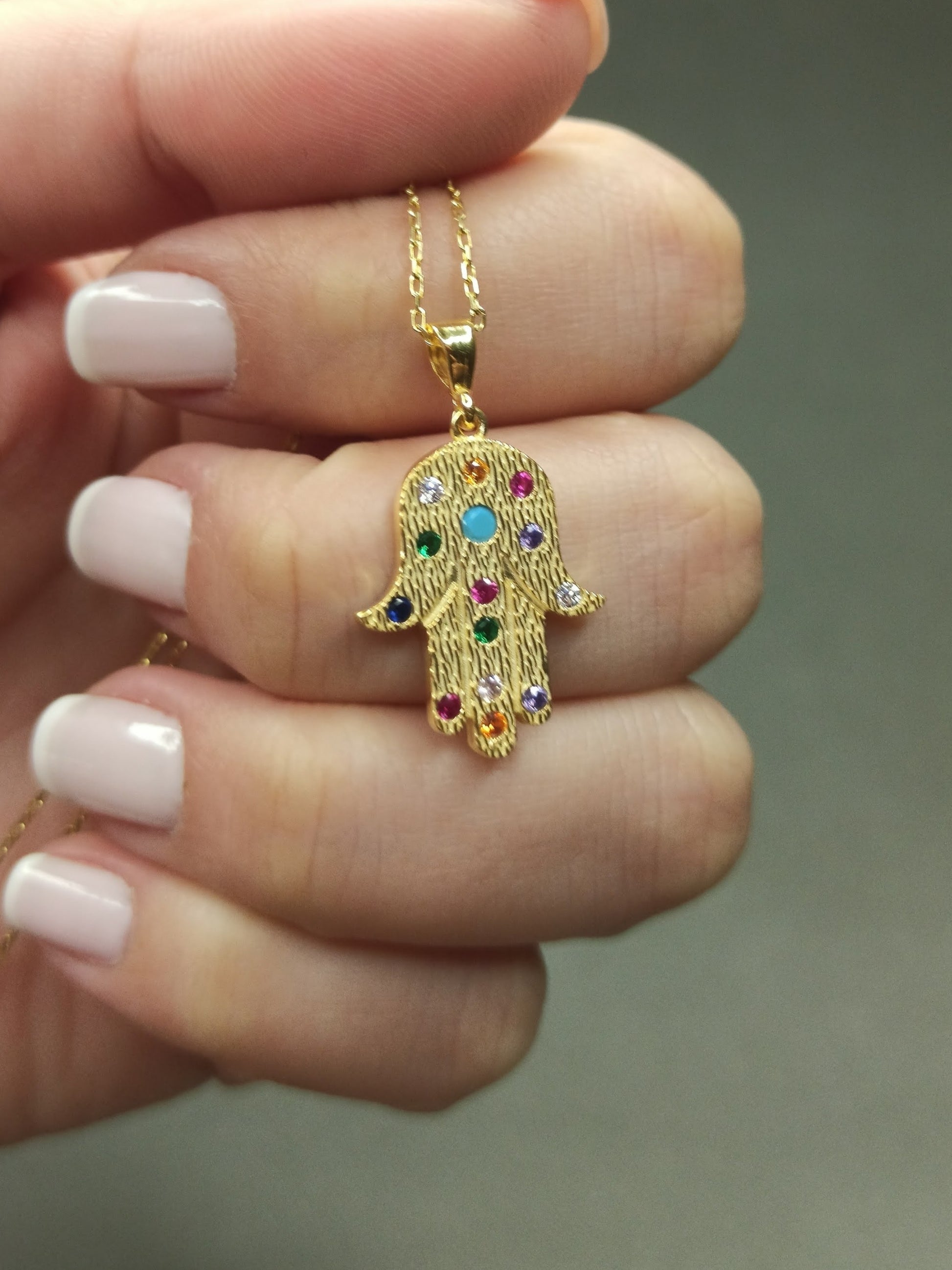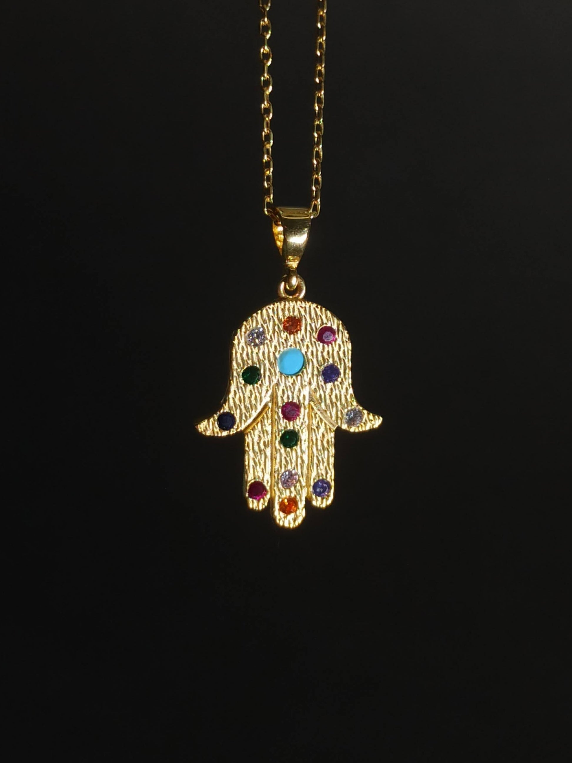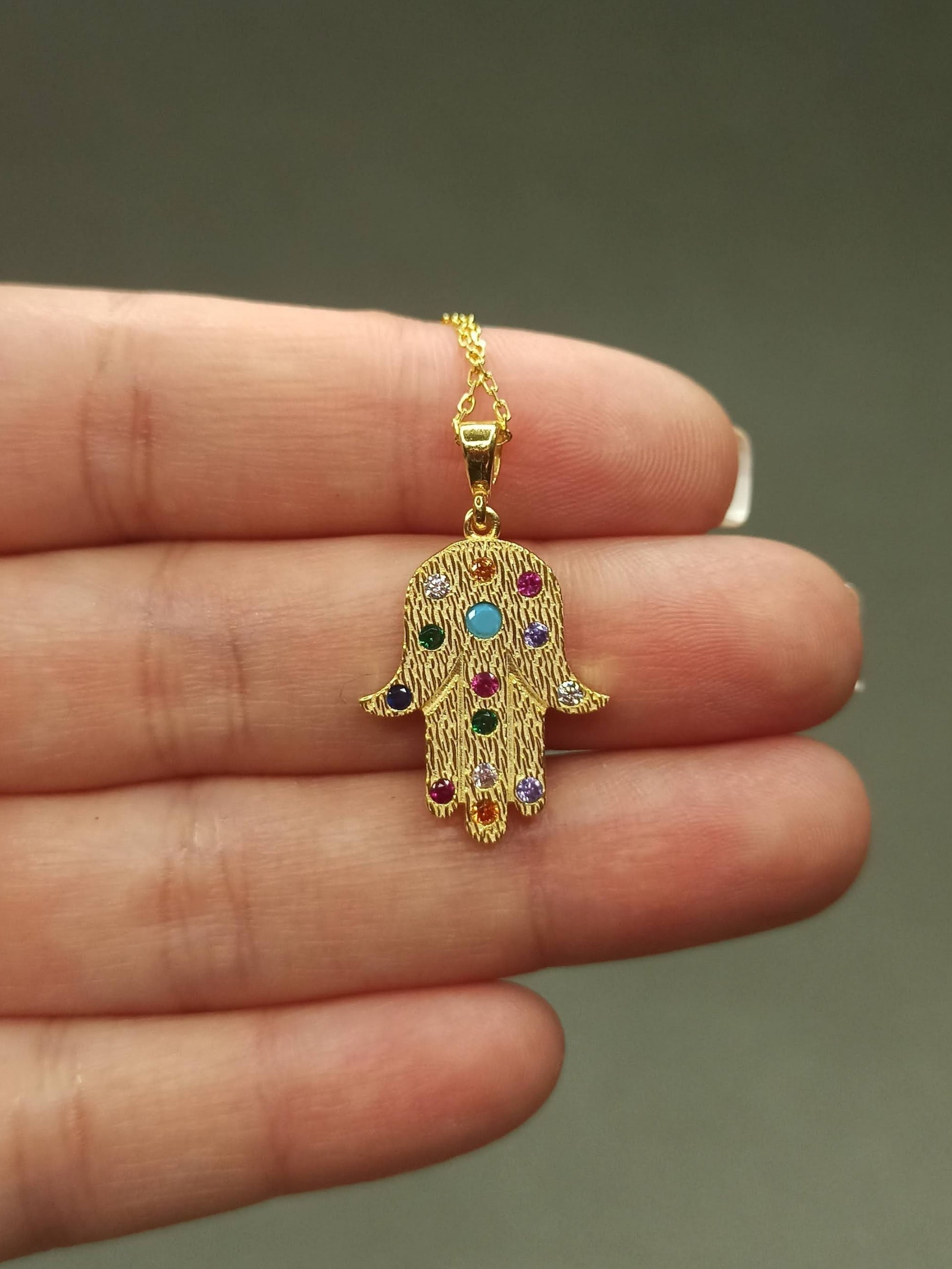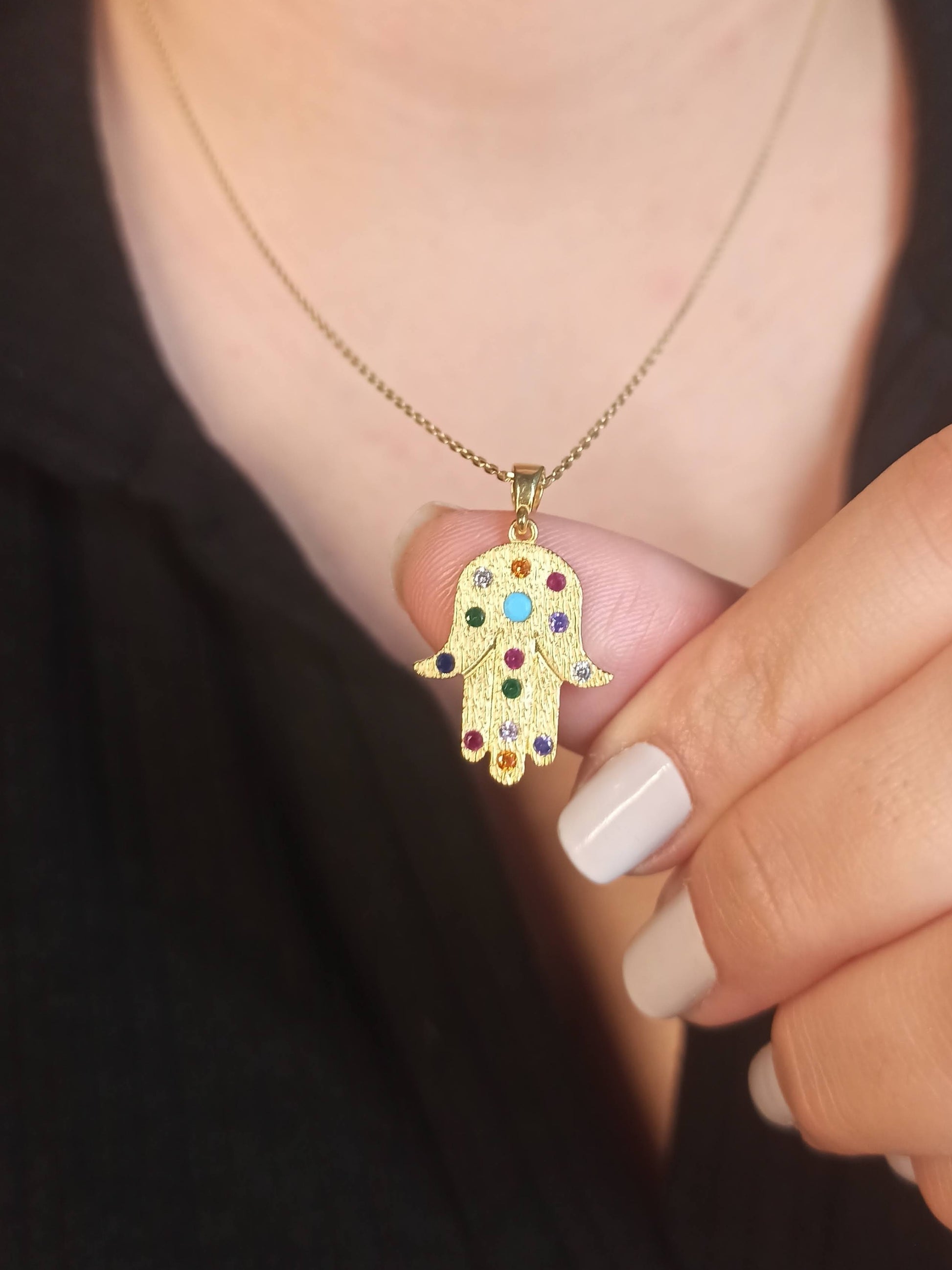 Bu el yapımı Hamsa kolye, zengin dokuya sahip yüzeyi ve renkli taş detaylarıyla hem zarif hem de anlamlı bir aksesuar sunar.