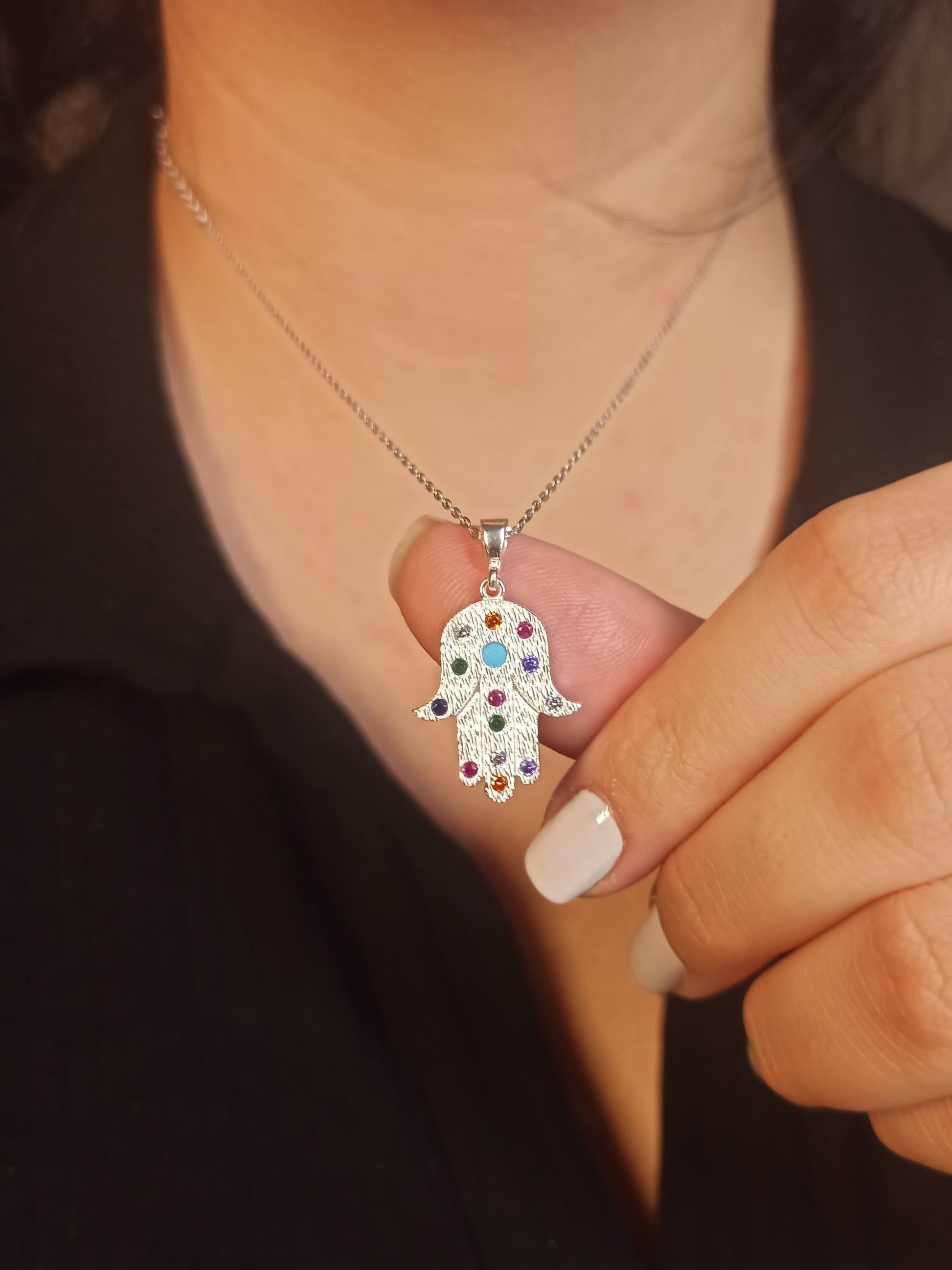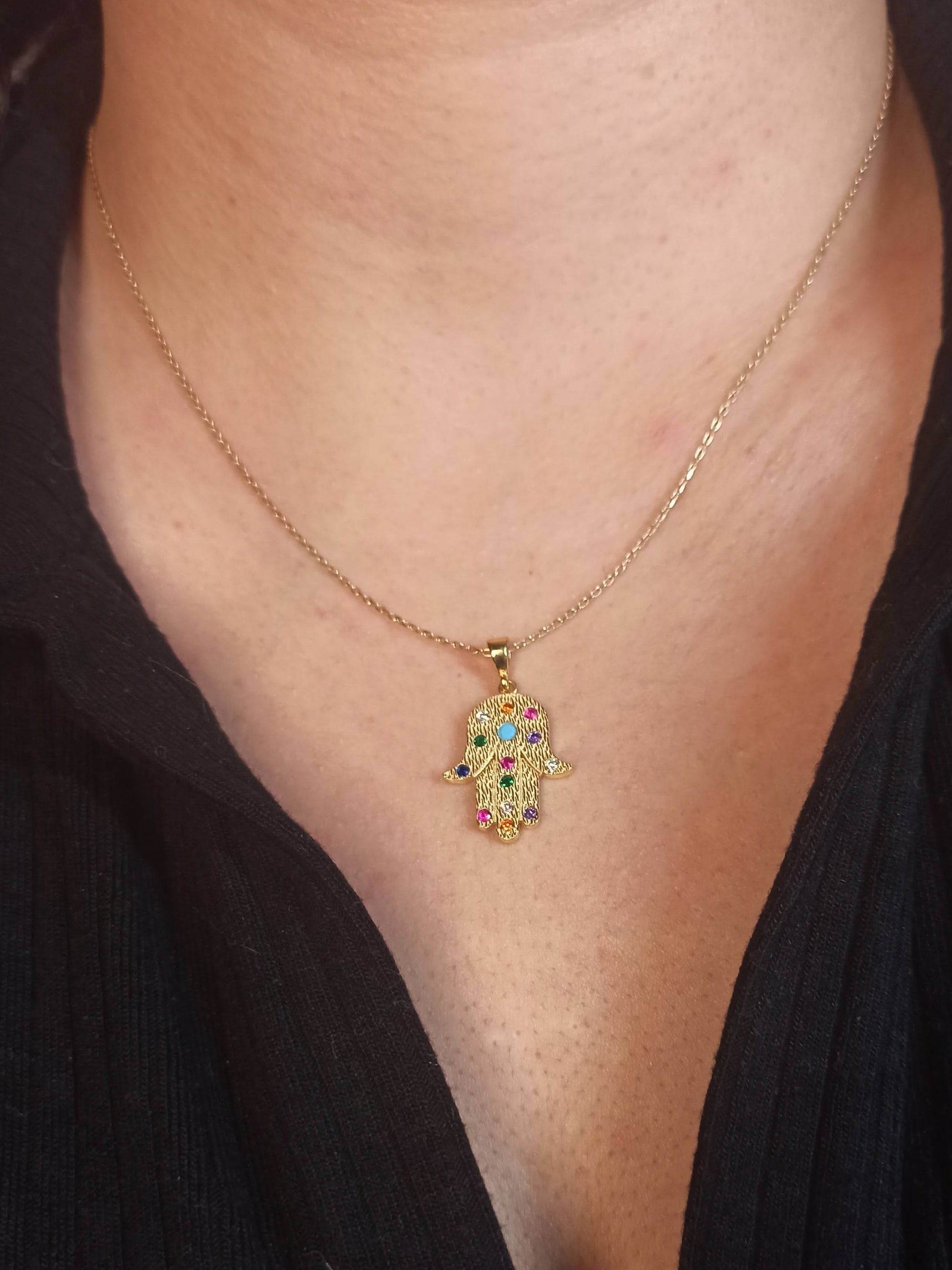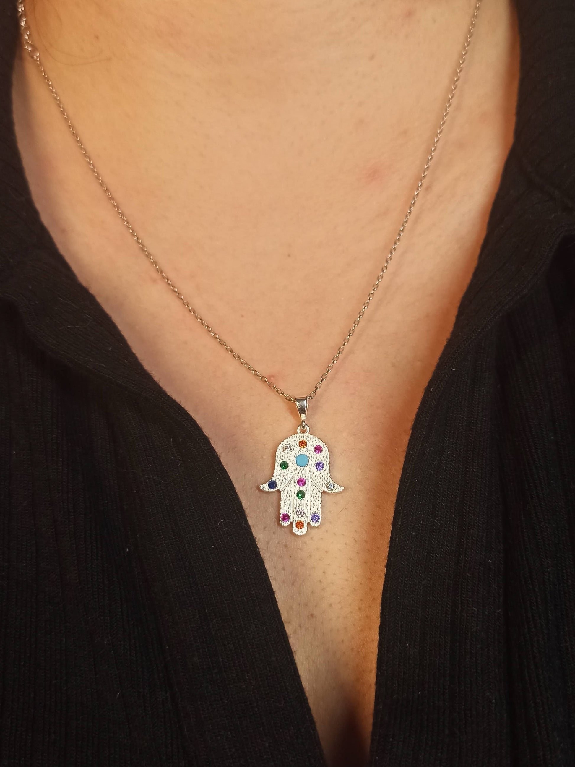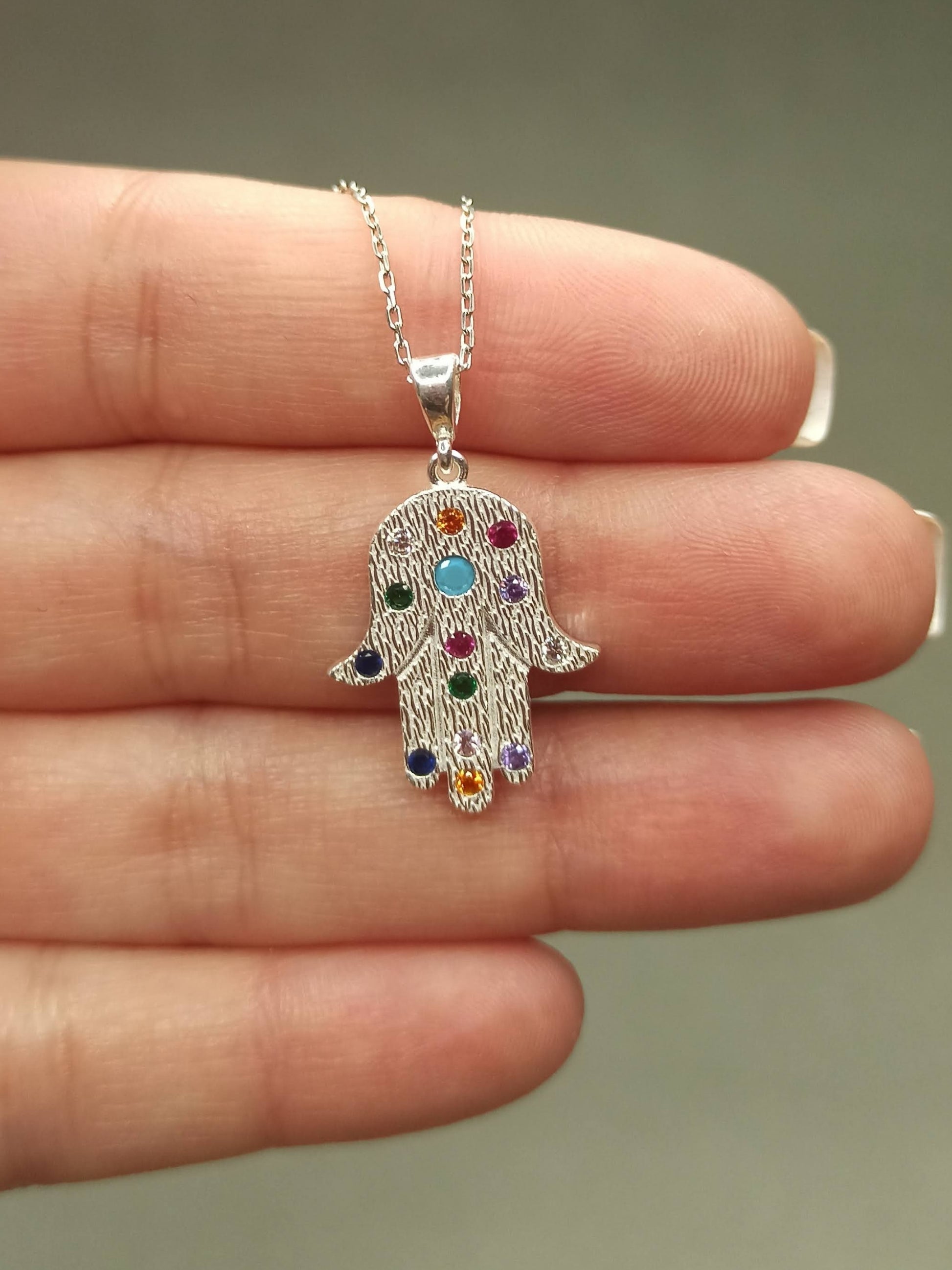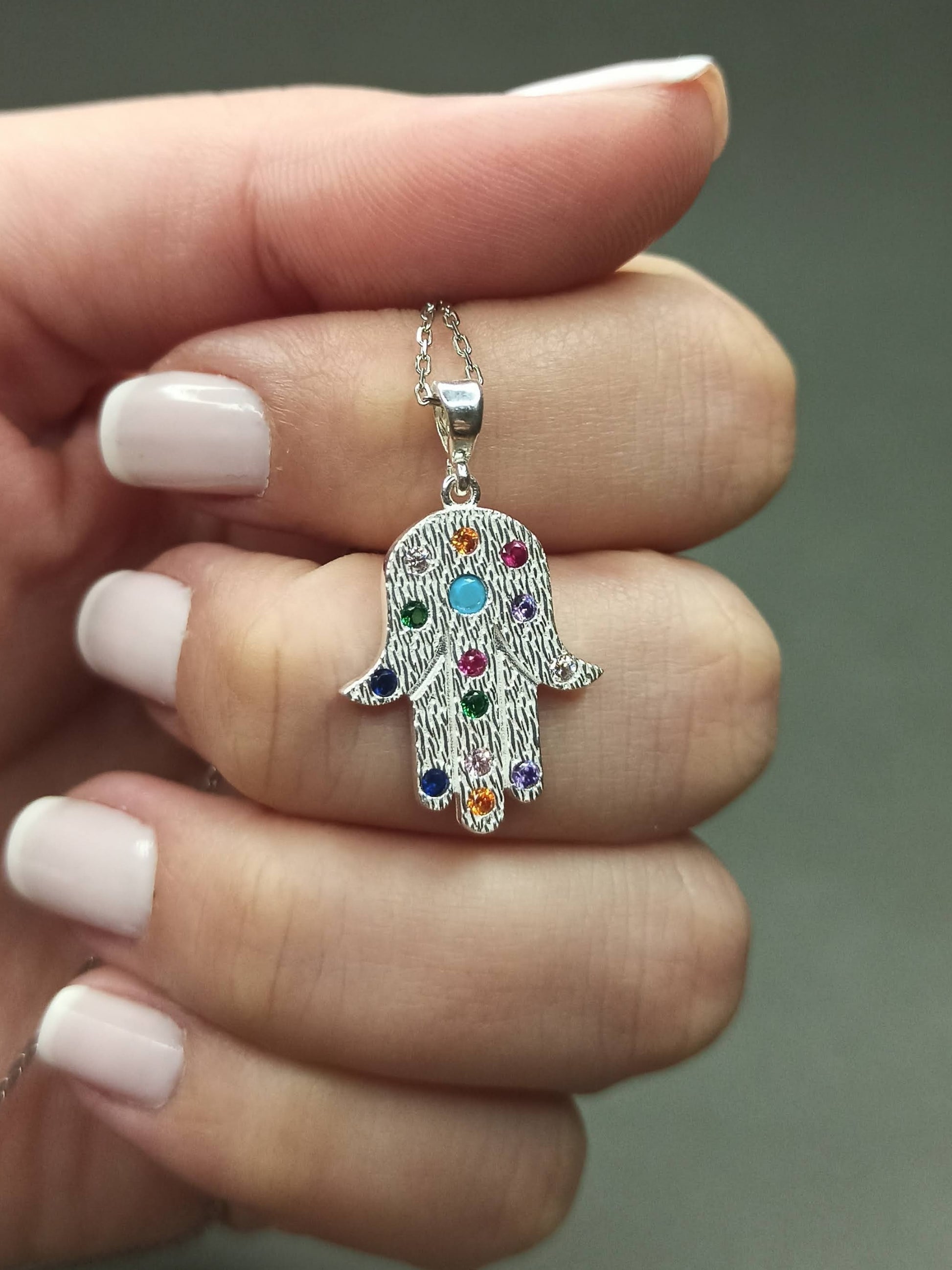 Bu el yapımı Hamsa kolye, zengin dokuya sahip yüzeyi ve renkli taş detaylarıyla hem zarif hem de anlamlı bir aksesuar sunar.