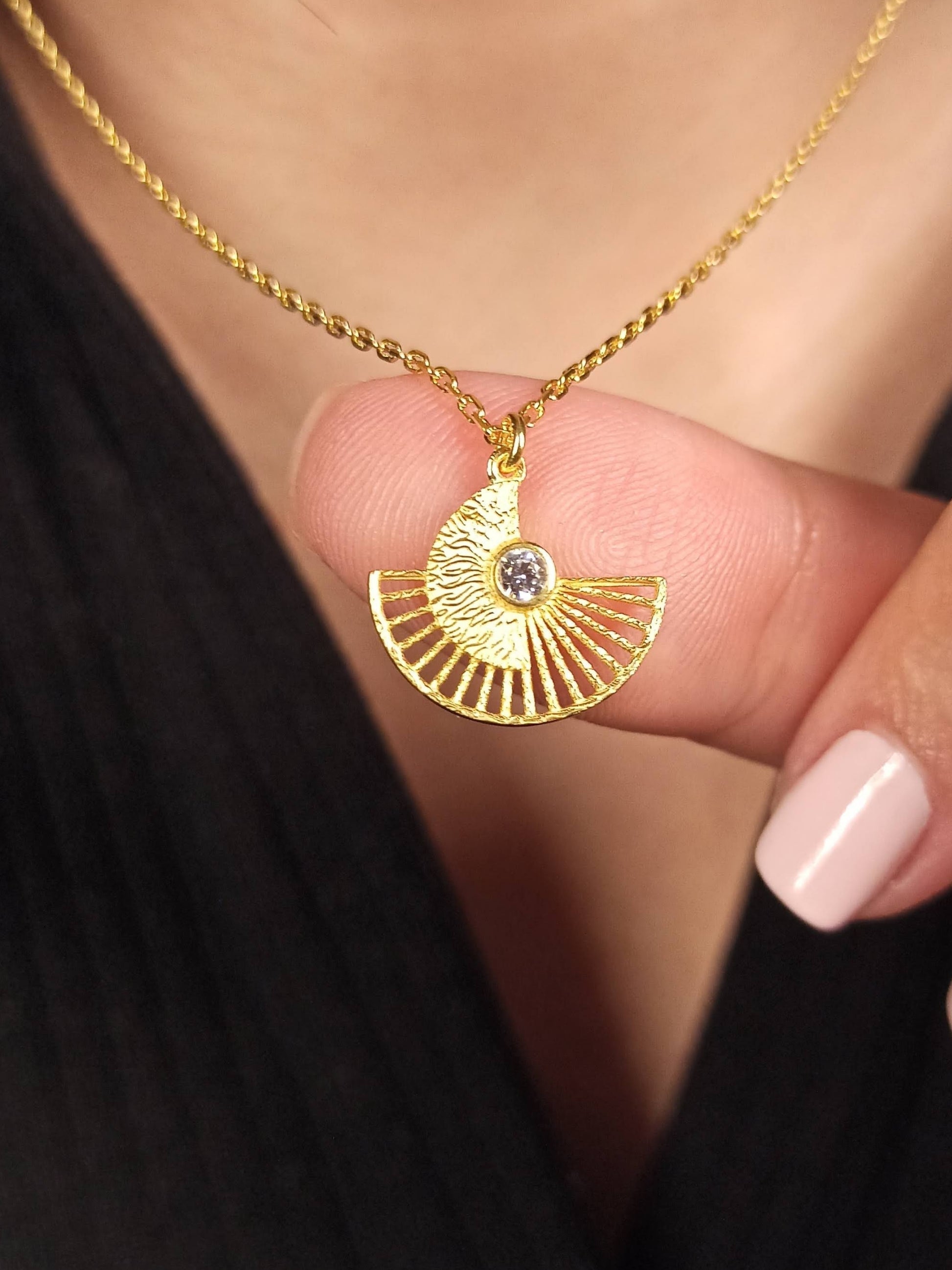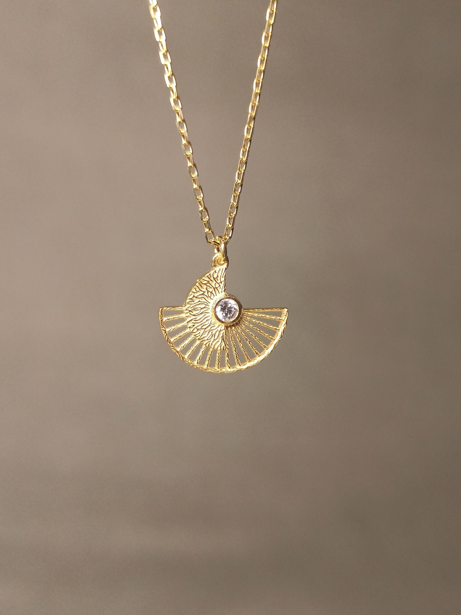 Güneş formlu Japon yelpazesi kolye, doğudan gelen zarafetle güneşin enerjisini birleştirir.