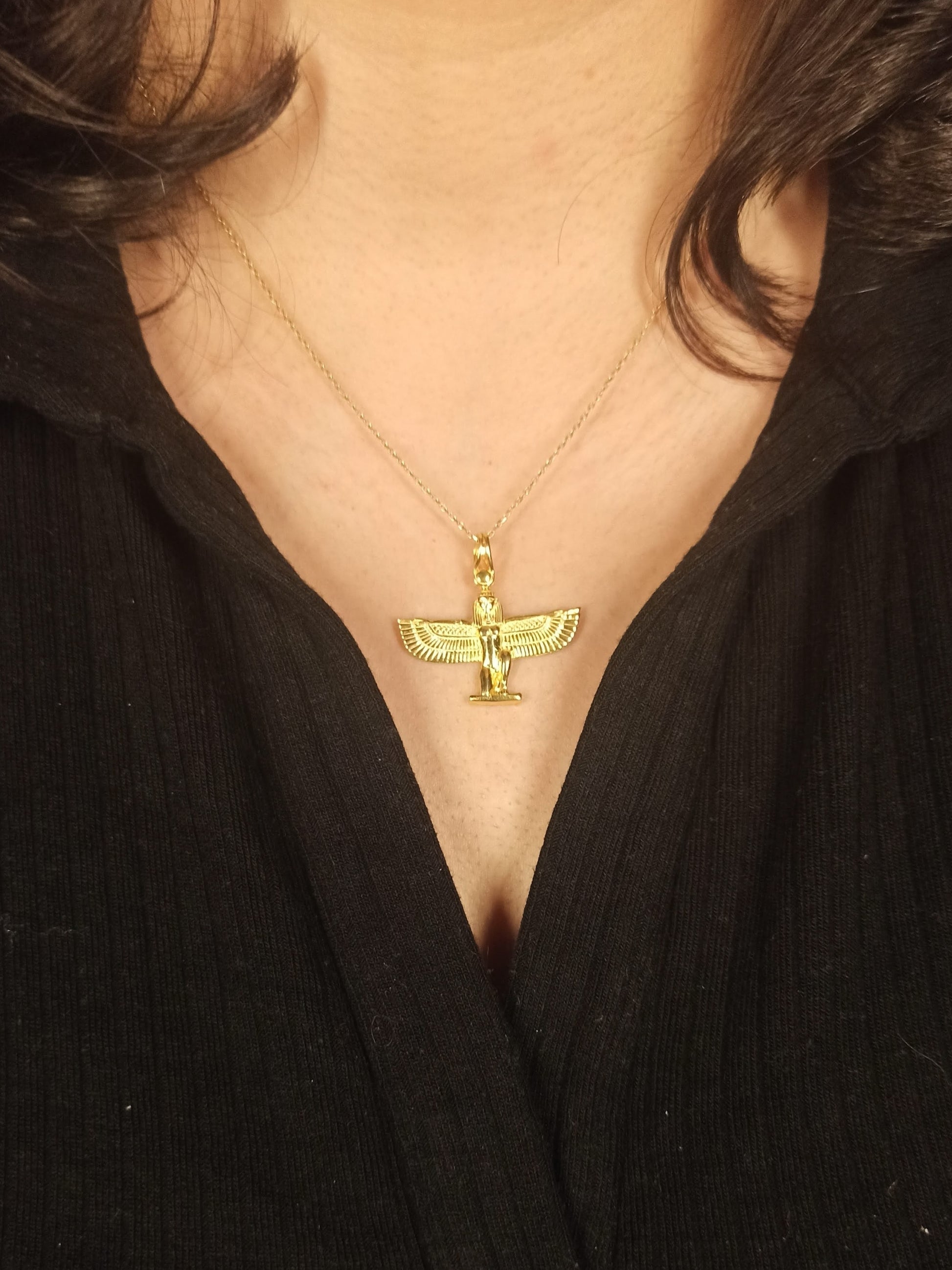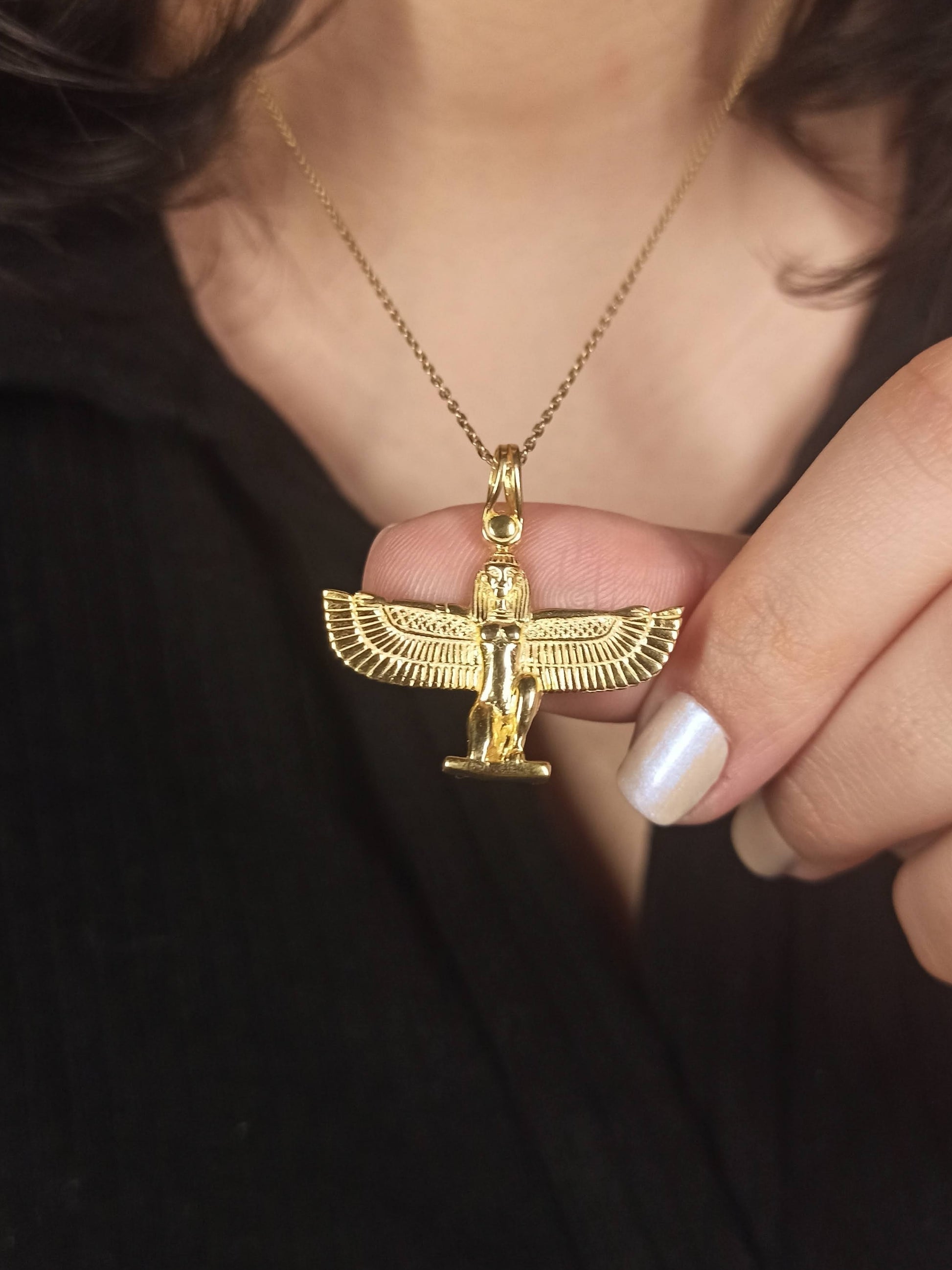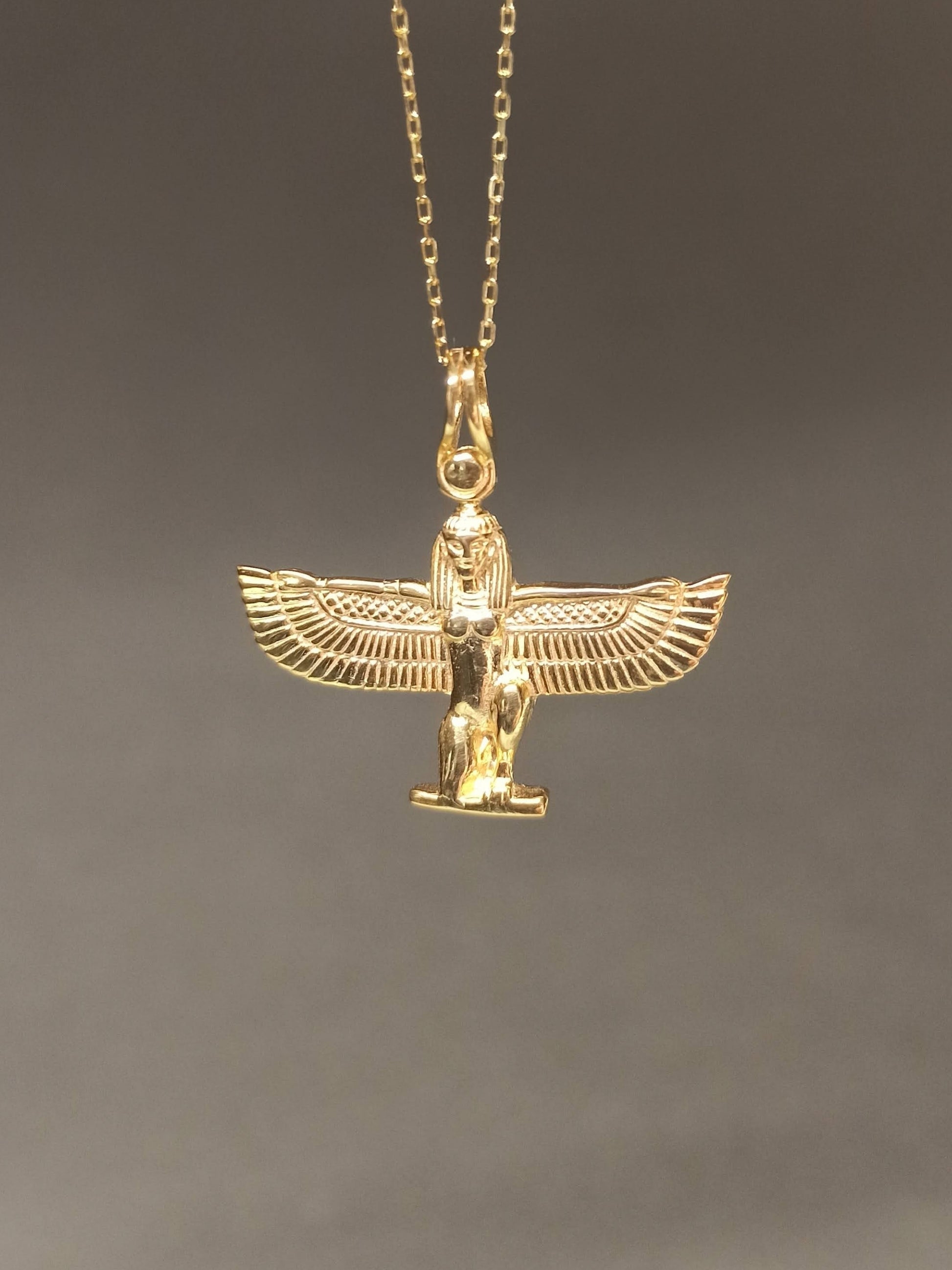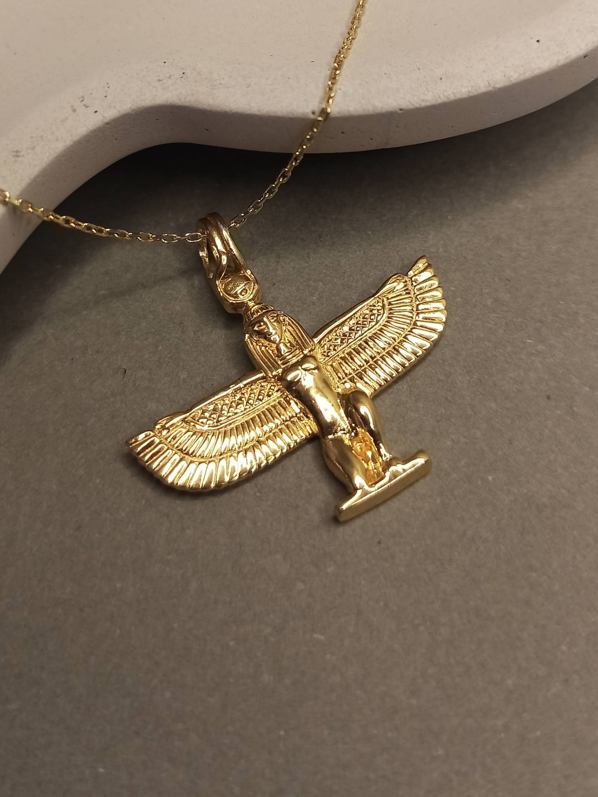 İsis Sembolü: Kanatlı İsis kolye, koruma, annelik, şifa ve ruhsal güç sembolüdür. Antik Mısır mitolojisinde İsis, büyü ve koruyucu enerjiyi temsil eder. Kolye, kullanıcıya pozitif enerji, güç ve içsel denge sağlar.