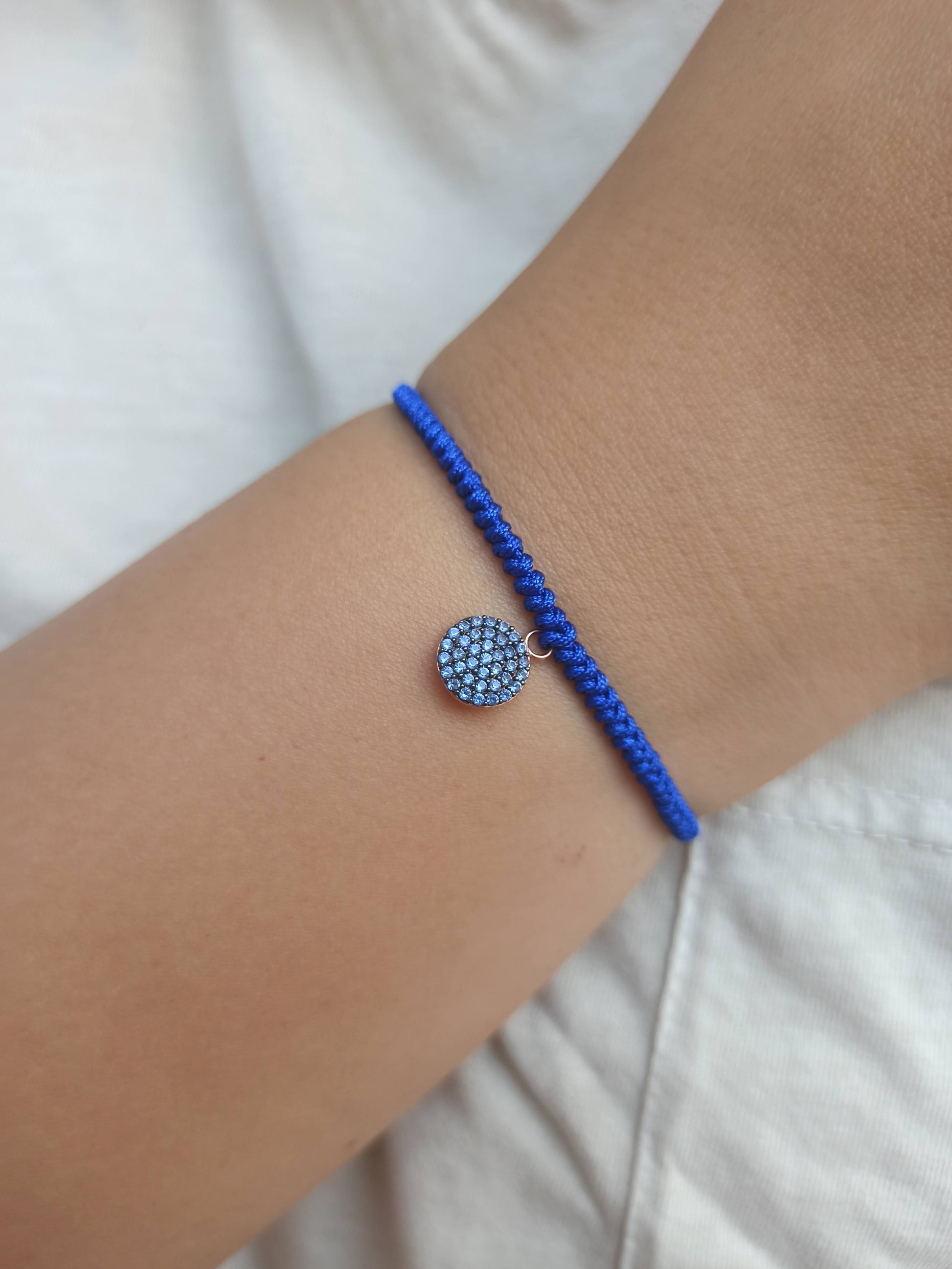 925 ayar gümüş , rose gold kaplamalı , mavi zirkon taşlı yuvarlak charm'lı ipli bileklik.
