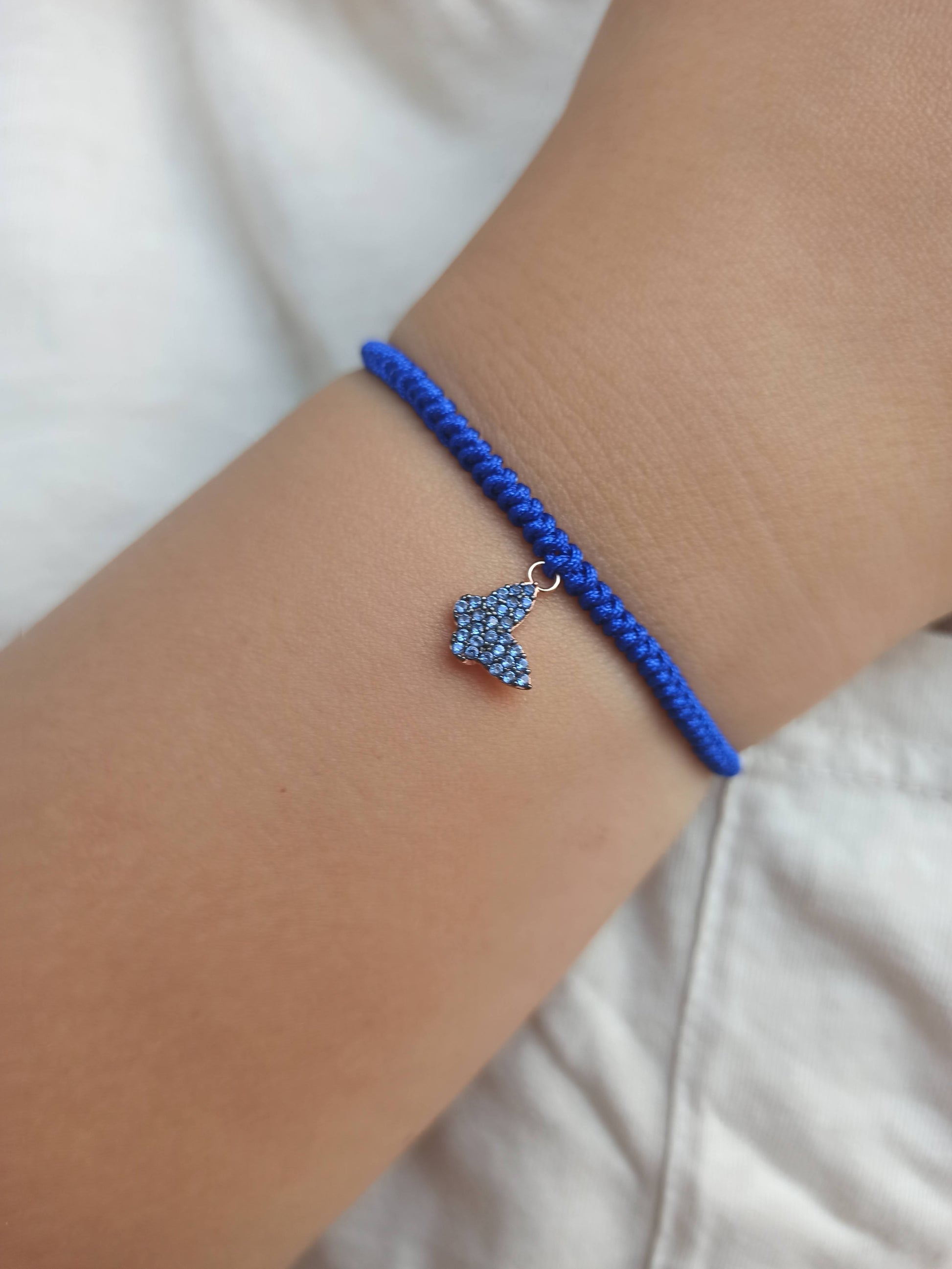925 ayar gümüş , rose gold kaplamalı , mavi zirkon taşlı kelebek charm'lı ipli bileklik.