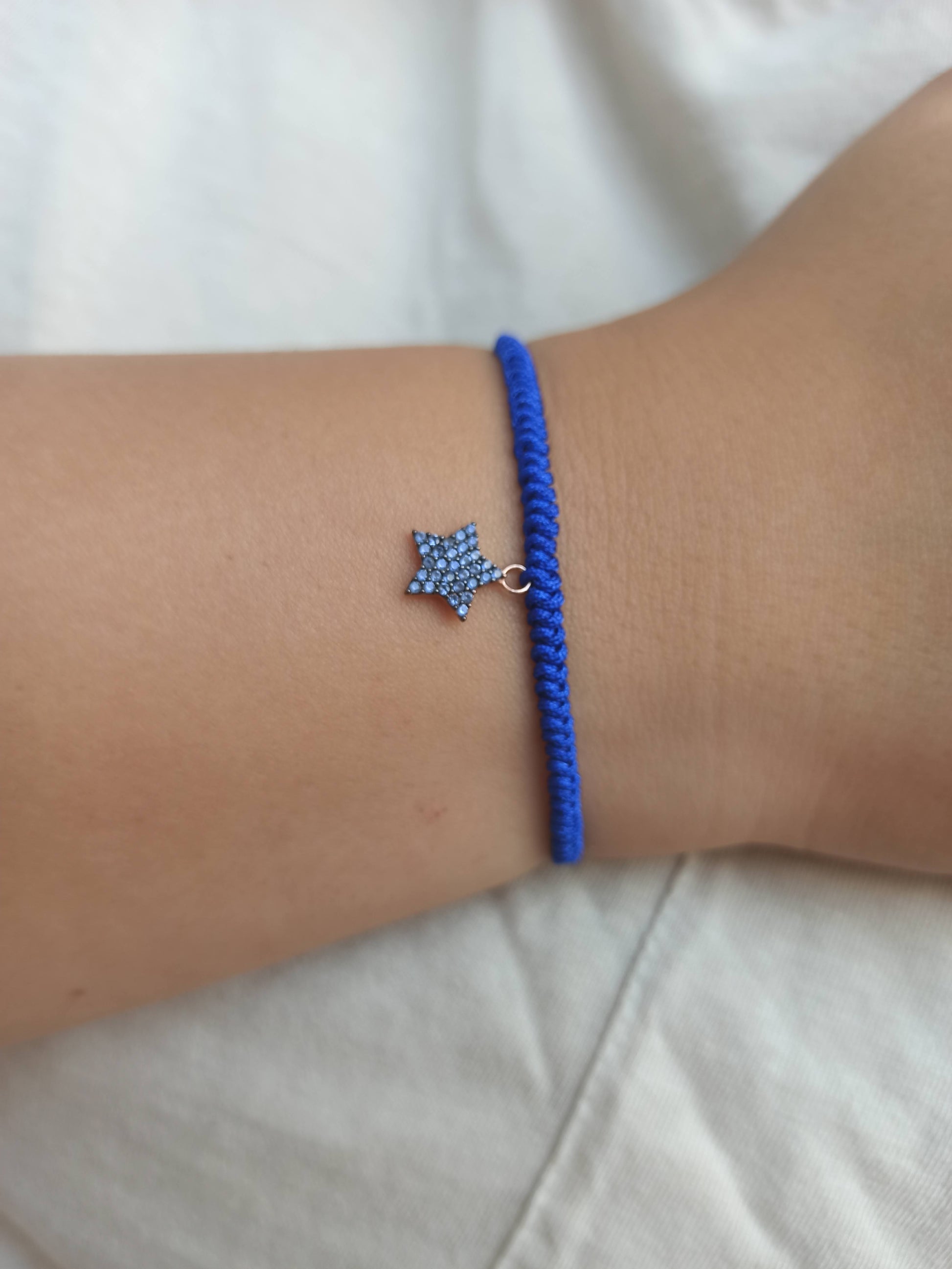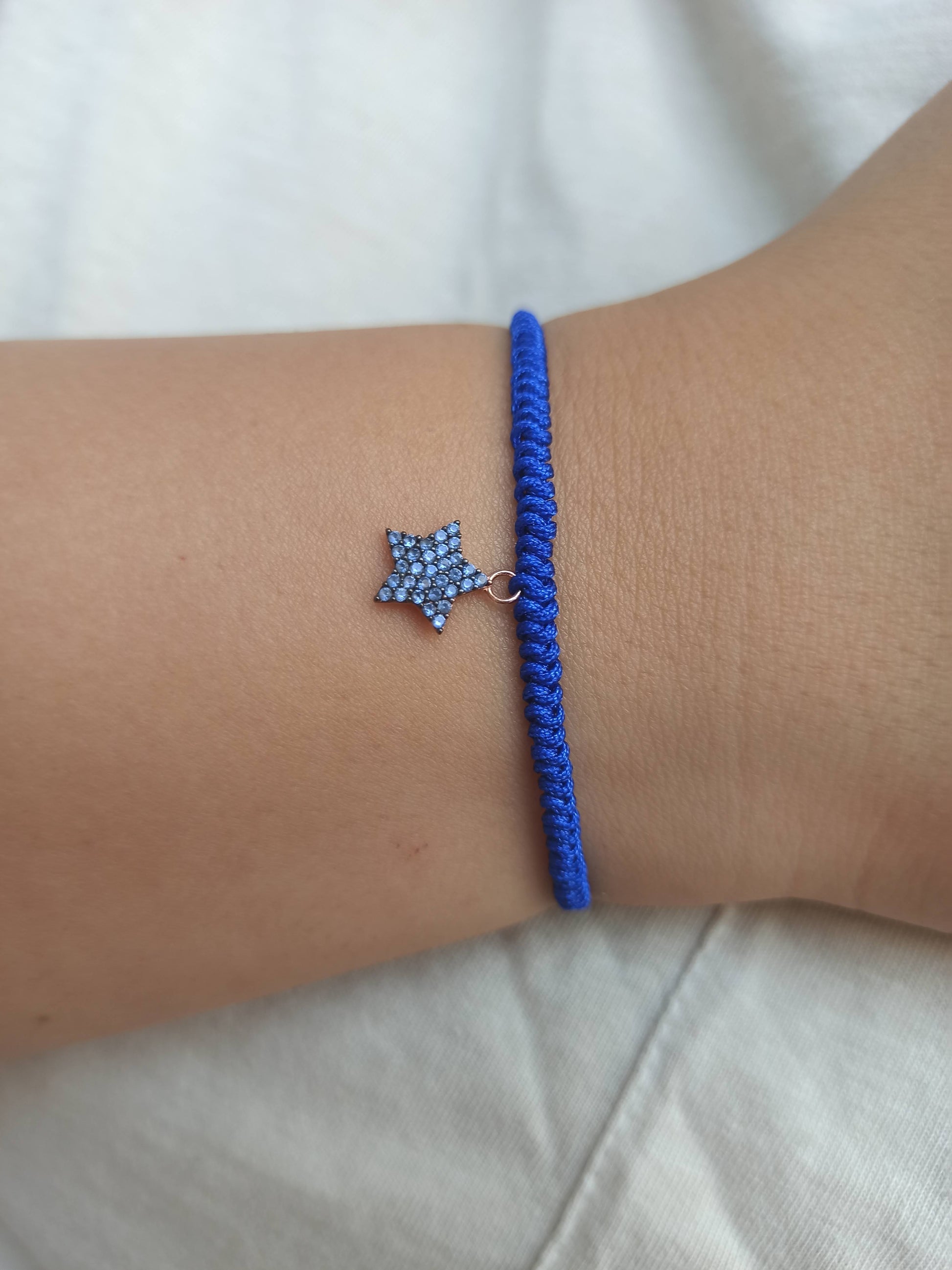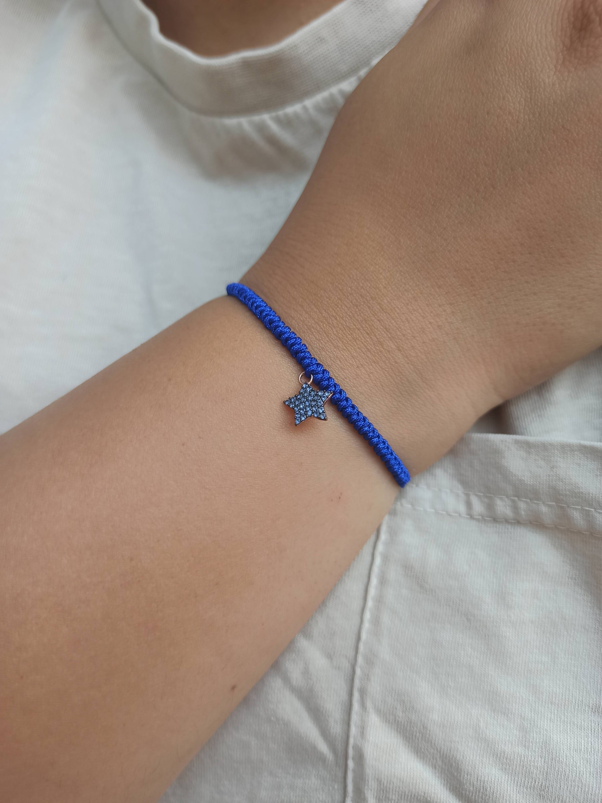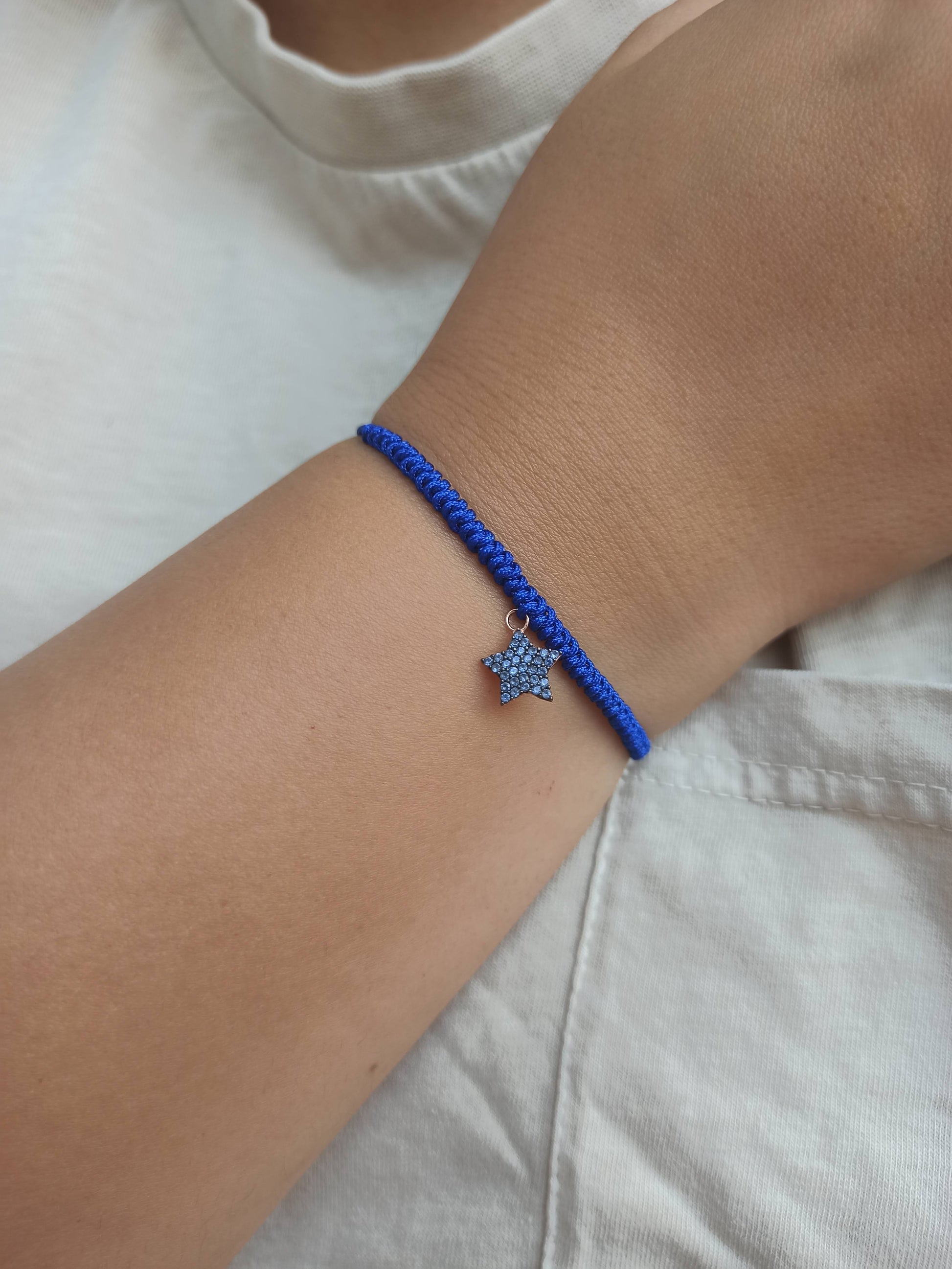 925 ayar gümüş , rose gold kaplamalı , mavi zirkon taşlı yıldız charm'lı ipli bileklik.