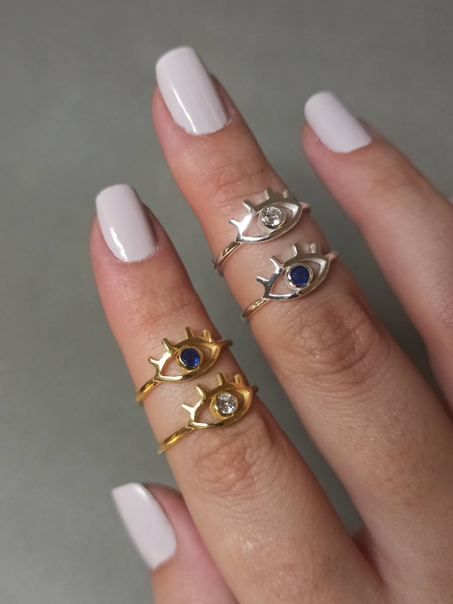 Zarif stilize edilmiş kirpik ve kaş detaylarıyla bu yüzükler, tek başına veya katmanlı yüzük kombinlerinizin odak noktası olacaktır.