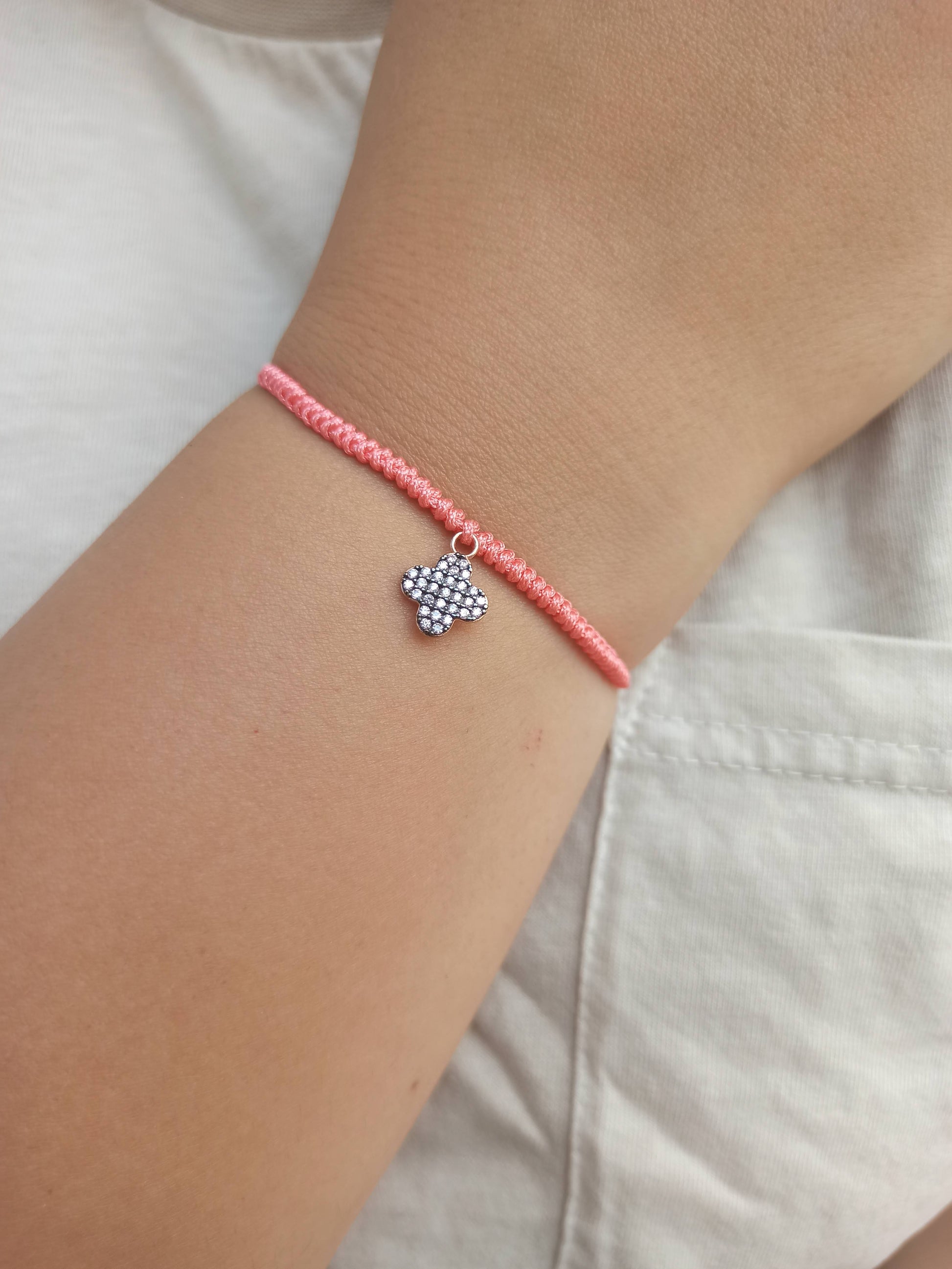 Pembe taşlı gümüş 4 yapraklı yonca ipli bileklik
