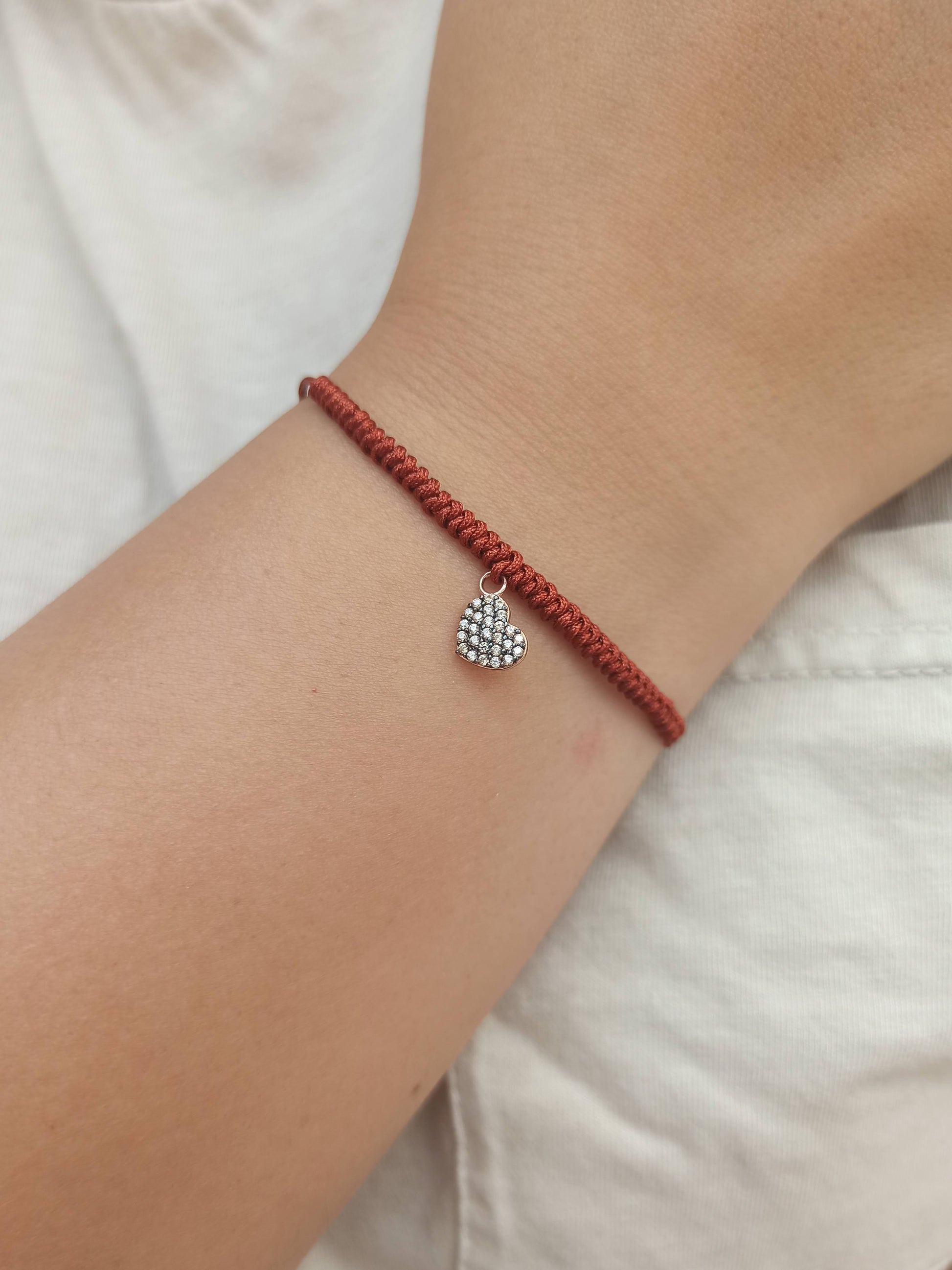 925 ayar gümüş , rose gold kaplamalı , şampanya zirkon taşlı kalp charm'lı ipli bileklik.