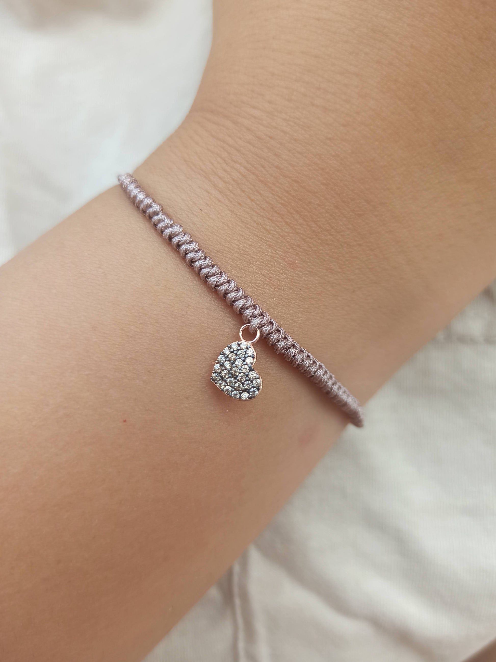 Şampanya taşlı gümüş kalp charm ipli bileklik