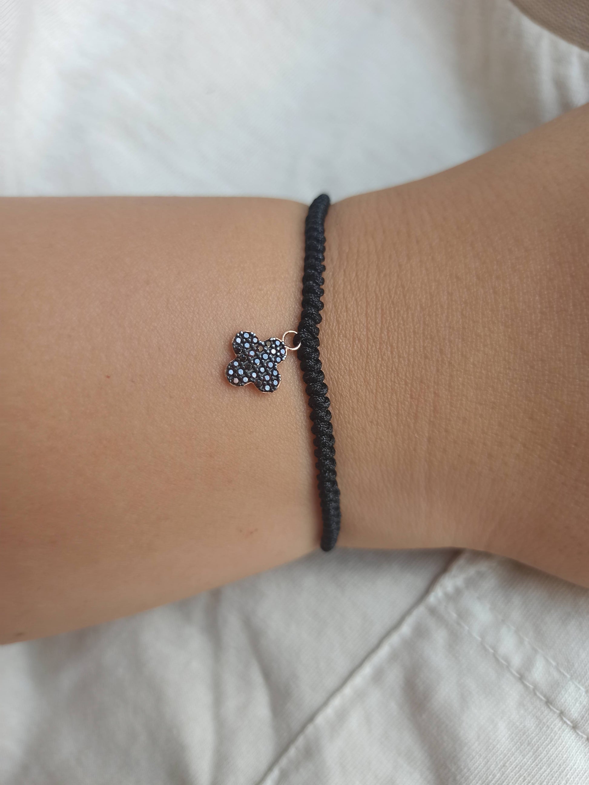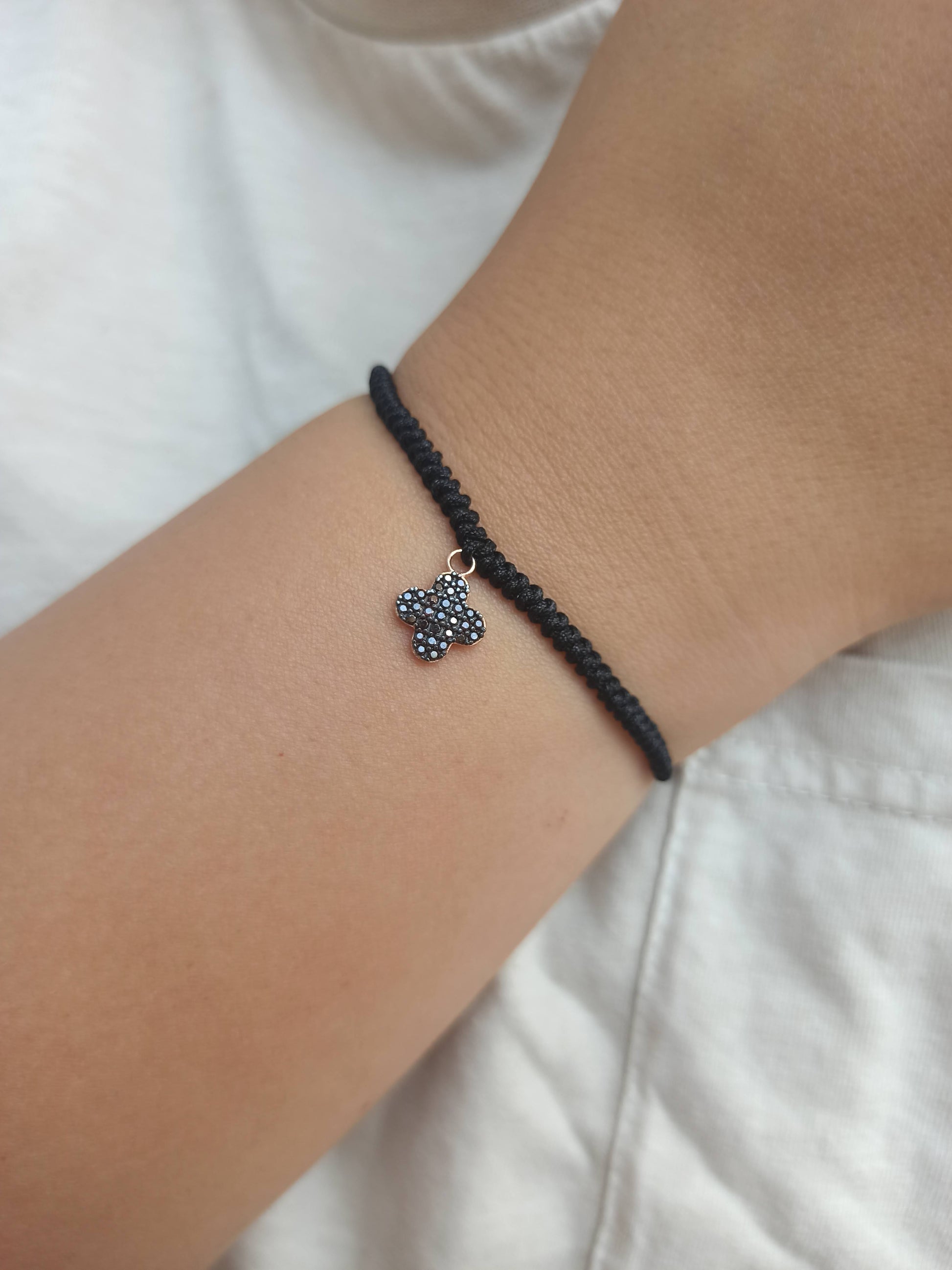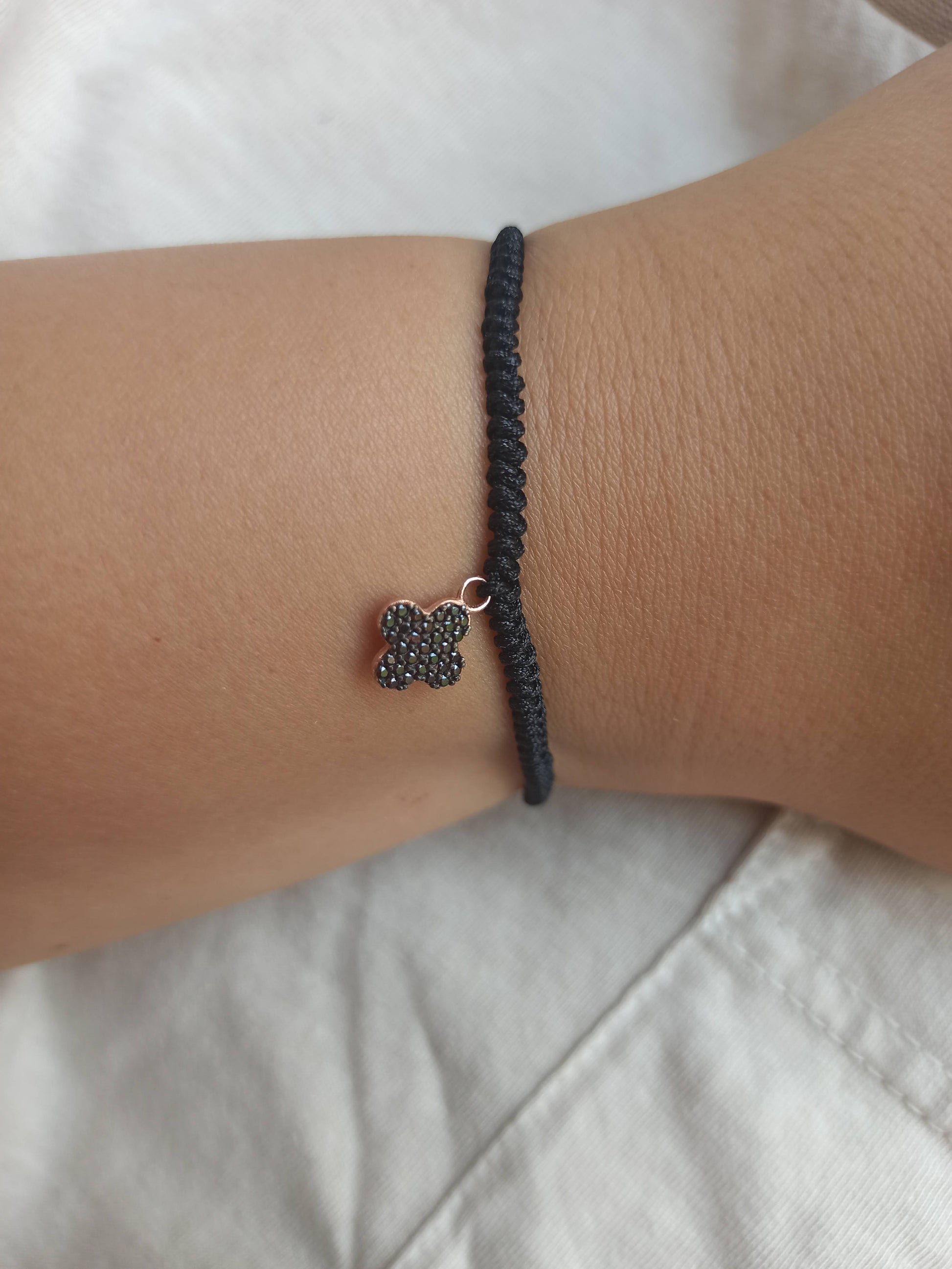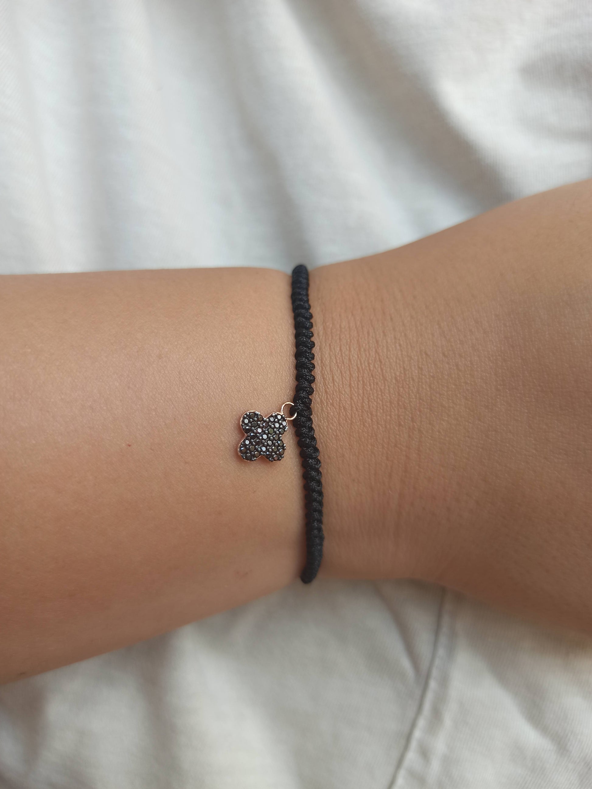 925 ayar gümüş , rose gold kaplamalı , siyah zirkon taşlı dört yapraklı yonca charm'lı ipli bileklik.