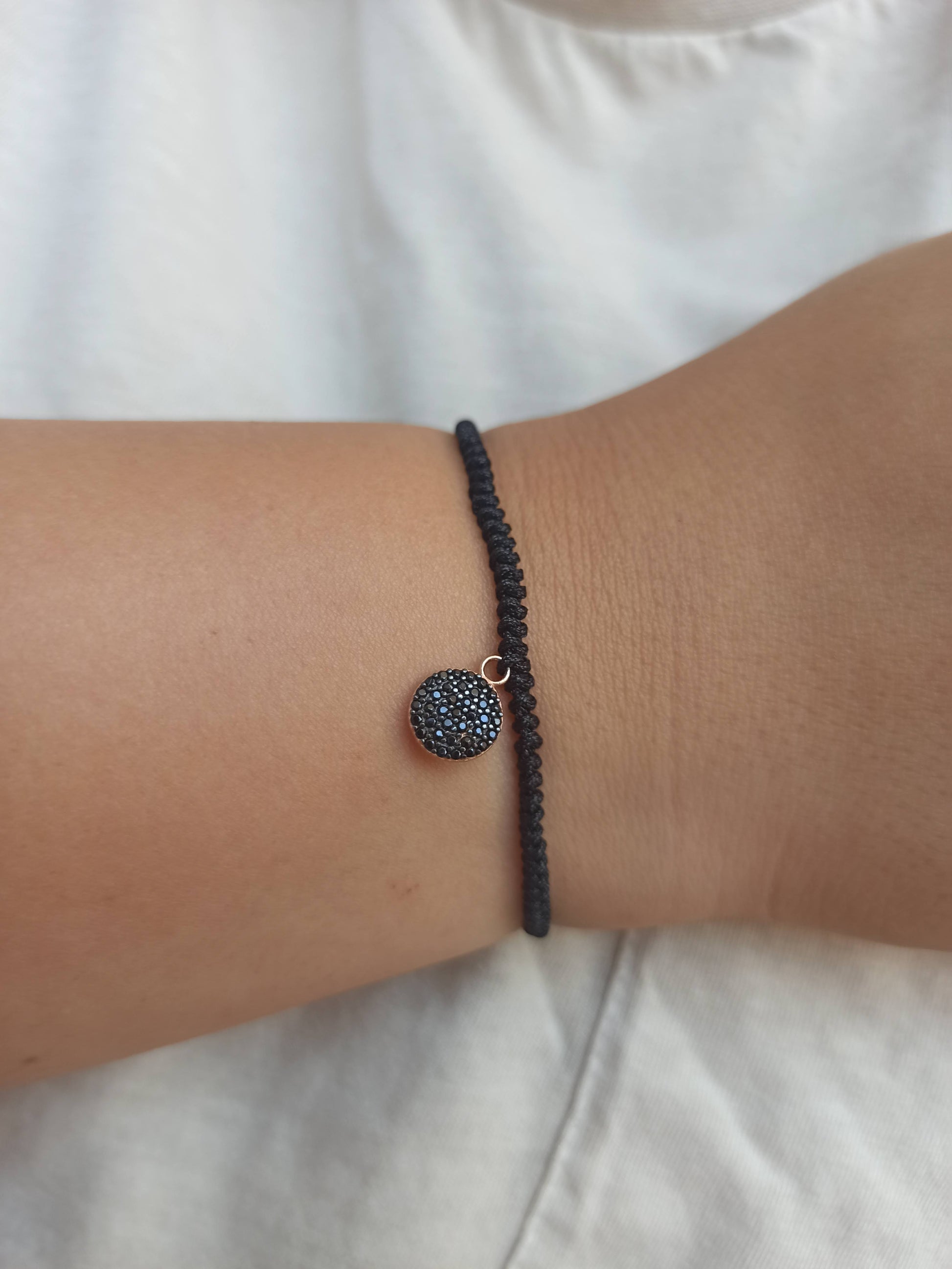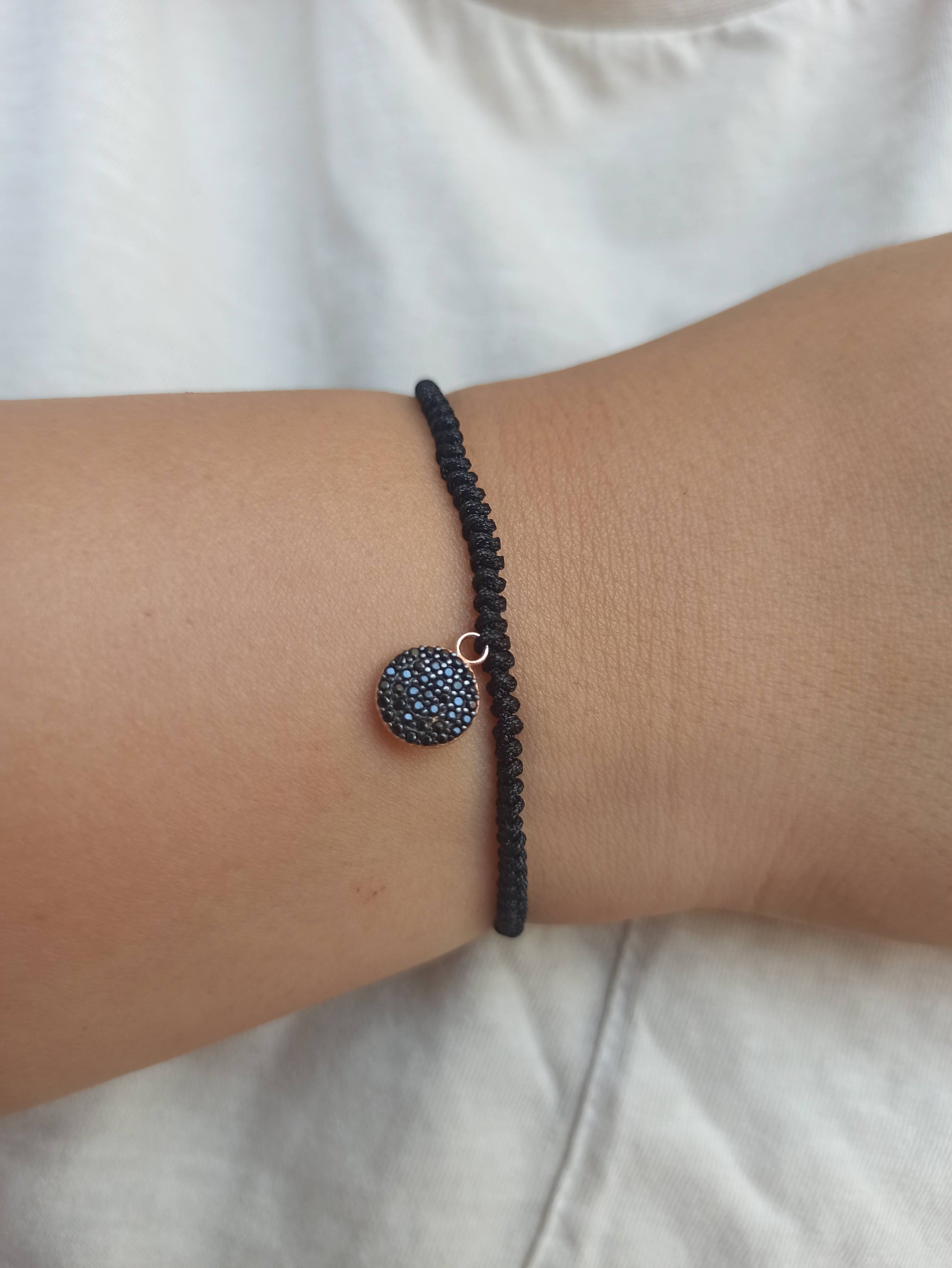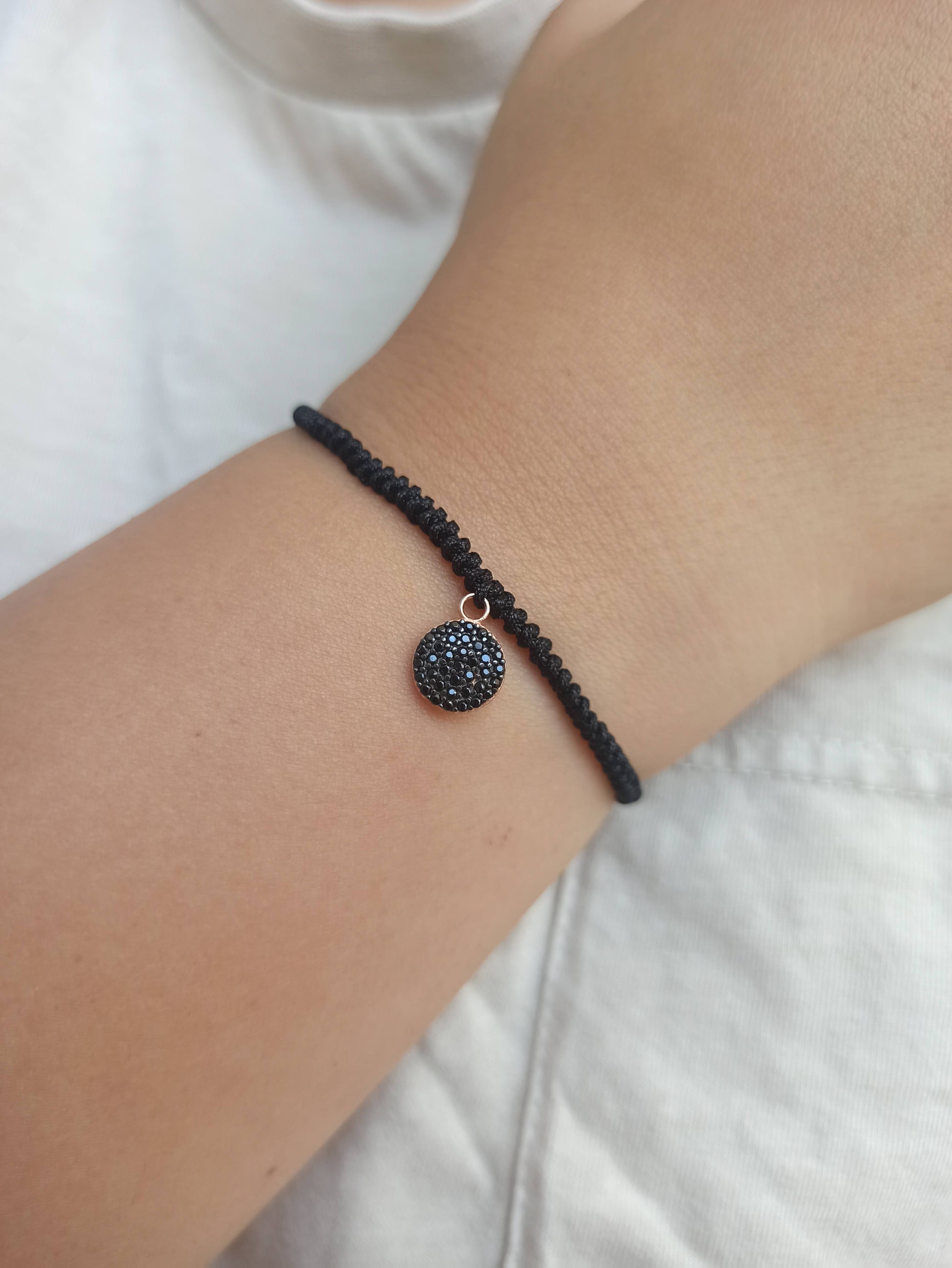 925 ayar gümüş , rose gold kaplamalı , siyah zirkon taşlı yuvarlak charm'lı ipli bileklik.