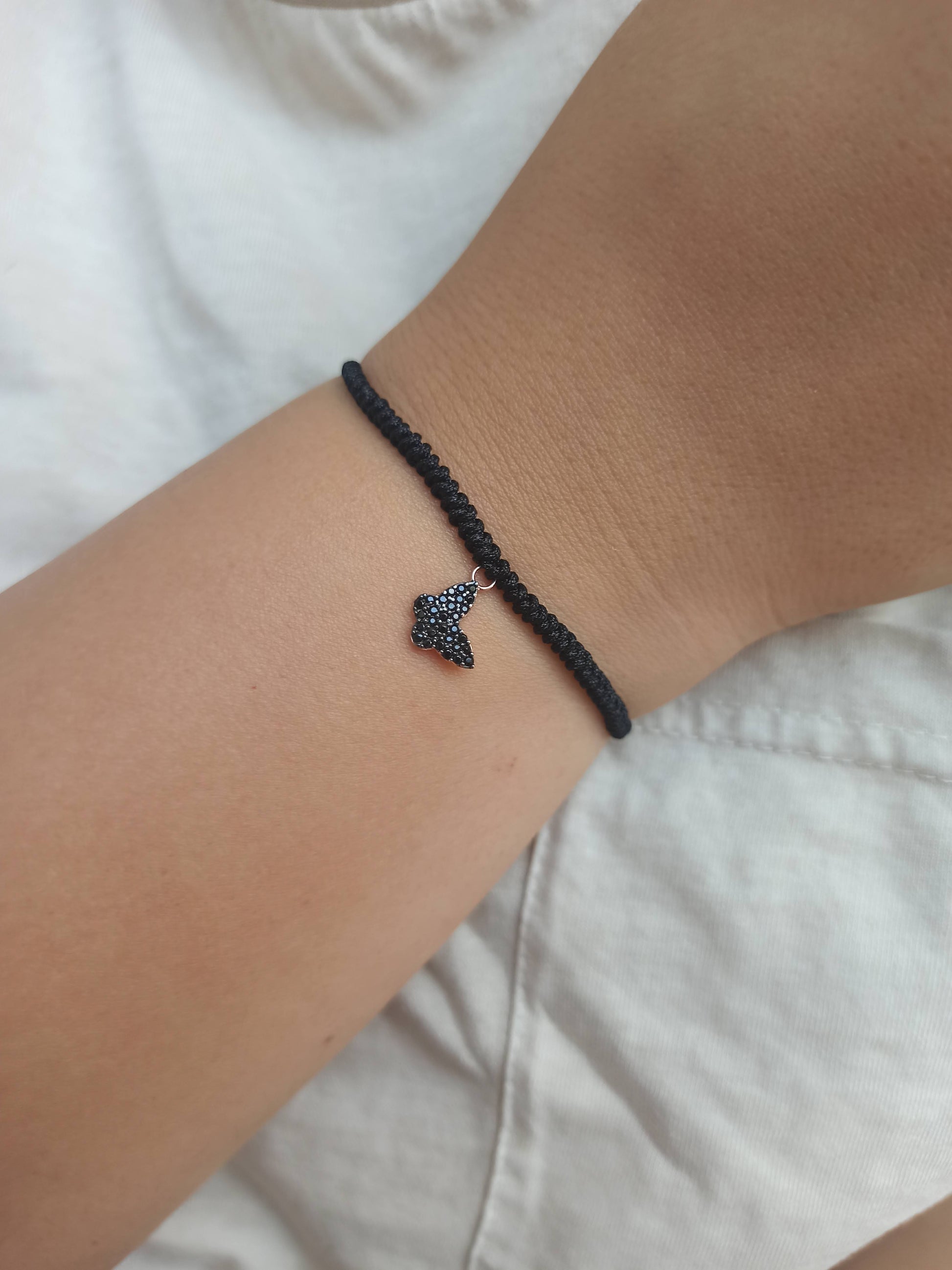 925 ayar gümüş , rose gold kaplamalı , siyah zirkon taşlı kelebek charm'lı ipli bileklik.