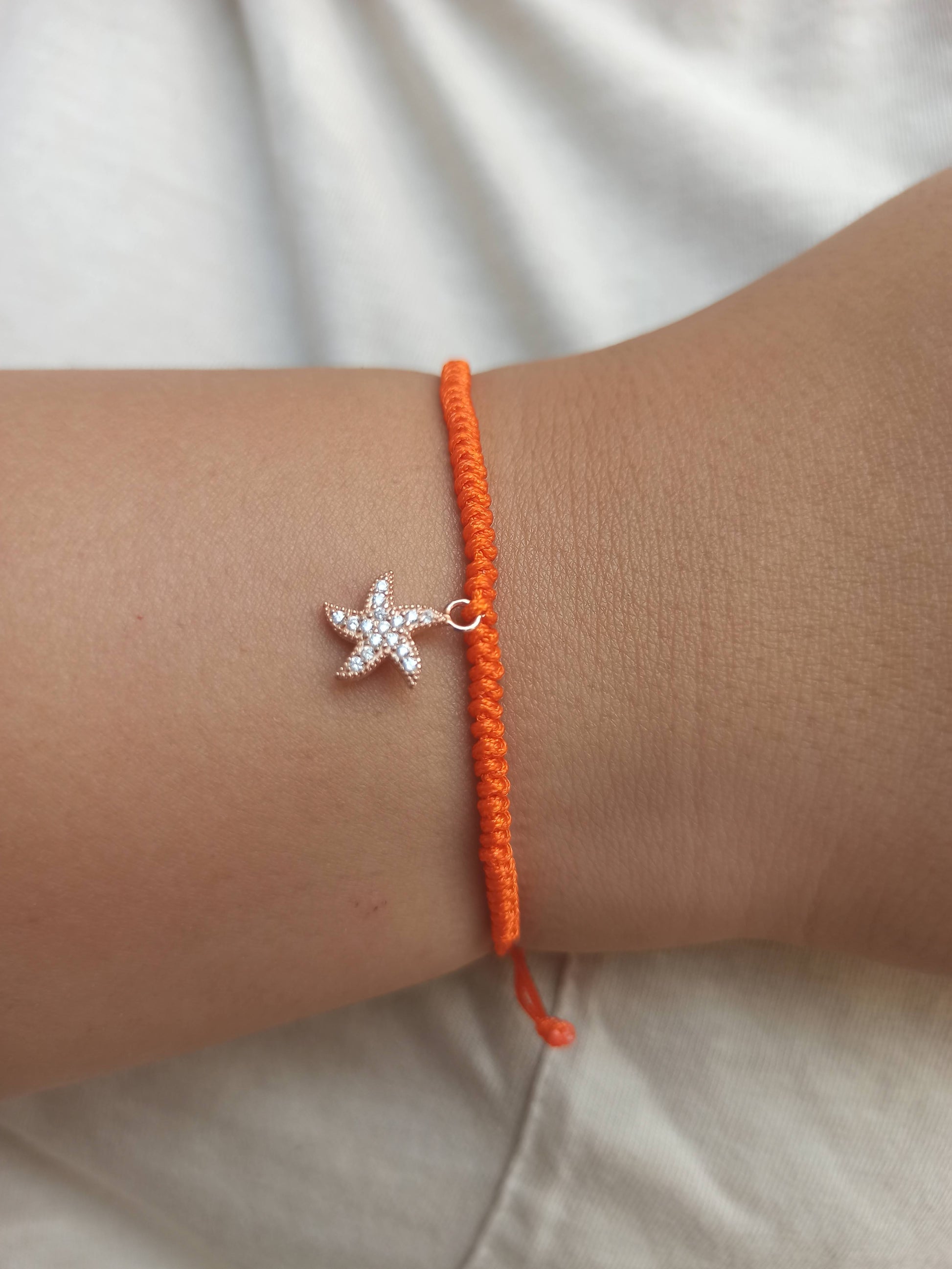 925 ayar gümüş , rose gold kaplamalı , beyaz zirkon taşlı deniz yıldızı charm'lı turuncu ipli bileklik.
