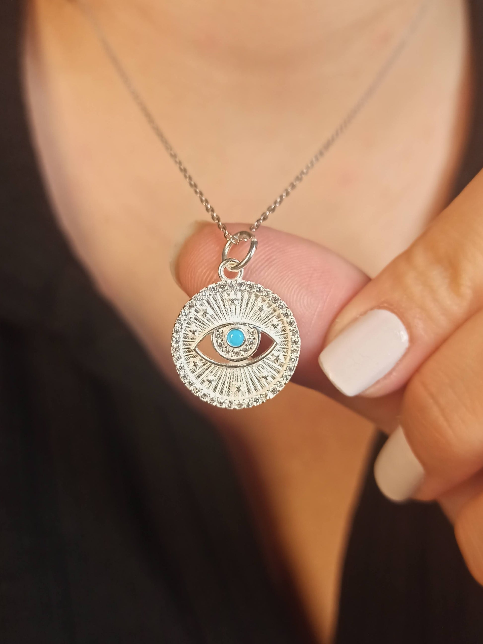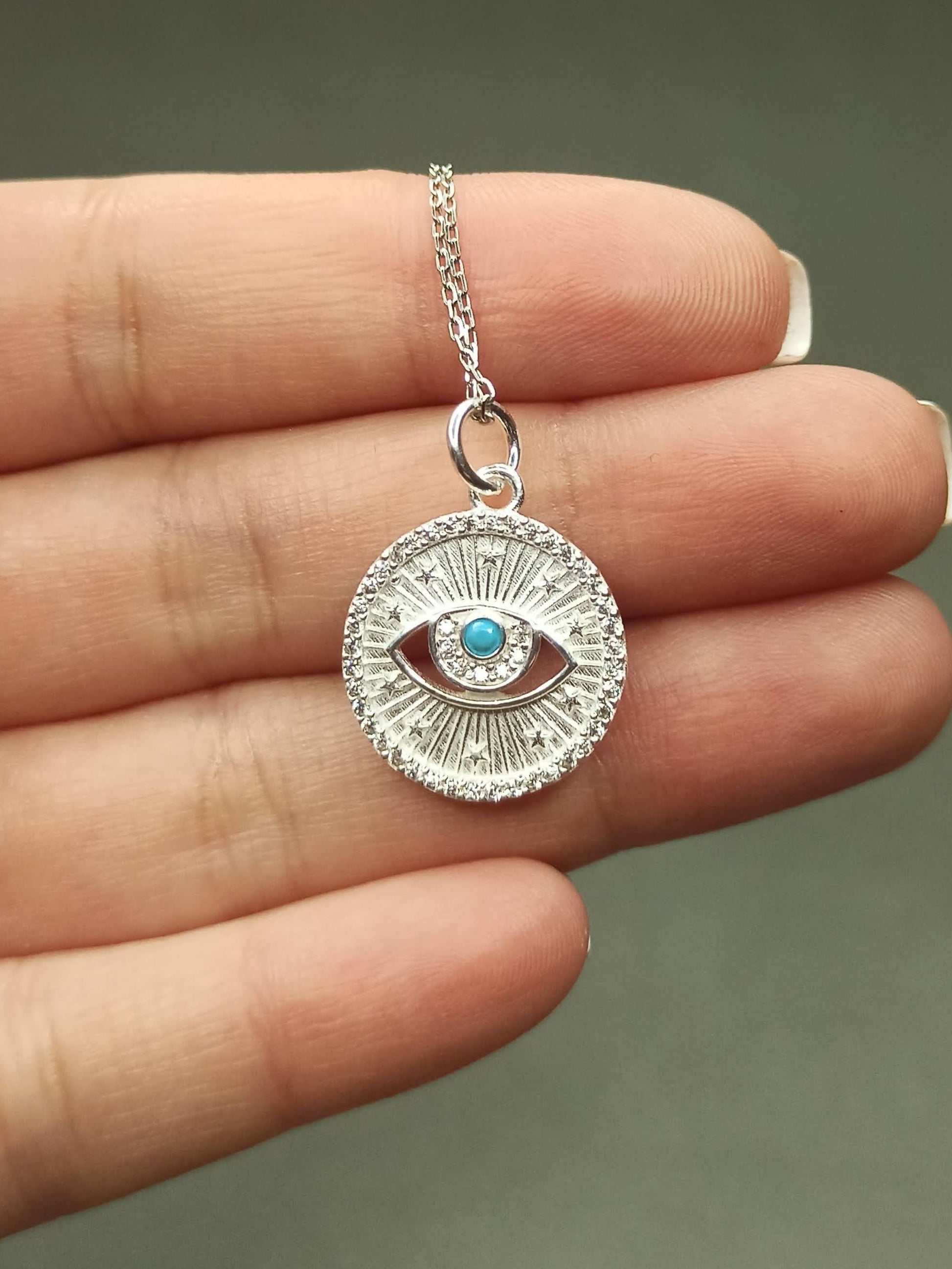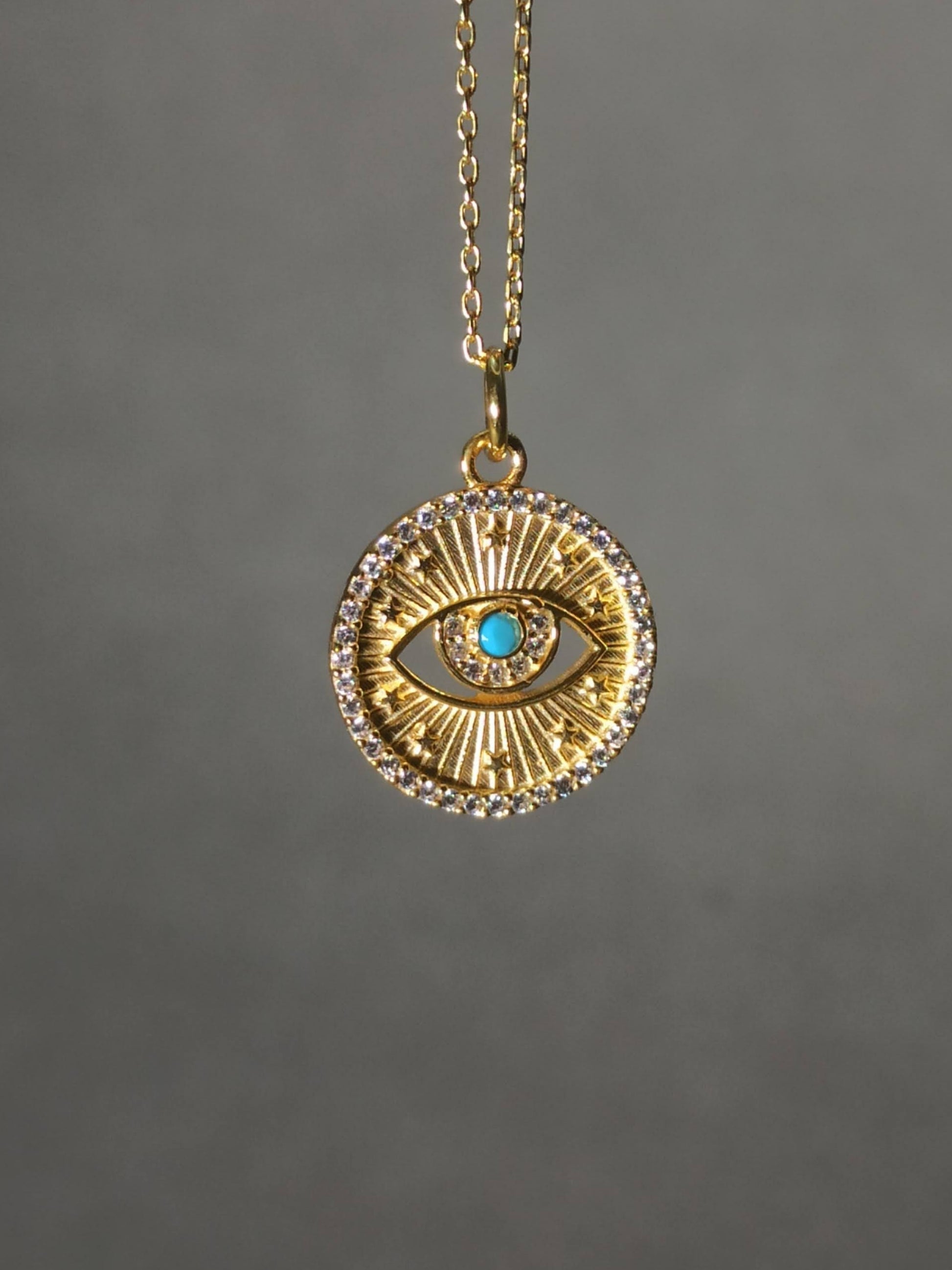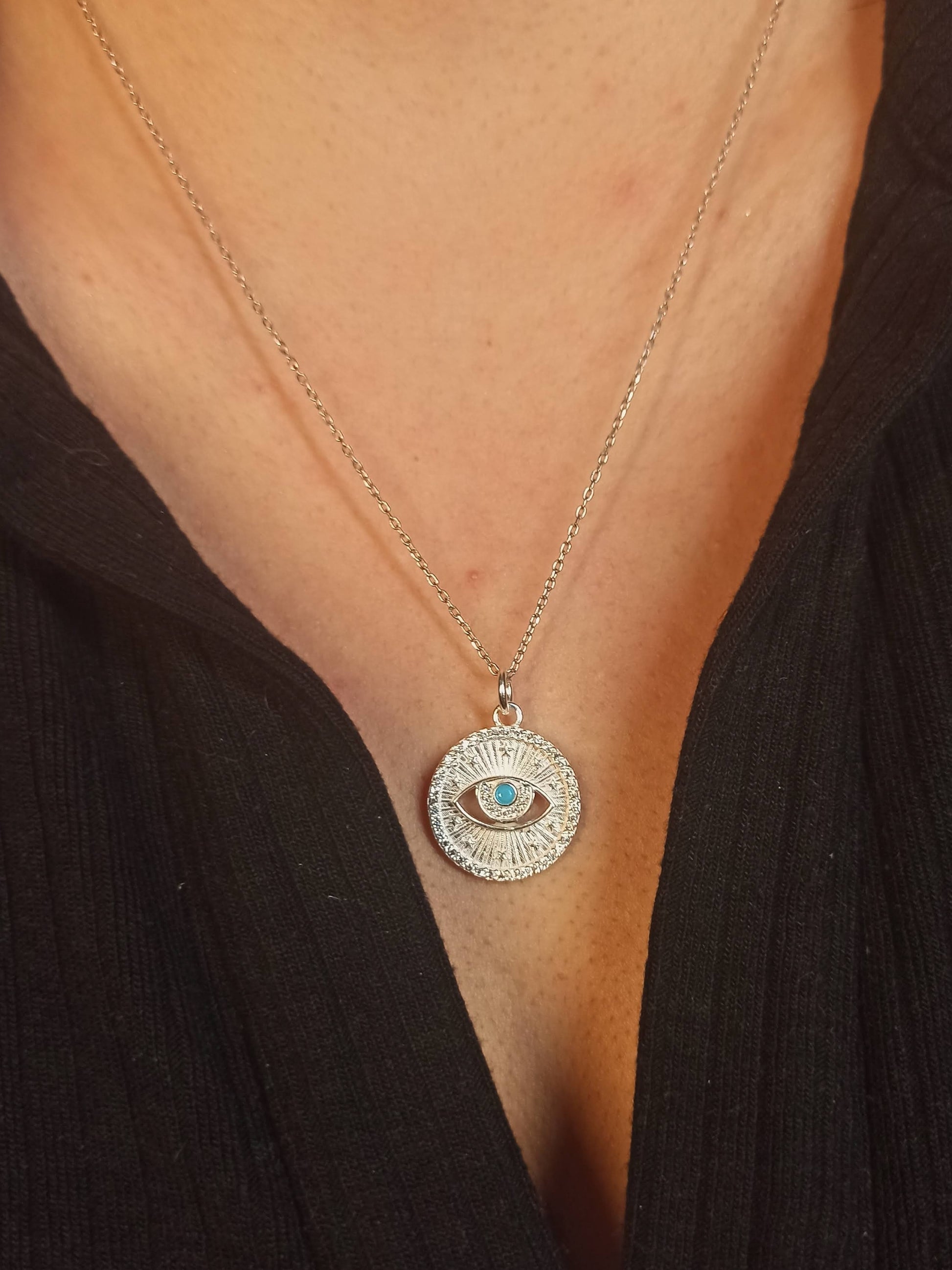 Bu turkuaz taşlı göz madalyon kolye, koruma ve denge sembolizmini bir araya getiren özel bir el yapımı tasarımdır.
