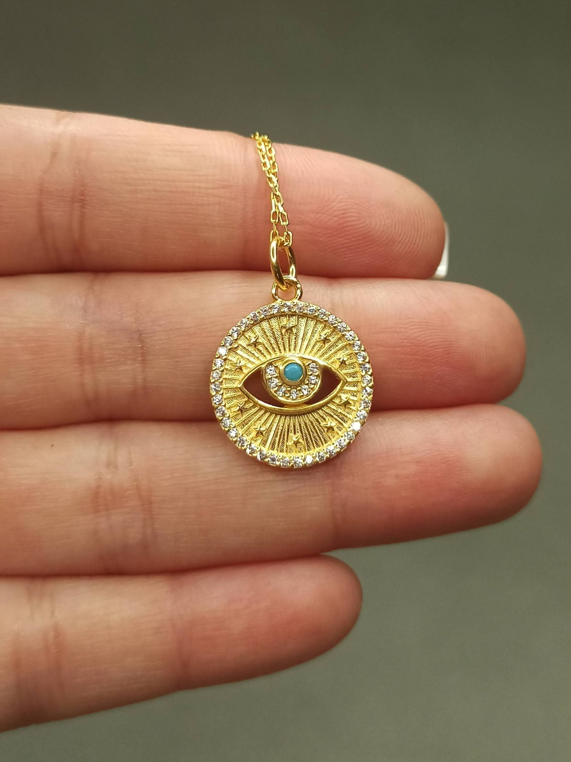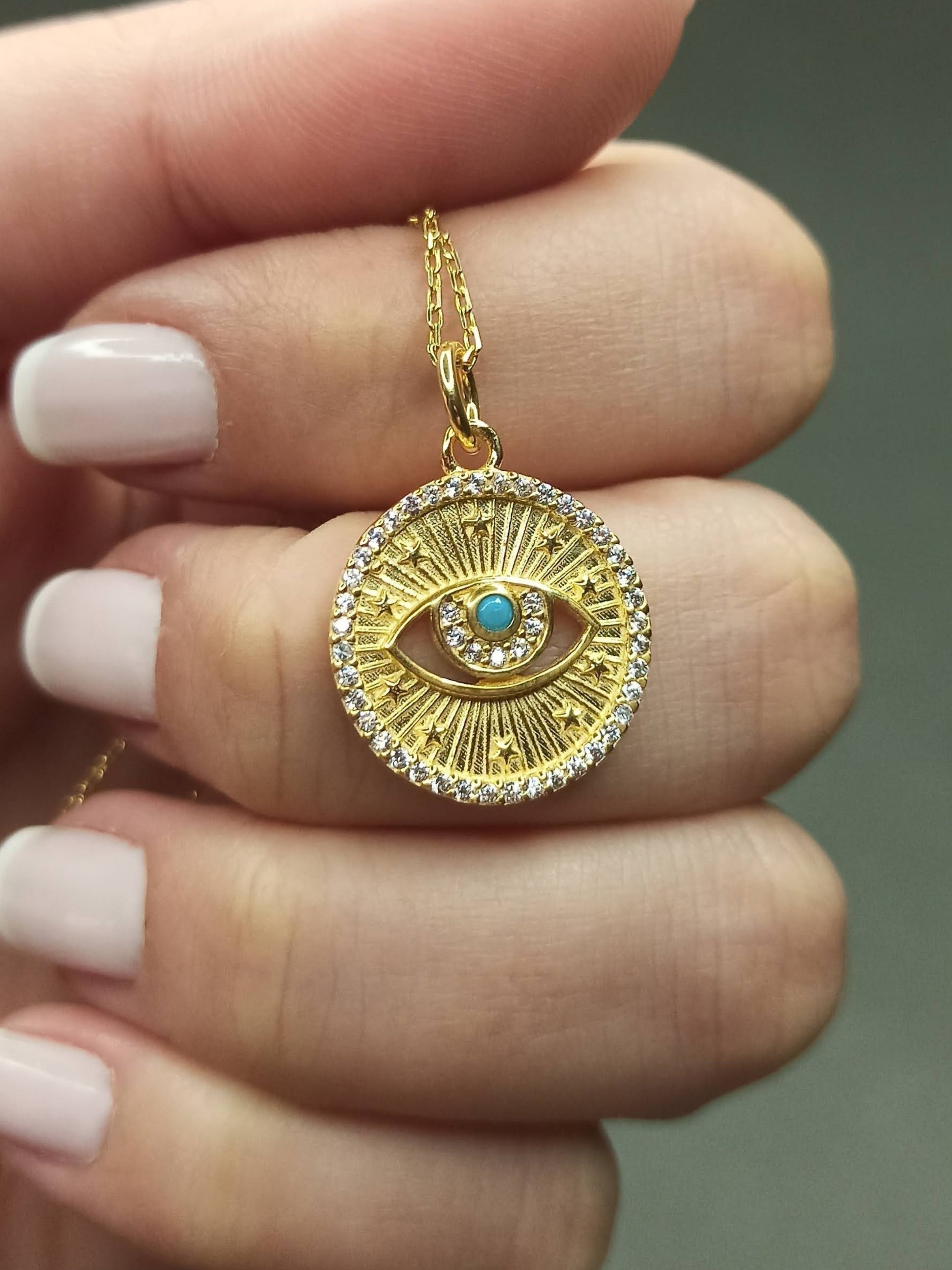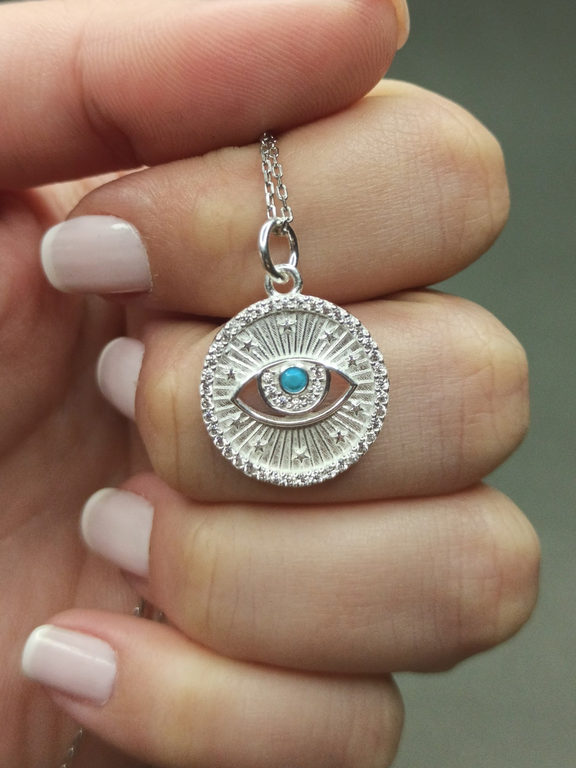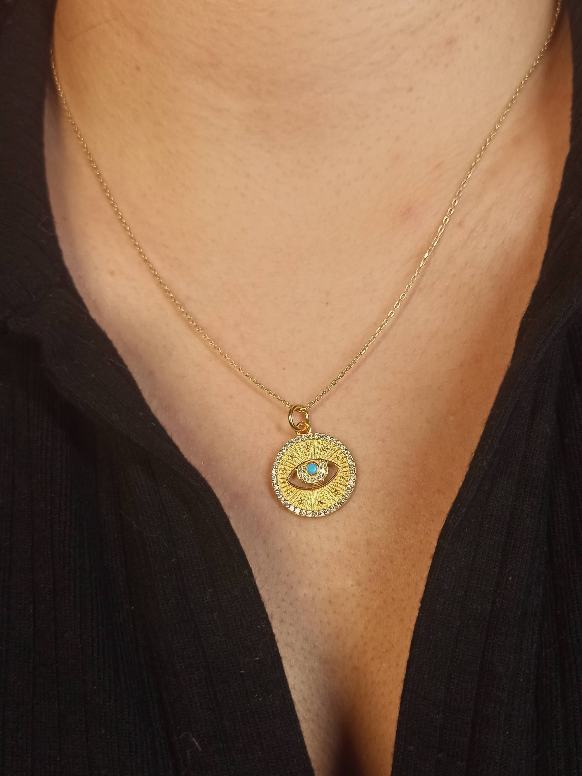 Bu turkuaz taşlı göz madalyon kolye, koruma ve denge sembolizmini bir araya getiren özel bir el yapımı tasarımdır.