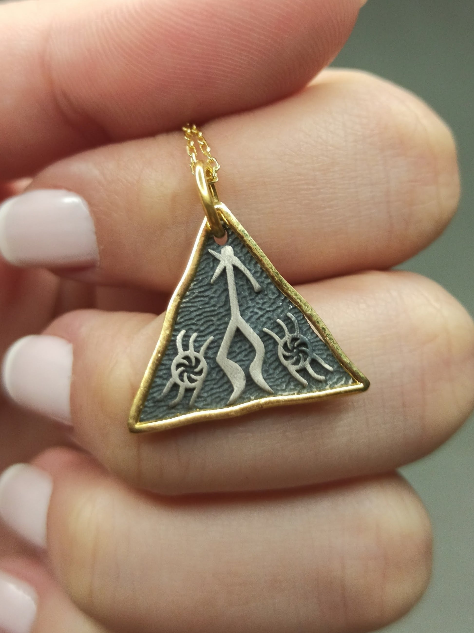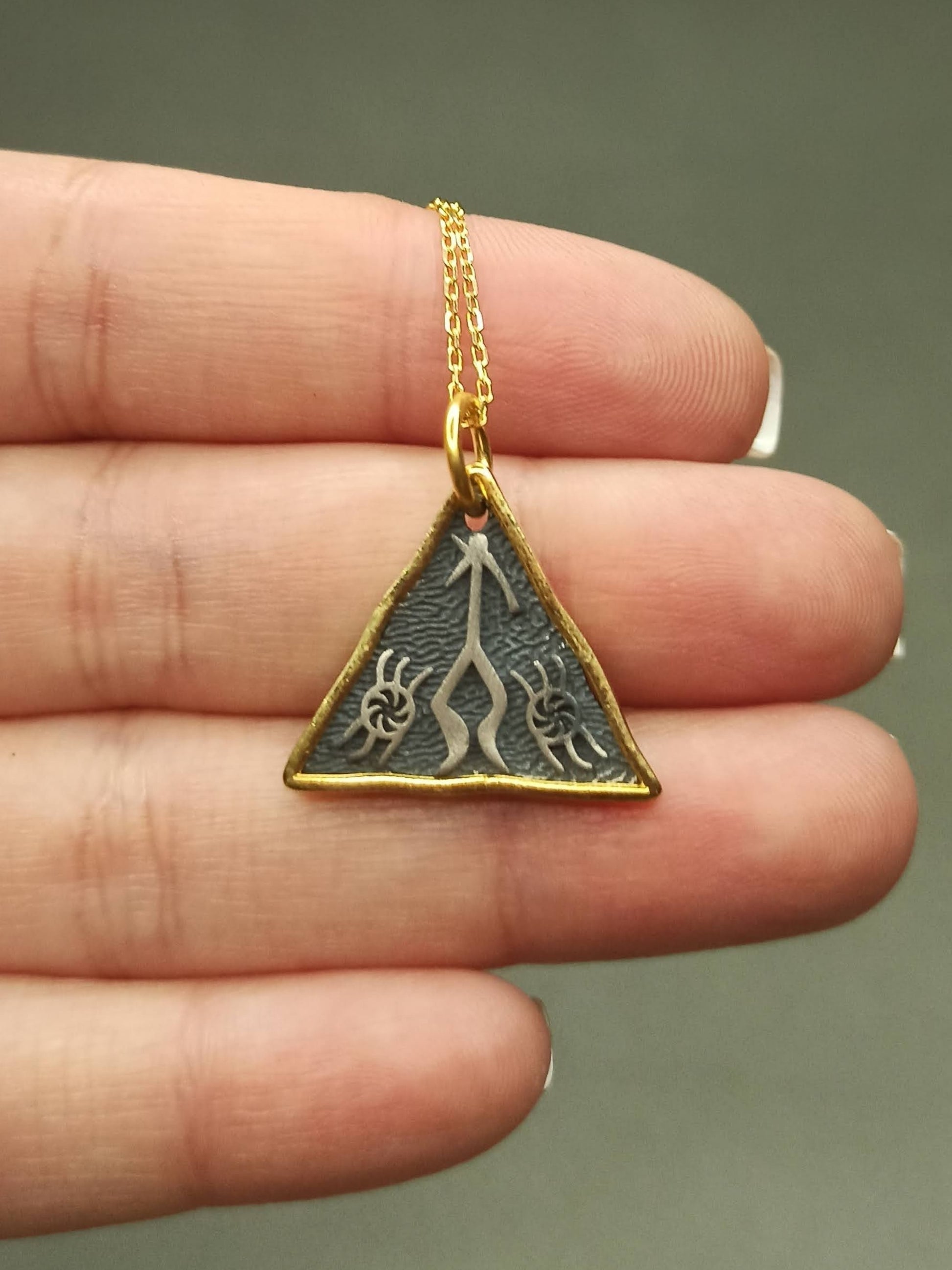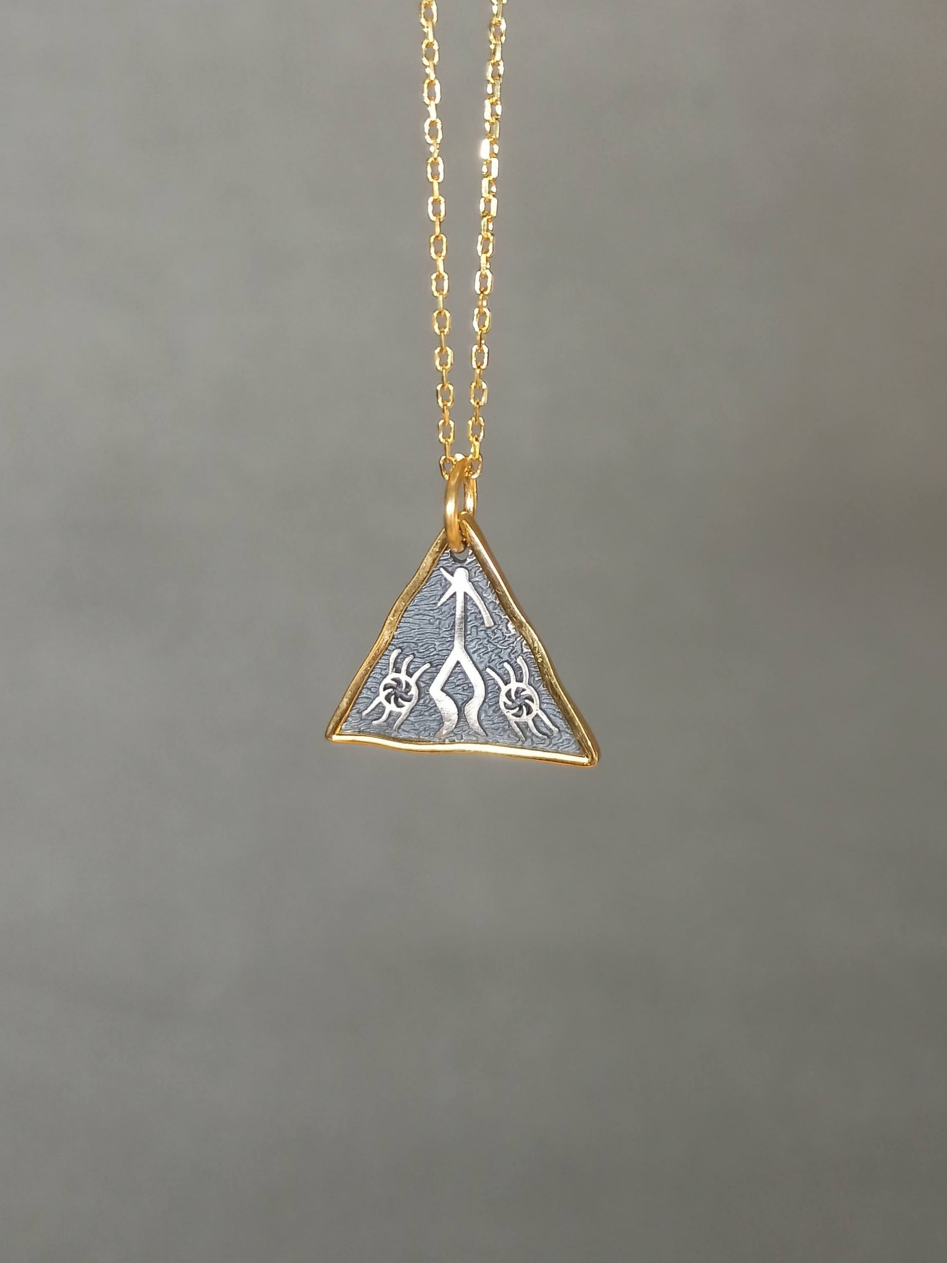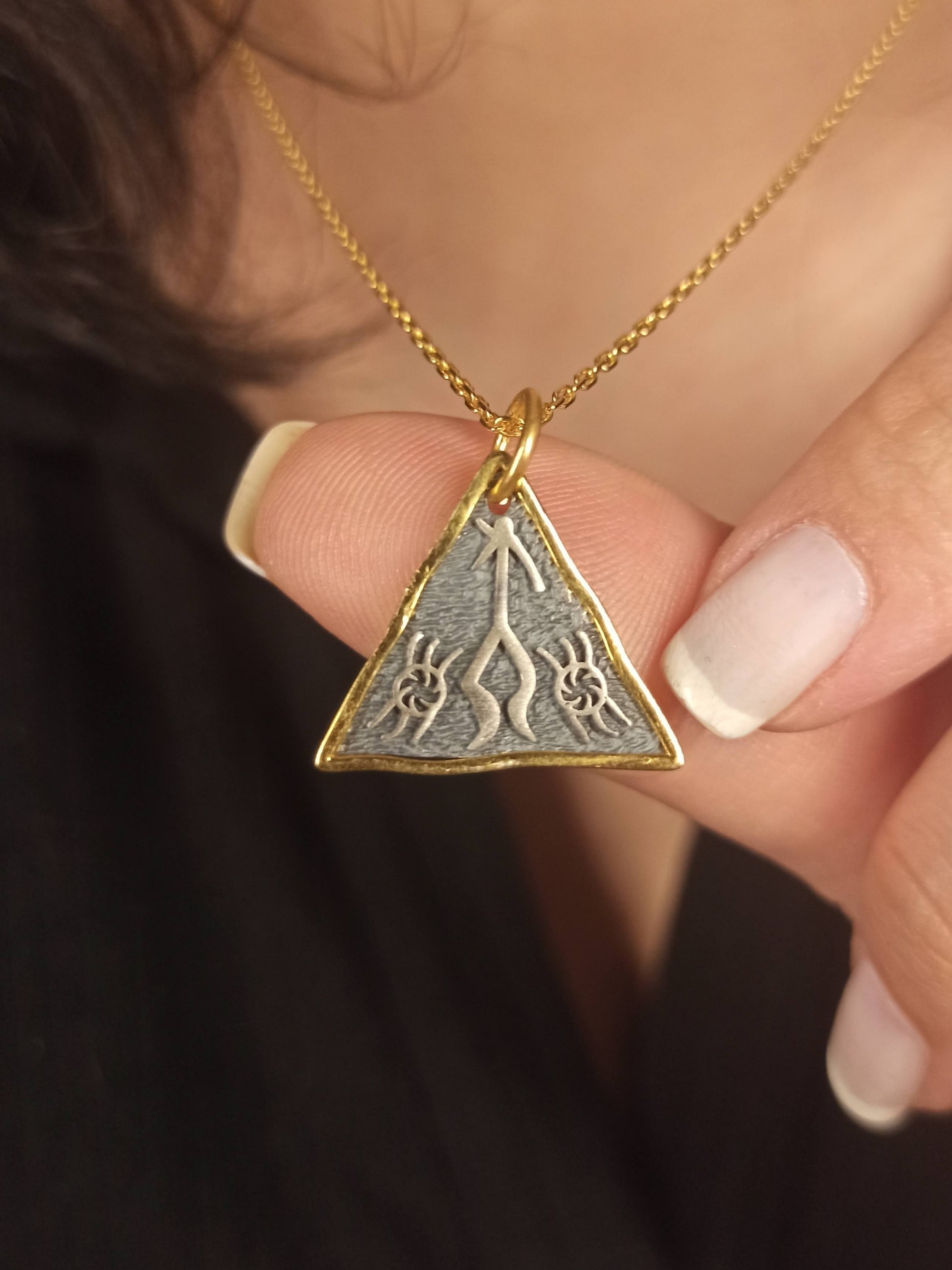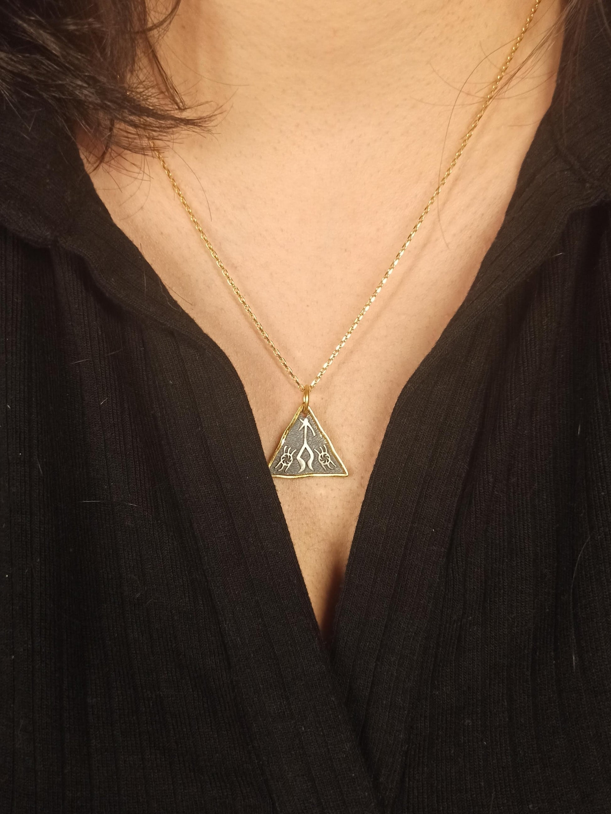 Bu üçgen sembollü antik kolye, kadim enerji dengesini temsil eden özel bir tasarımdır. Üçgen form; denge, yükseliş ve bütünlüğü simgeler.