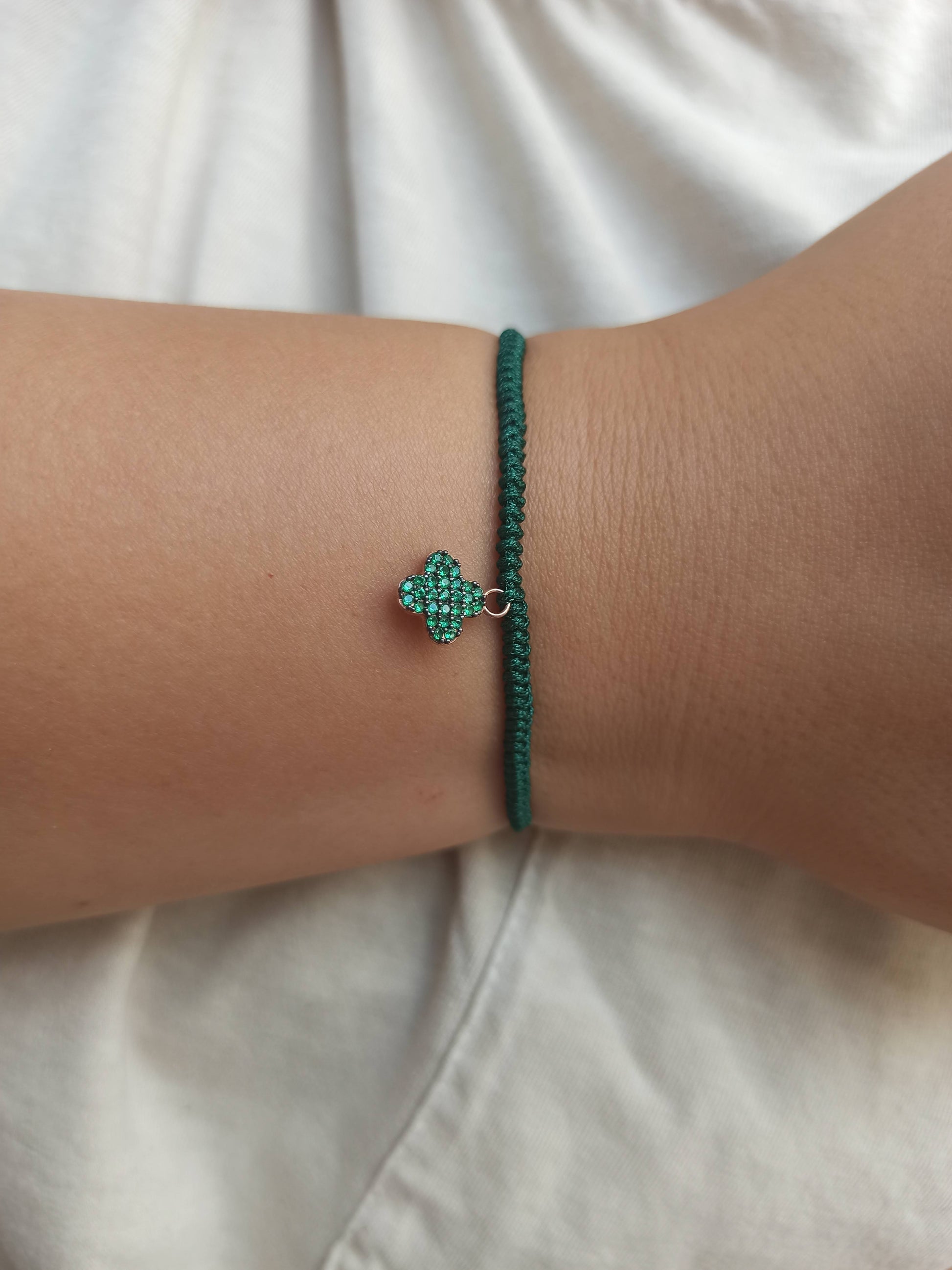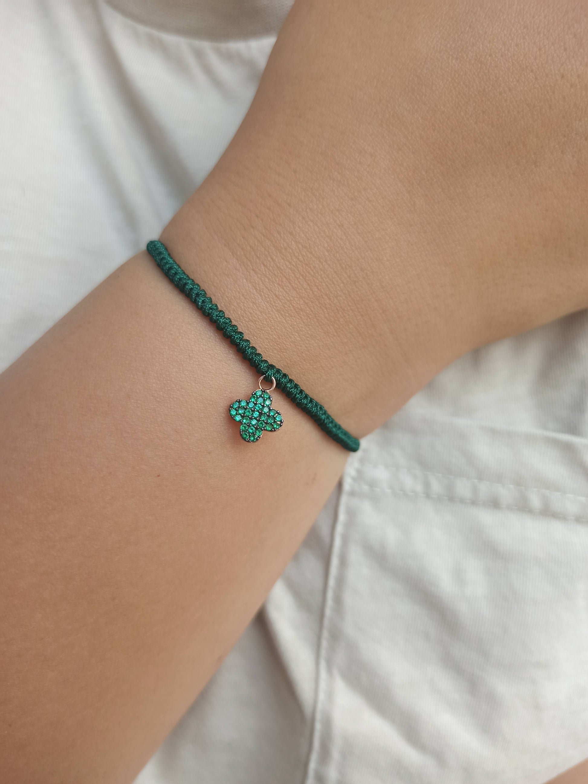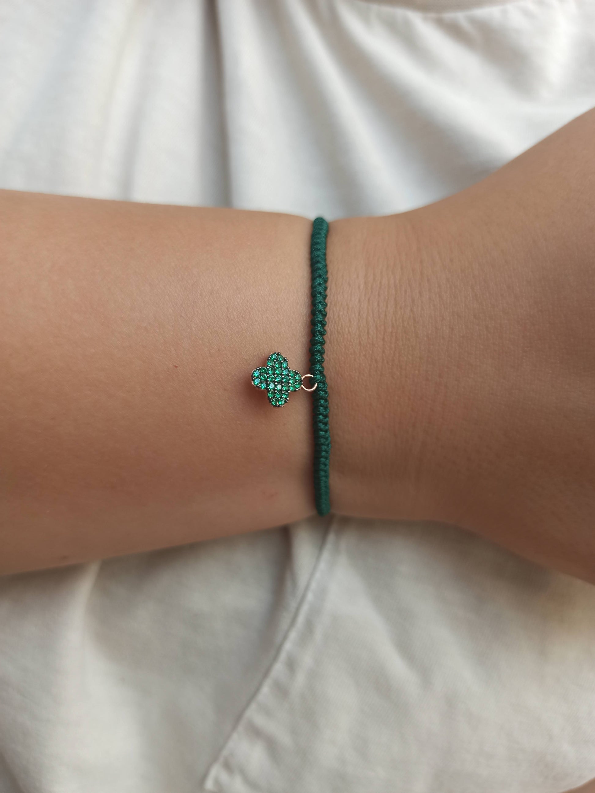 925 ayar gümüş , rose gold kaplamalı , yeşil zirkon taşlı dört yapraklı yonca charm'lı ipli bileklik.