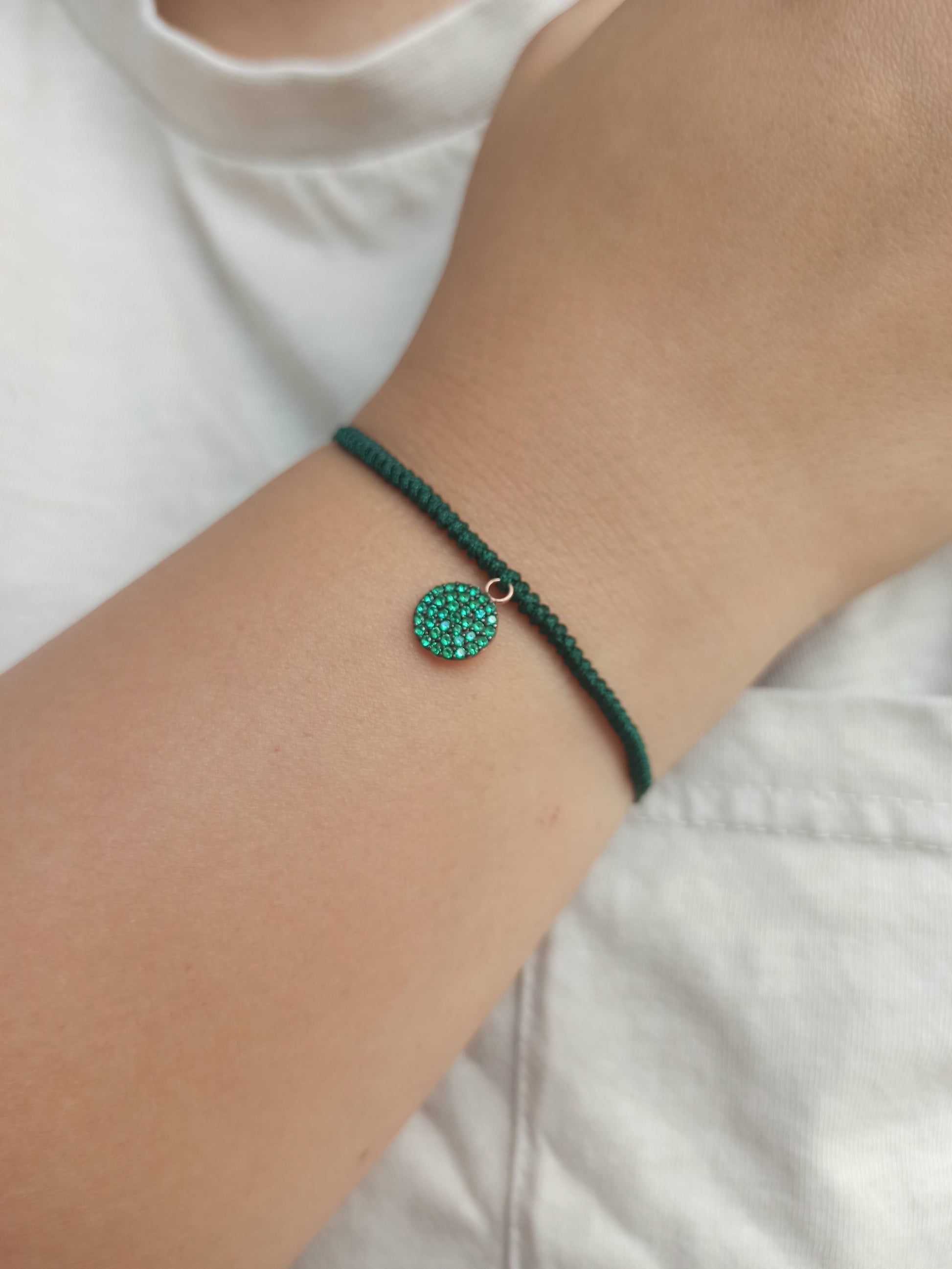 925 ayar gümüş , rose gold kaplamalı , yeşil zirkon taşlı yuvarlak charm'lı ipli bileklik.