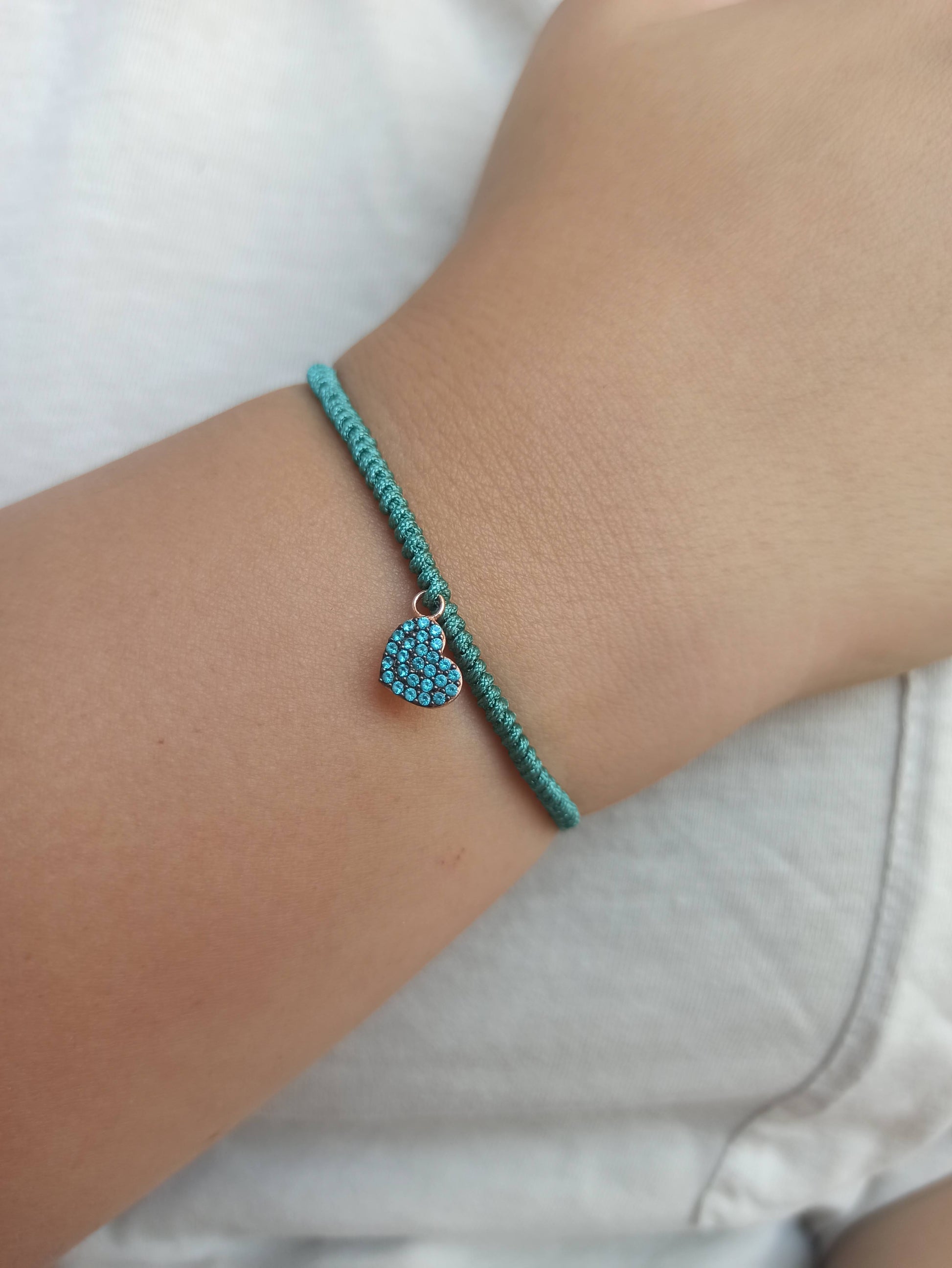925 ayar gümüş , rose gold kaplamalı , yeşil zirkon taşlı kalp charm'lı ipli bileklik.