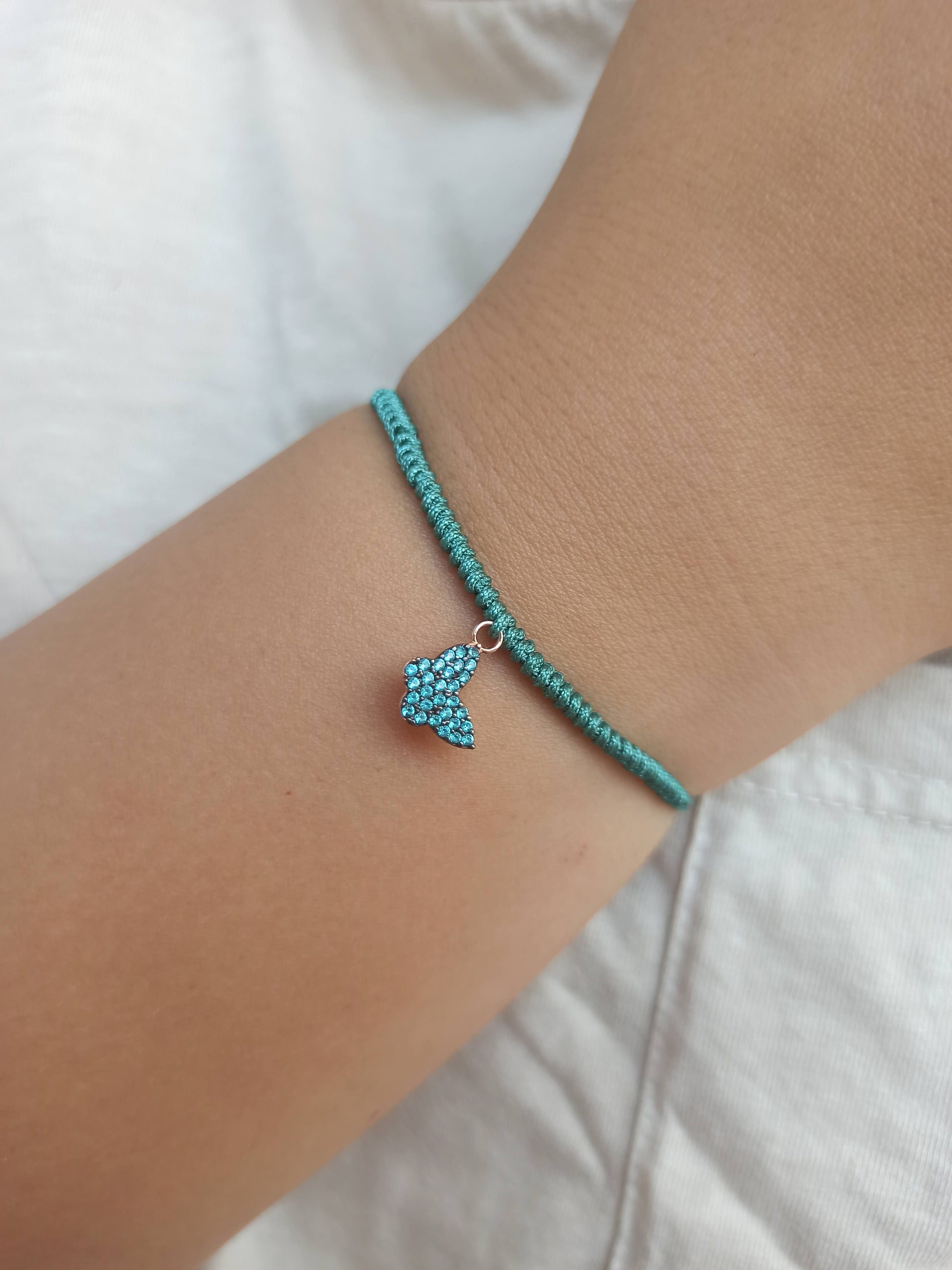 925 ayar gümüş , rose gold kaplamalı , yeşil zirkon taşlı kelebek charm'lı ipli bileklik.