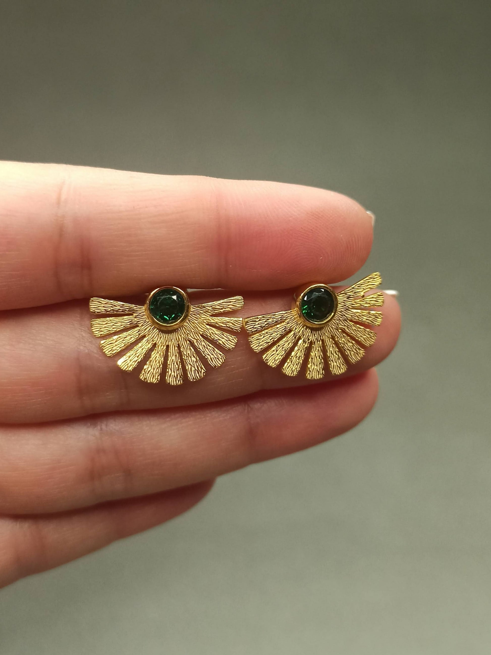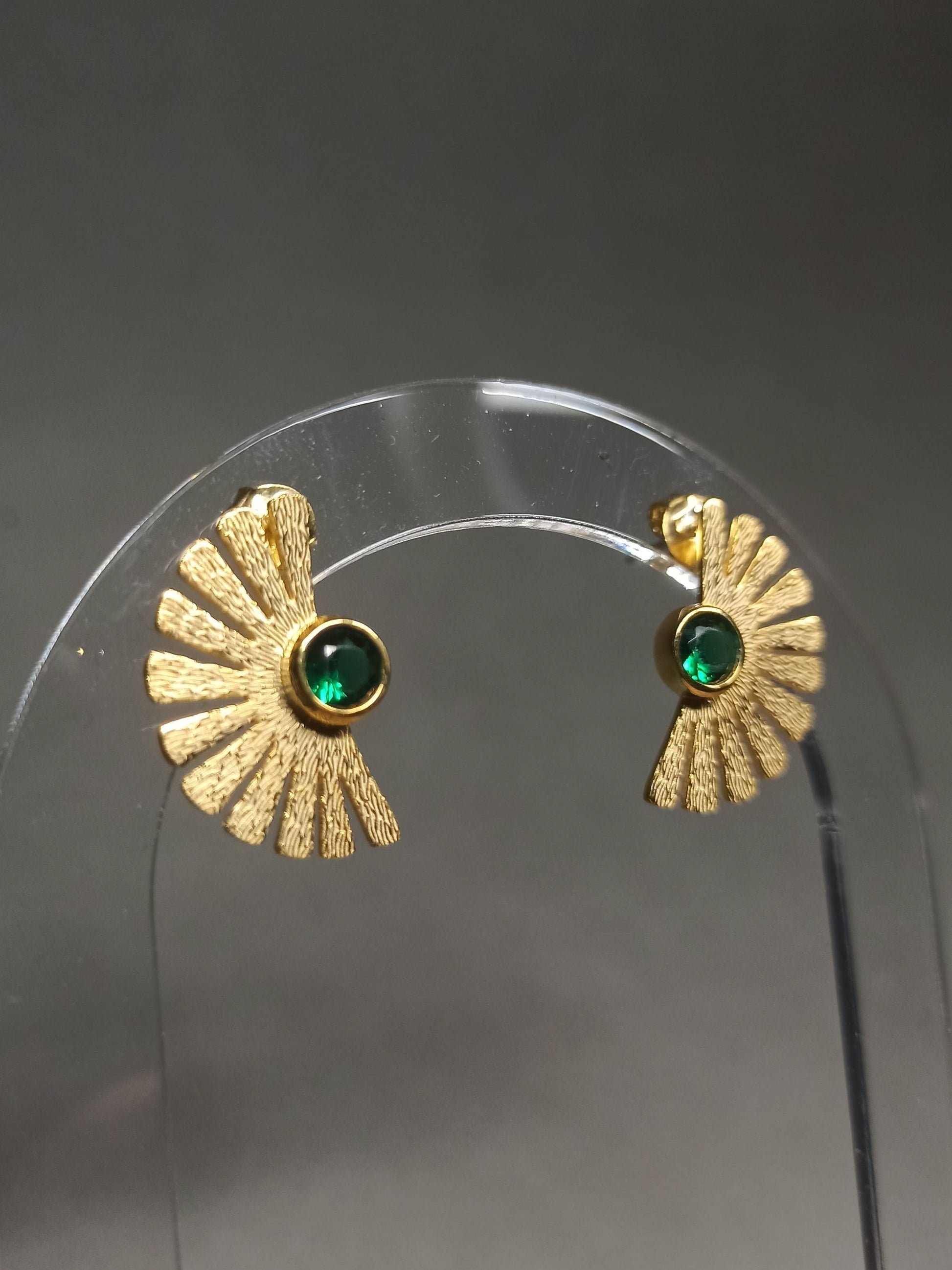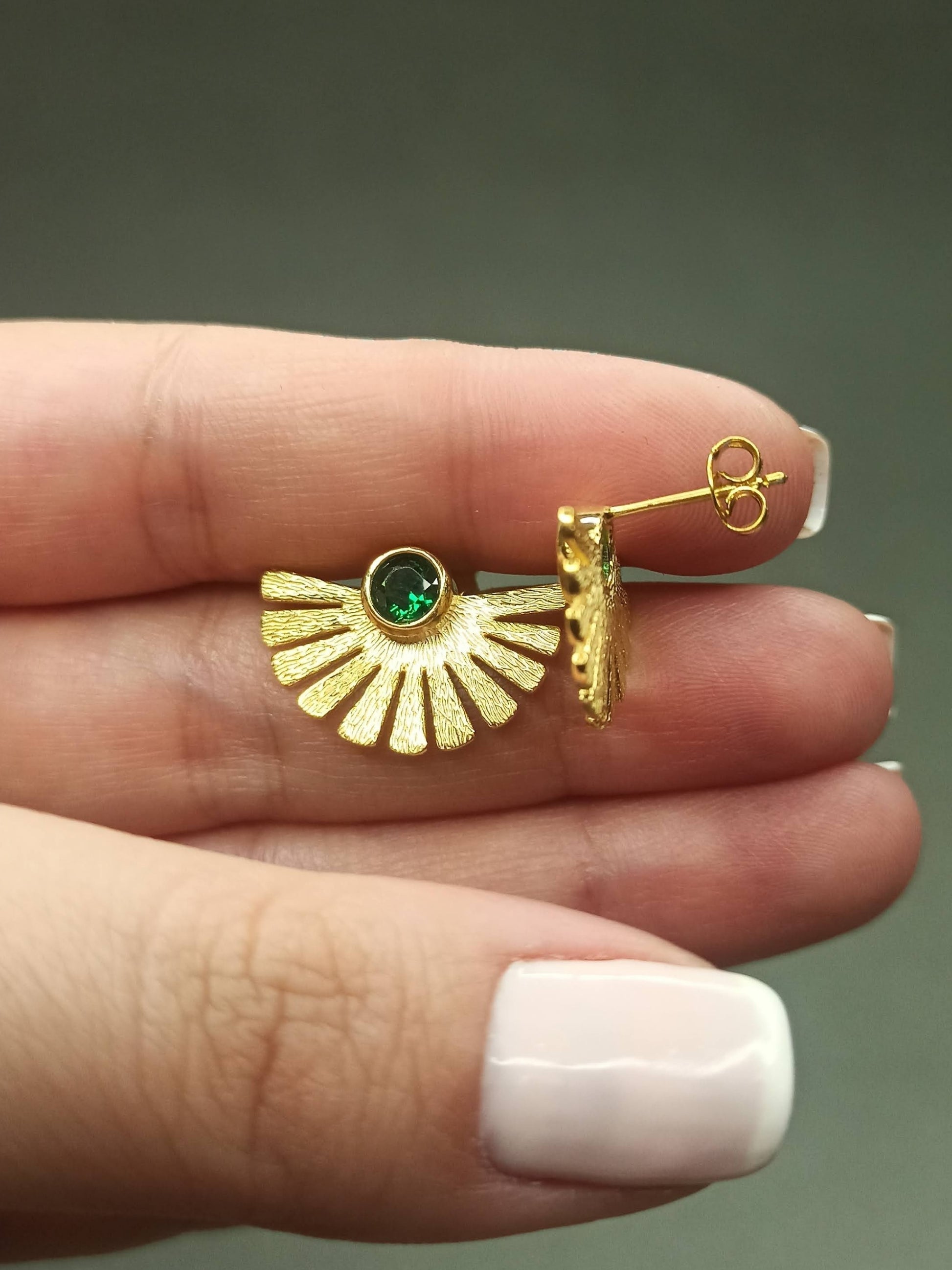 Bu yeşil taşlı altın kaplama küpe, zarif dokusu ve parlayan taş detayıyla güneşin enerjisini taşır.